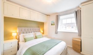 A beautifully arranged principal bedroom offering a calm and restful retreat, enhanced by soft olive green tones paired with crisp white décor. This traditional yet thoughtfully designed space maximises storage with an excellent range of integrated cabinetry, including bridging units and fitted wardrobes, as well as a double wardrobe. A charming square bay window adds character while allowing natural light to fill the room.