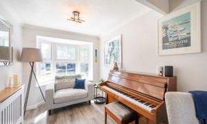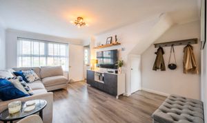 A welcoming and well-proportioned living space featuring stylish wood-effect flooring and a neutral white décor, creating a bright and versatile setting ready to personalise. An understairs cupboard provides practical storage, with additional hanging space for coats conveniently positioned by the kitchen door. A large window to the front floods the room with natural light.