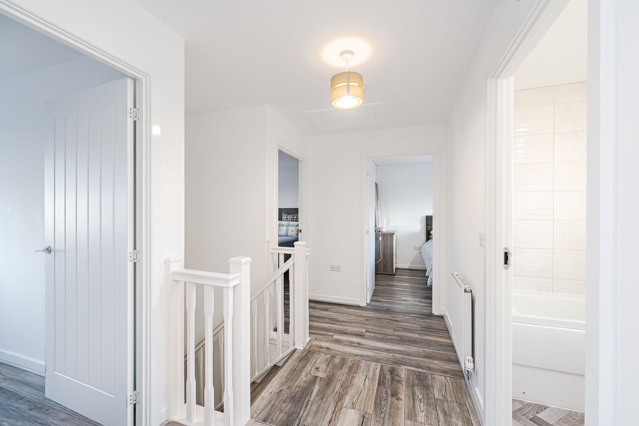 Upstairs offers four double bedrooms, including a main bedroom with en-suite and walk-in shower, alongside a family bathroom with shower over bath.