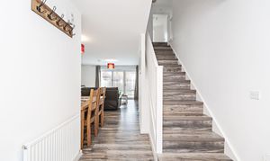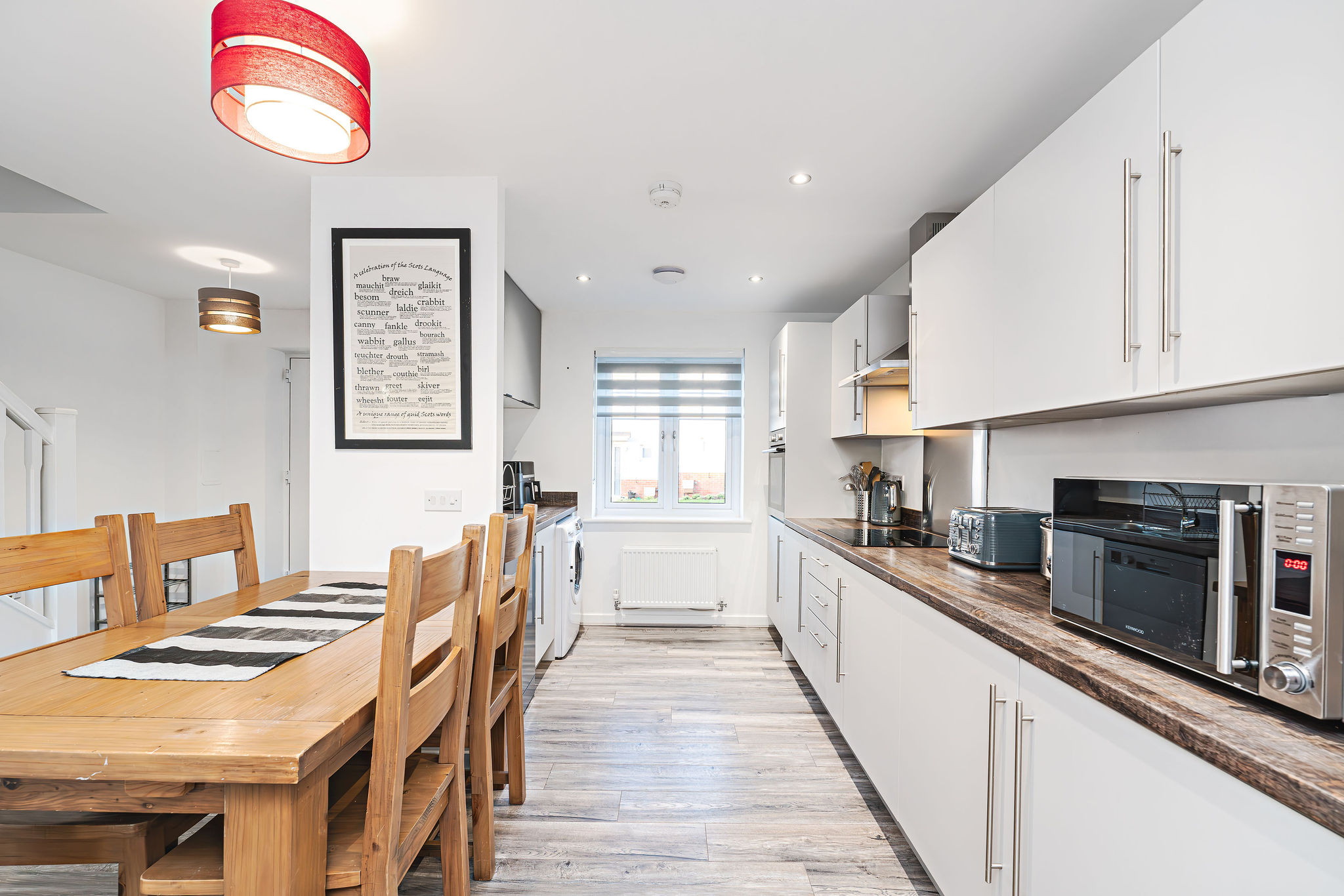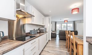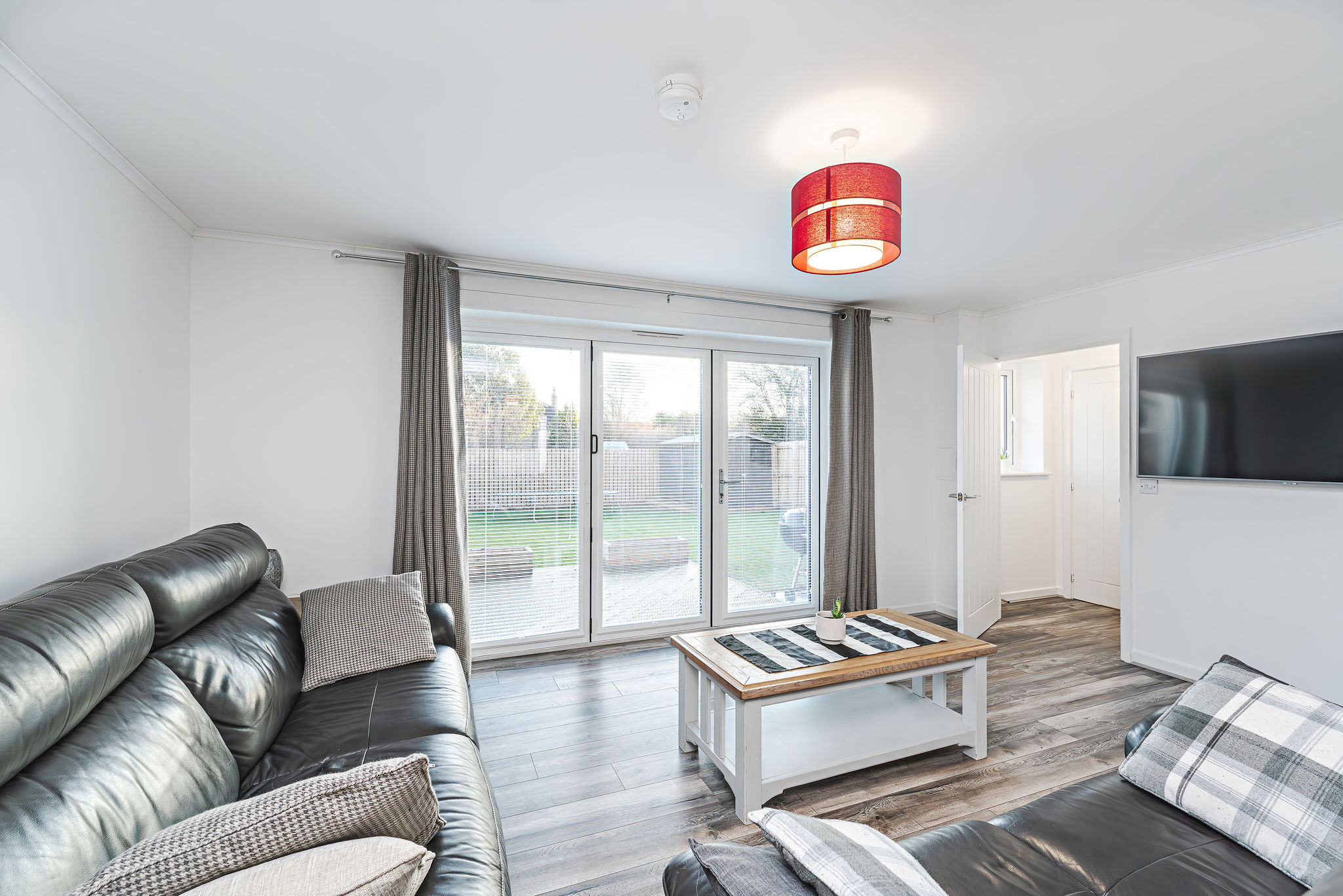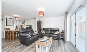 Only 3 years old, the property is offered in move-in condition and designed for modern family living, with a spacious open plan layout at its heart. The main living area combines lounge, dining and kitchen space, with triple bi-fold doors opening directly onto the rear garden. The kitchen is well equipped with integrated appliances and ample storage. A WC, utility/storage area and under-stairs cupboard complete the ground floor.