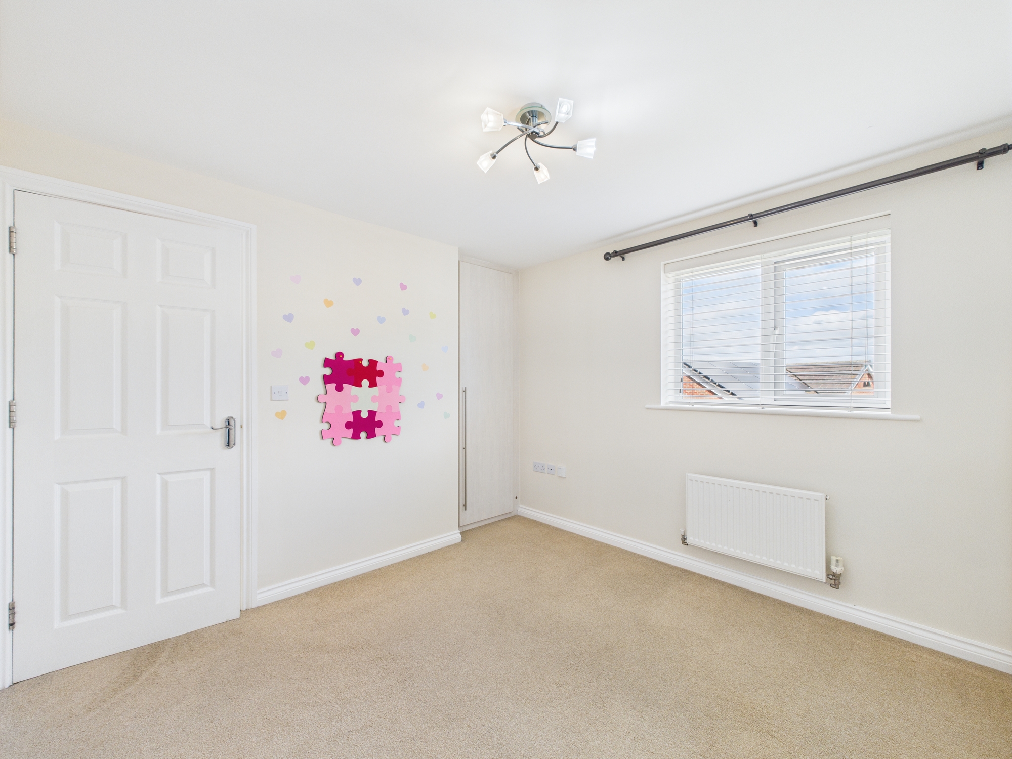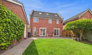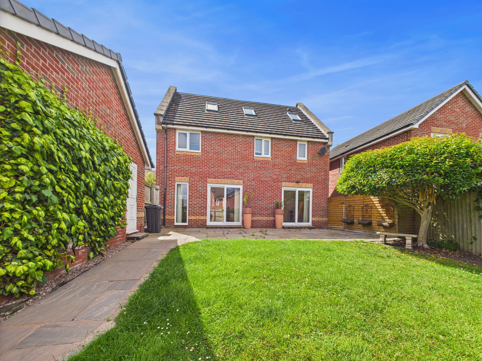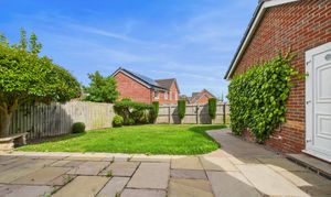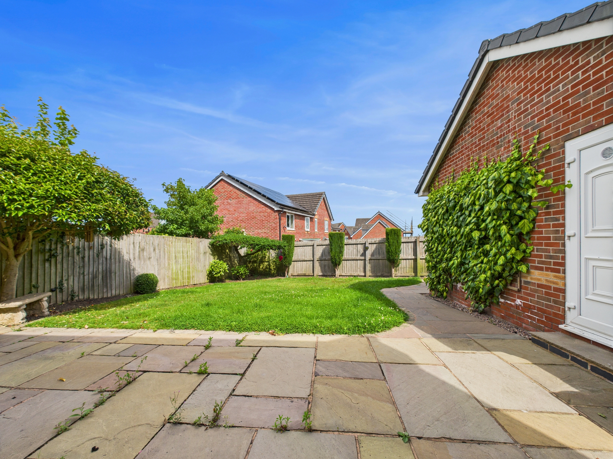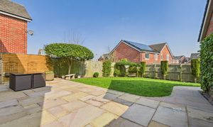This attractive modern home stands on a generous plot for the development, with excellent kerb appeal, featuring an established front garden with lawn and shrubbery. A spacious driveway provides ample off-road parking and leads to a good-sized garage with up-and-over door, power and light. The enclosed rear garden, accessed via a side gate, boasts Indian stone paving, lawn and an established curved border. A path around the back leads to a further paved seating area, all well-enclosed by fencing.