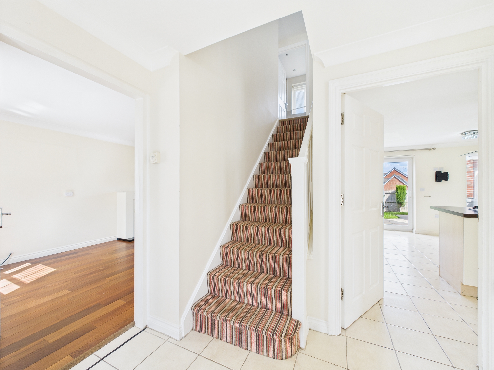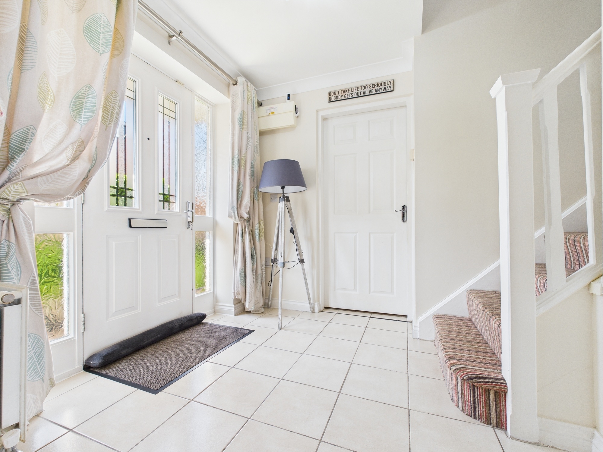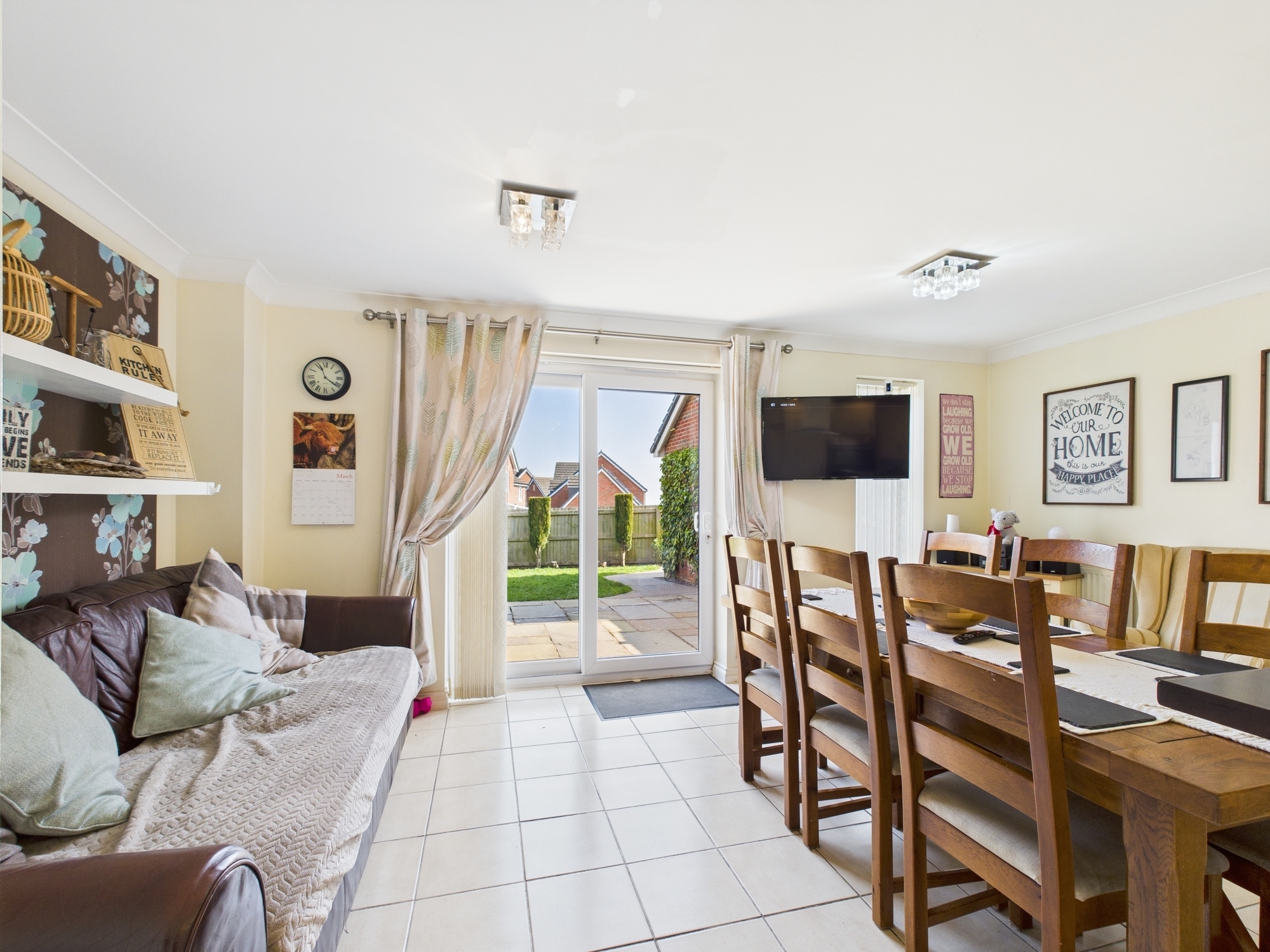 This attractive modern home stands on a generous plot for the development, with excellent kerb appeal, featuring an established front garden with lawn and shrubbery. A spacious driveway provides ample off-road parking and leads to a good-sized garage with up-and-over door, power and light. The enclosed rear garden, accessed via a side gate, boasts Indian stone paving, lawn and an established curved border. A path around the back leads to a further paved seating area, all well-enclosed by fencing.