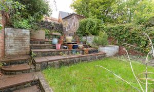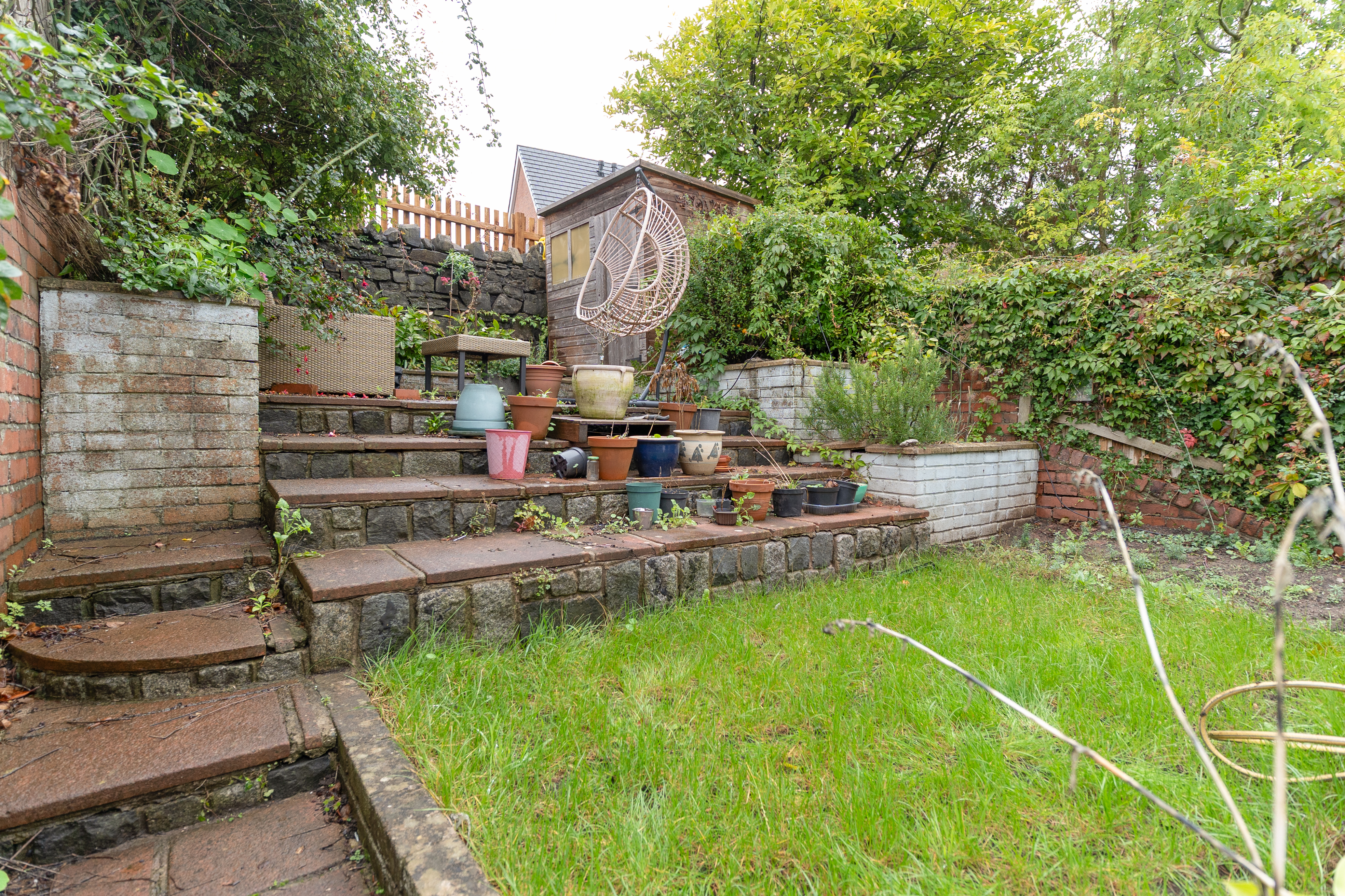 Externally, the property features an enclosed rear garden designed for both practicality and relaxation. A paved area offers space for outdoor seating and dining, with steps leading up to a lawn and a second seating area, creating a private and versatile outdoor retreat.