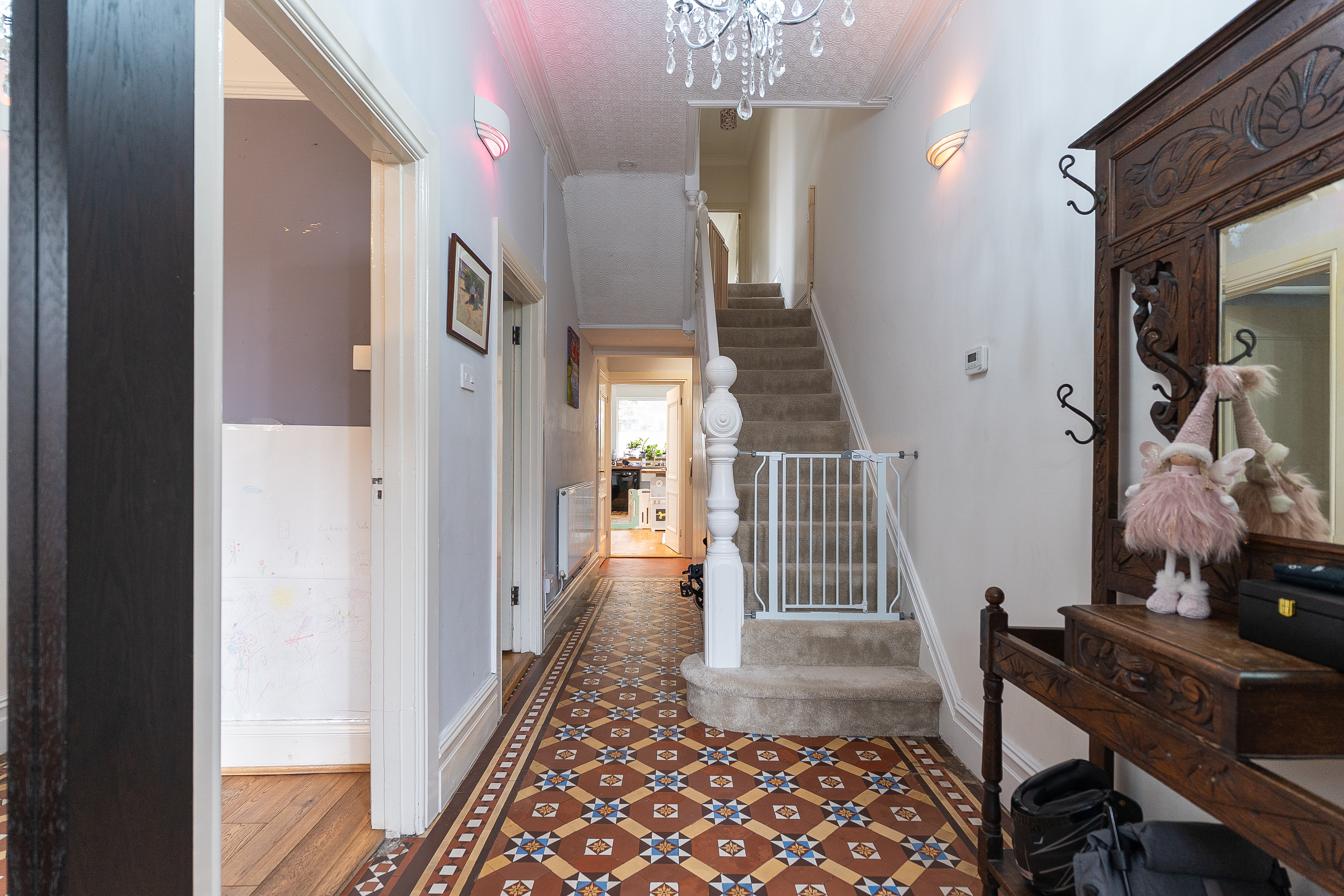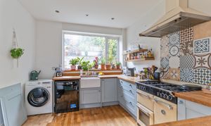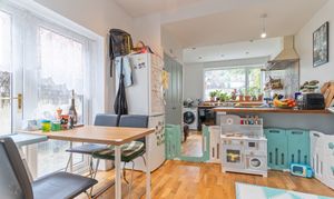 On the ground floor, you are welcomed by a spacious hallway with charming original tiled flooring and a staircase leading to the first floor. To the left, two generous reception rooms enjoy tall ceilings and excellent natural light, offering versatile living and dining space. To the rear of the property, there is a convenient cloakroom and access through to the open plan kitchen/breakfast room. This bright and contemporary space is fitted with a large, modern kitchen and provides direct access out to the garden, making it an ideal hub for family life and entertaining.