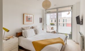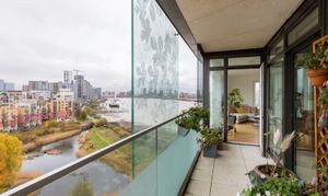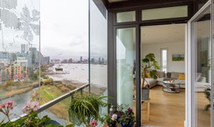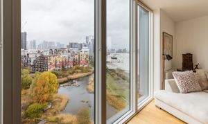 Set on the ninth floor, this bright and modern flat feels calm and quiet. The open-plan living space is beautifully fluid, with a layout that lets you move easily through the home. Floor-to-ceiling windows draw the eye out to the city and river beyond, while a streamlined kitchen sits neatly in the background — polished and practical. The generous, semi-enclosed balcony seamlessly opens up the flat, blurring the line between inside and out.
