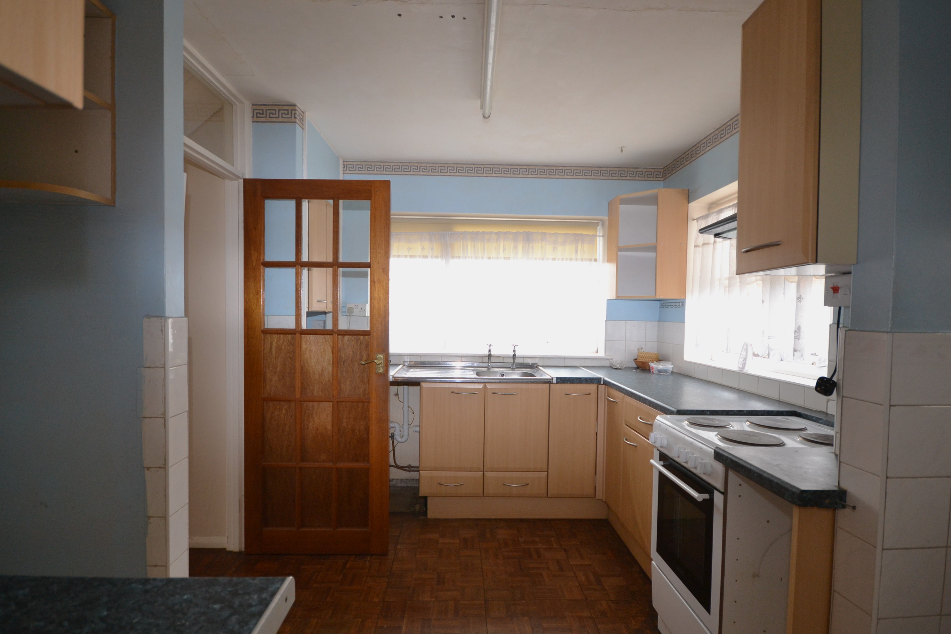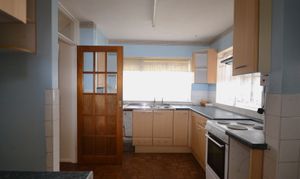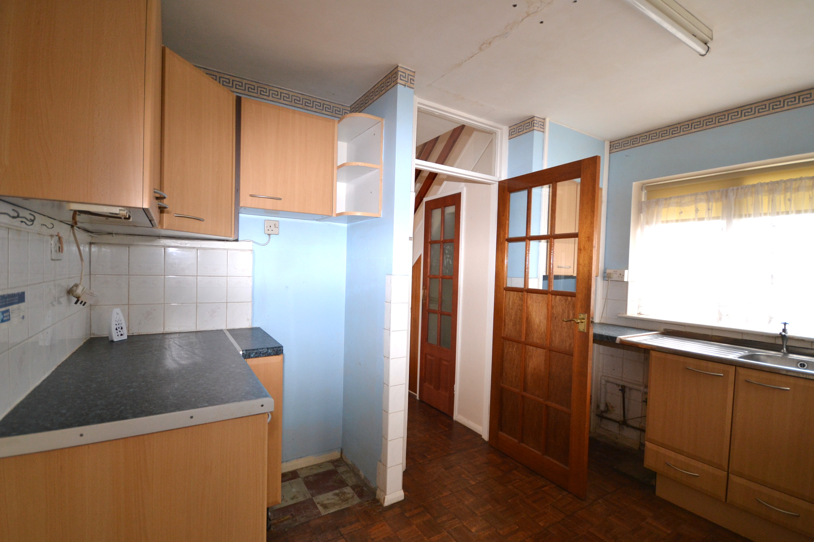 Spacious kitchen with views over the garden in need of updating.