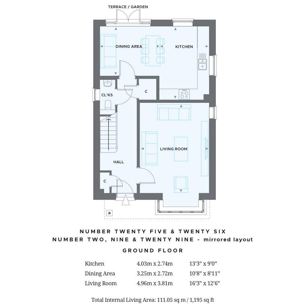 A detached 3 bedroom house of 1195 ft.²/111.05 m² thoughtfully designed for modern living to include a spacious entrance hall with cloakroom, a double aspect living room and a family sized kitchen/dining room with doors out to the rear garden. On the first floor, there is a substantial master bedroom with en-suite shower room, 2 further double bedrooms and a family bathroom.
