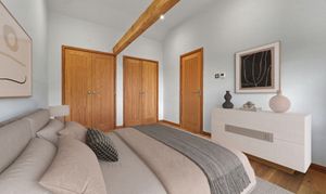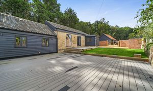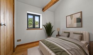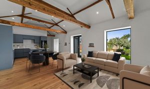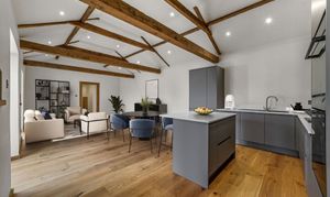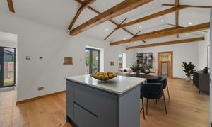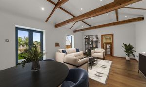 Inside, the property continues to impress. The accommodation has been thoughtfully arranged, with an emphasis on space, light, and flow. A welcoming hall leads to the heart of the home: a striking open-plan kitchen, dining, and living space designed for both entertaining and everyday living. Exposed beams, tactile finishes, and carefully selected materials create a sense of authenticity, while full-height glazing and French doors establish a seamless connection to the terrace and garden. The kitchen is fitted with contemporary cabinetry, luxurious work surfaces, and integrated appliances, complemented by a sociable breakfast bar and ample dining space. The adjoining living area is both bright and versatile, offering room to relax and unwind in a setting that is rich in character yet undeniably modern.