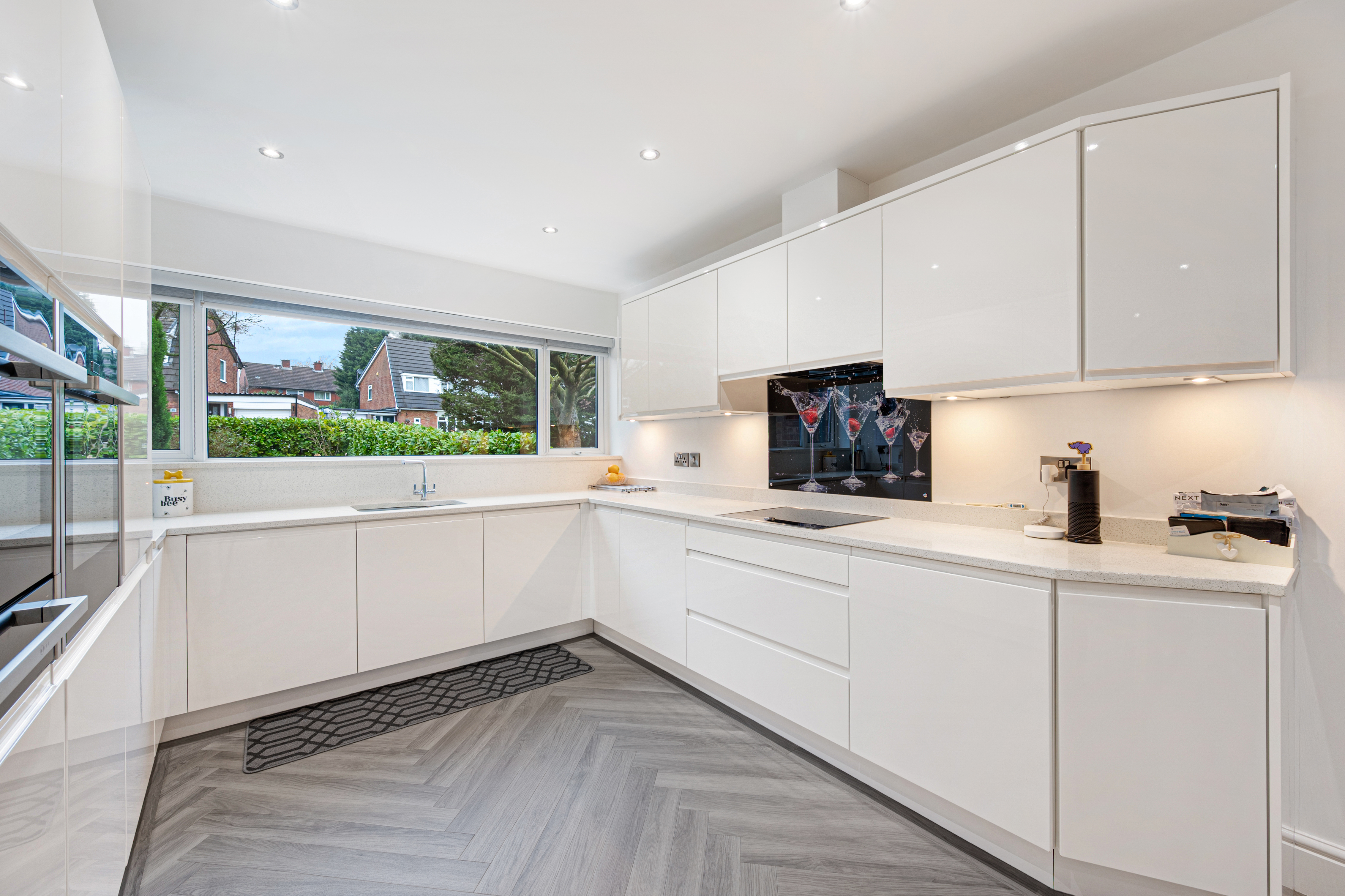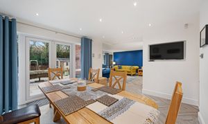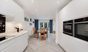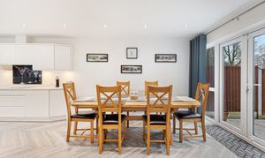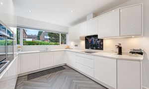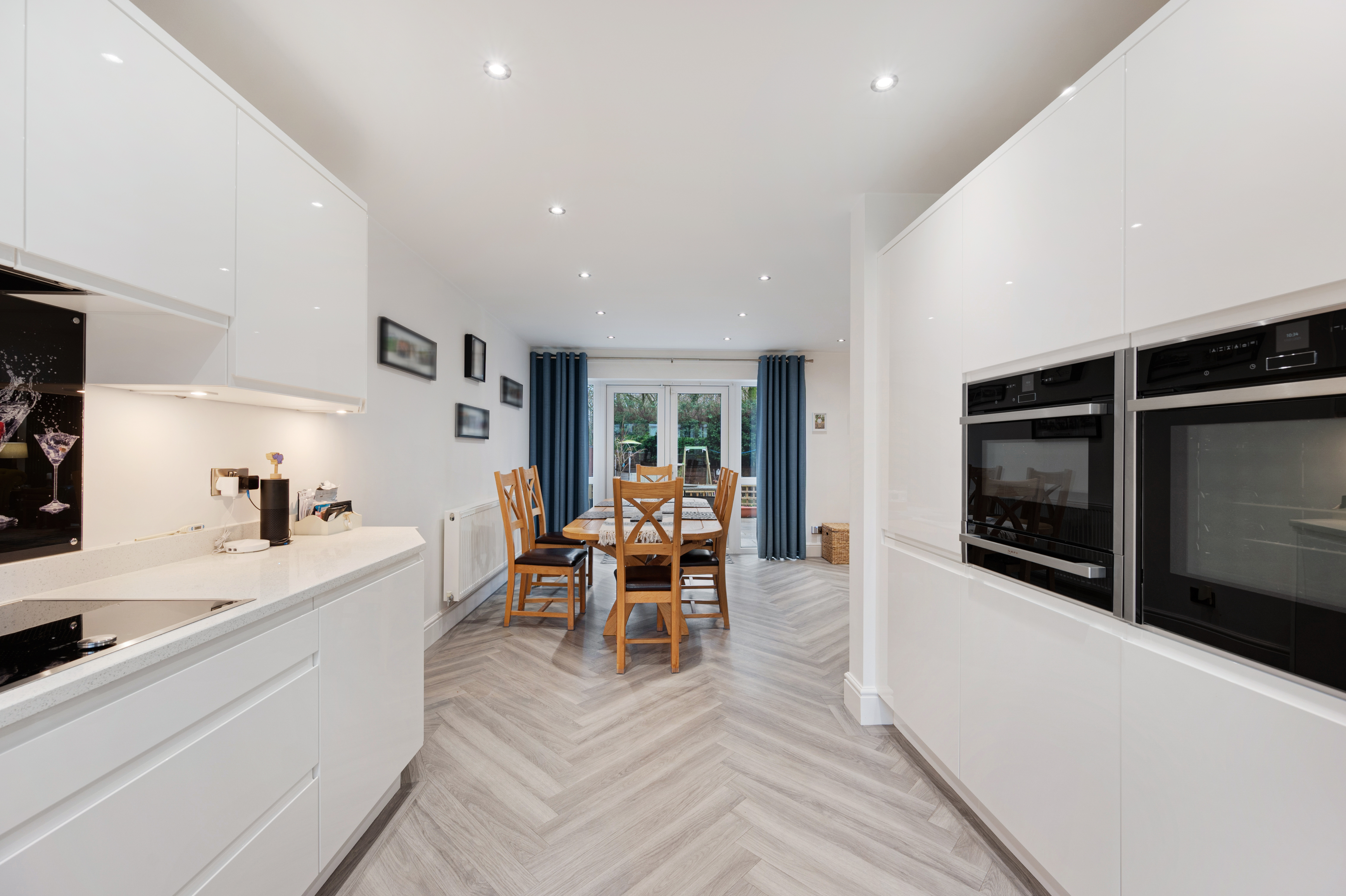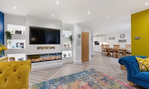 Perfectly positioned on a quiet road, the property offers an abundance of living space consisting of an entrance hall, downstairs guest w/c and impressive open-plan kitchen / dining / living room. The stylish white gloss kitchen comes complete with integrated Neff appliances and french doors lead from the generous dining area to the private, enclosed rear garden. The living area exudes elegance and style with a fabulous media wall complete with feature electric fire. This fabulous rear extension is the heart of the home, designed for modern living, with plenty of room for family meals and entertaining. The converted garage offers an additional, versatile reception room and completes the ground floor accommodation.
