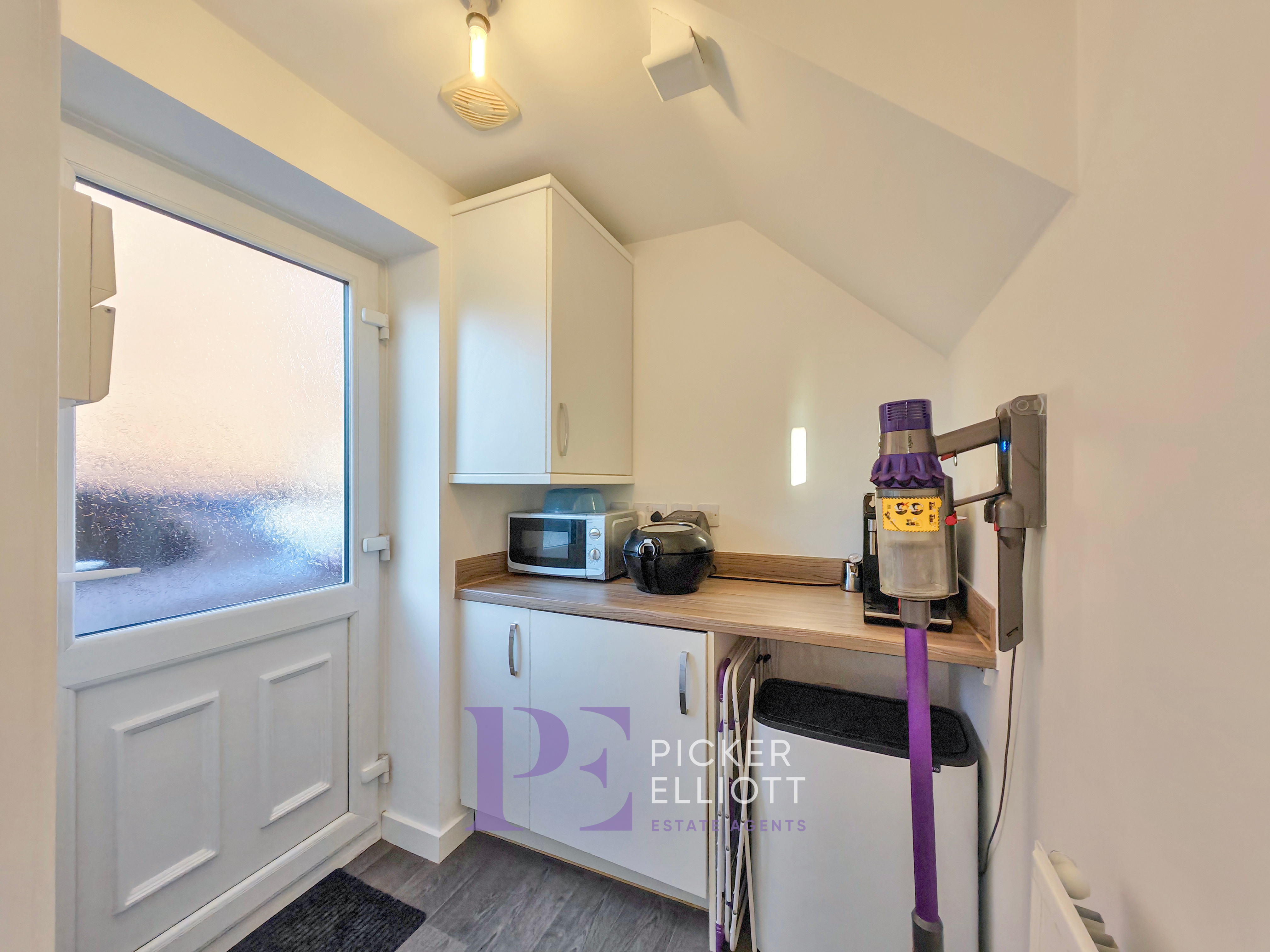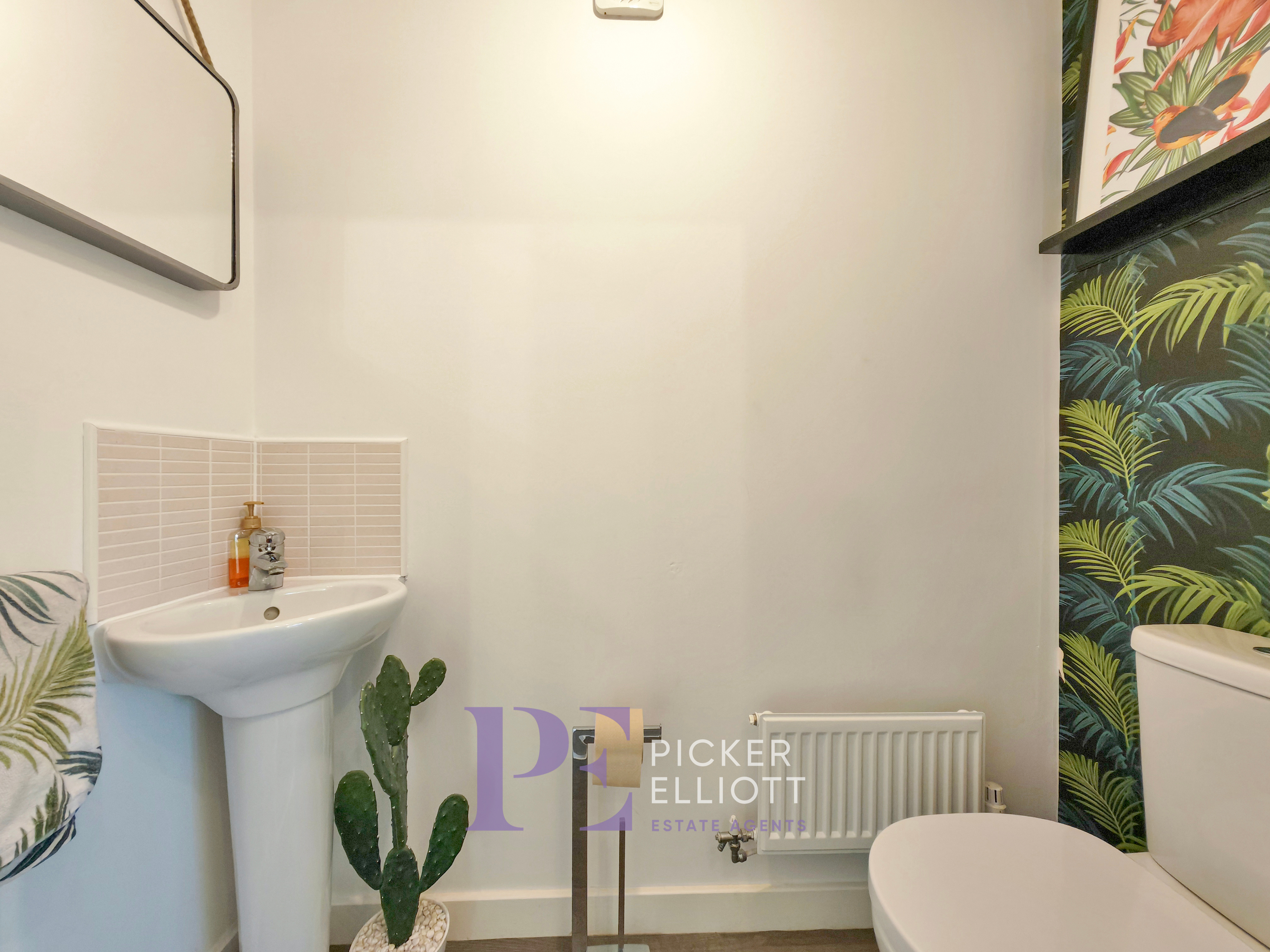 The heart of the home is the rear breakfast kitchen and dining room, which spans the full width of the house to create a superb family hub. The kitchen is well-appointed with a range of units, contrasting work surfaces, and an integral breakfast bar, complete with a gas hob, electric fan-assisted oven, and fitted dishwasher. The adjoining dining area is filled with natural light from large patio doors. Completing the ground floor are a convenient guest cloakroom and a practical utility room, which provides plumbing for a washing machine and direct access to the driveway.