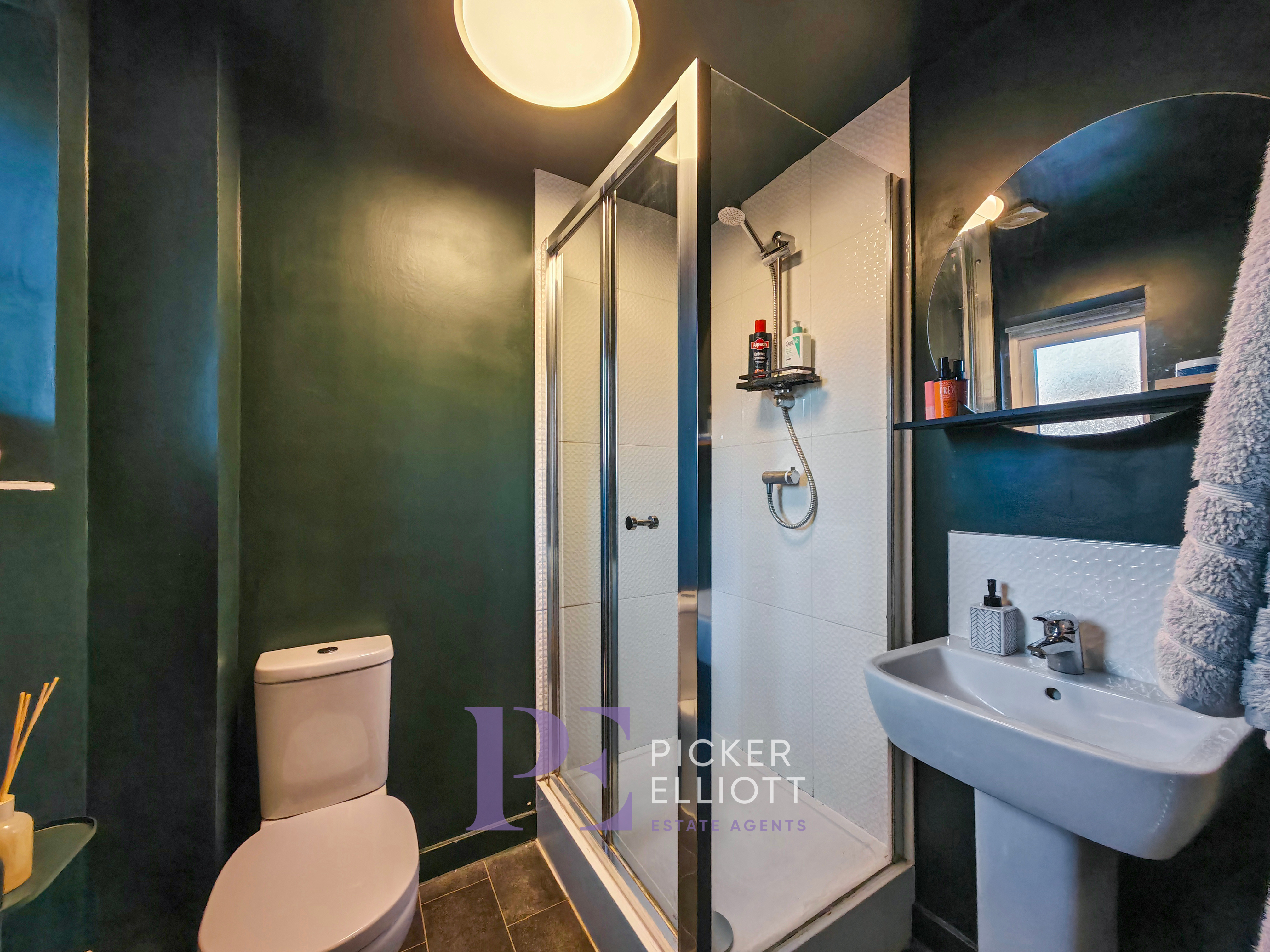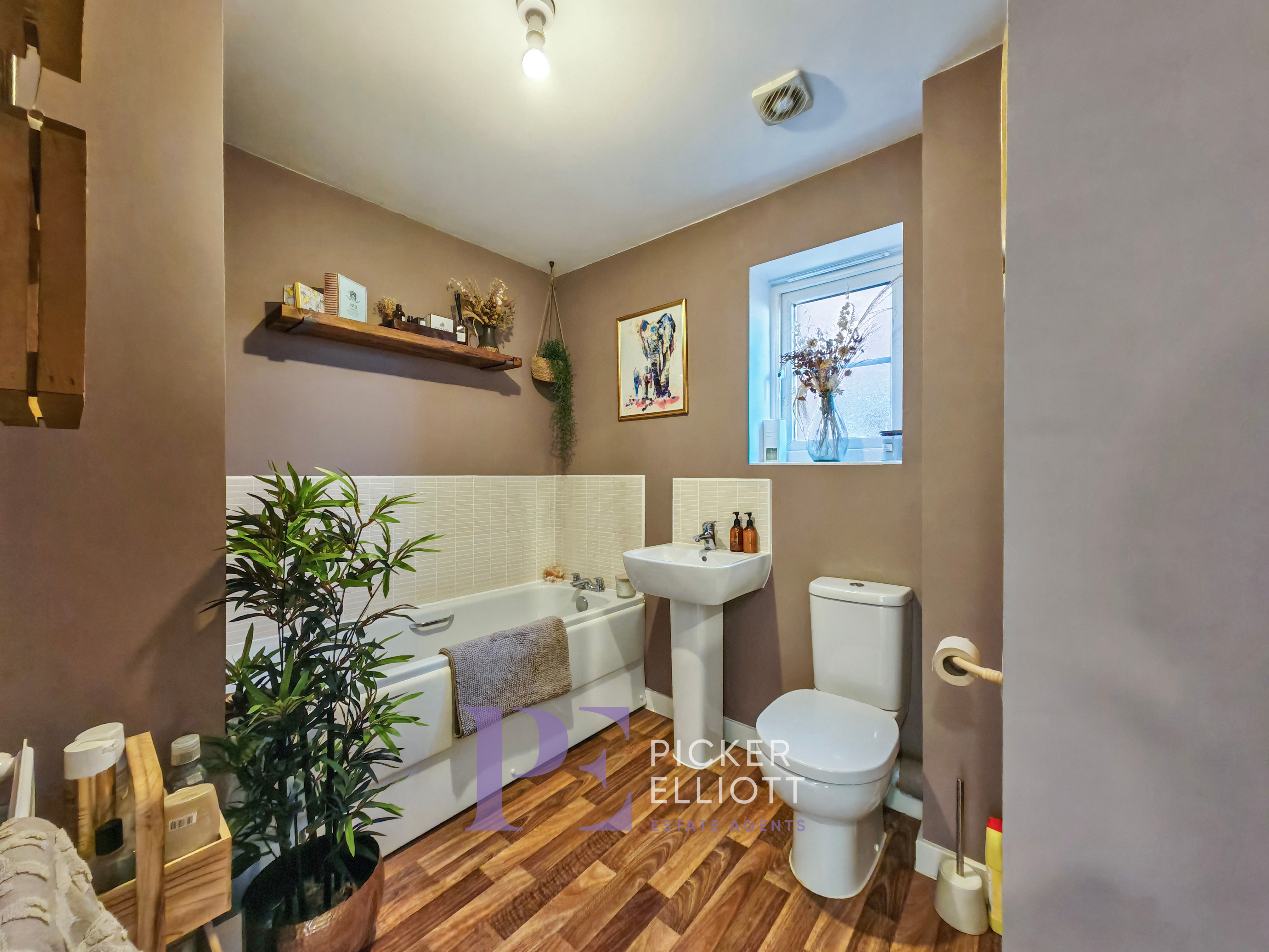 On the first floor, a naturally bright landing with storage leads to three well-proportioned bedrooms. Bedroom one is a spacious double featuring a modern en suite shower room with a chrome mixer shower. Bedroom two overlooks the rear garden and benefits from a fitted double wardrobe, while bedroom three is a versatile room perfect for a child’s bedroom or home office. These are served by a modern family bathroom fitted with a clean white suite and a panel bath.