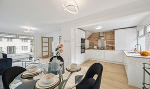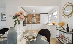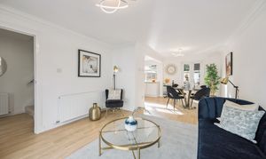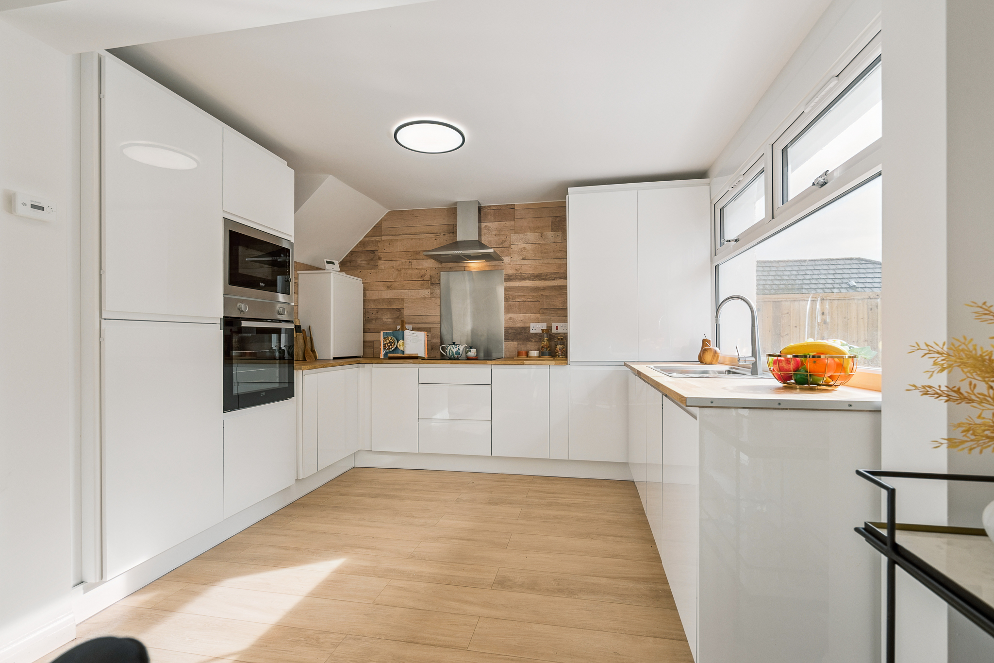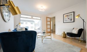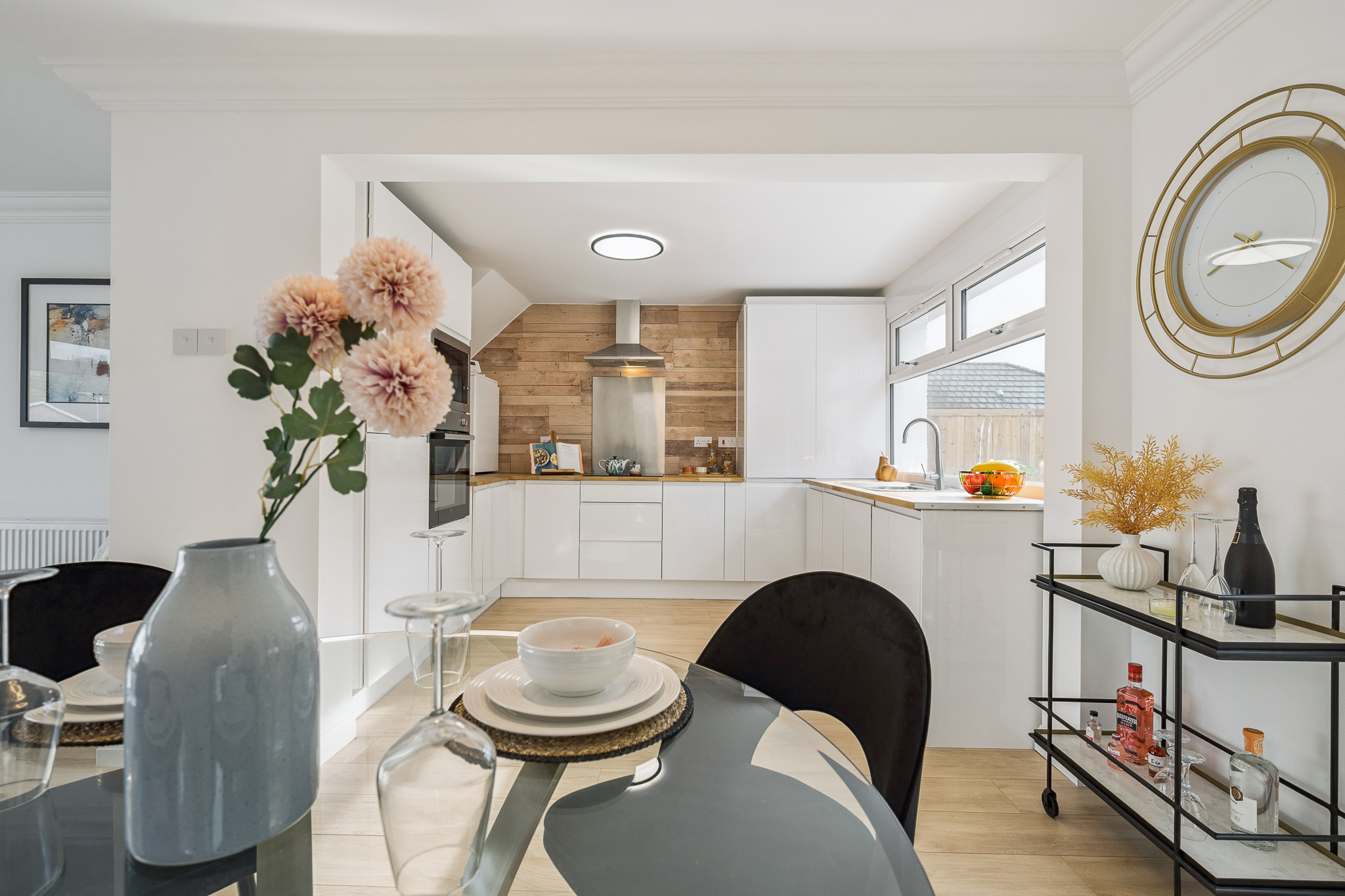 Upon entering, a bright and welcoming hallway leads to the upper landing, with fresh new carpets and access to a convenient downstairs WC. The quality flooring flows seamlessly through to the open-plan lounge, dining area, and kitchen. The lounge is flooded with natural light via a striking floor-to-ceiling double-glazed window, while steps lead to the formal dining space. From here, French doors open onto a decked terrace, perfectly positioned to enjoy the privacy of the landscaped rear garden.