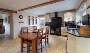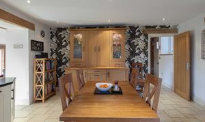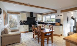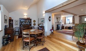 Underfloor heating runs throughout the house, with engineered oak and tiled floors complementing the natural textures of the exposed beams and stonework. The ground floor has been thoughtfully arranged to create an easy flow between the main living spaces. Anchored by a stone fireplace, the spacious living room transitions into a well-proportioned dining area, which enjoys garden views through large windows.