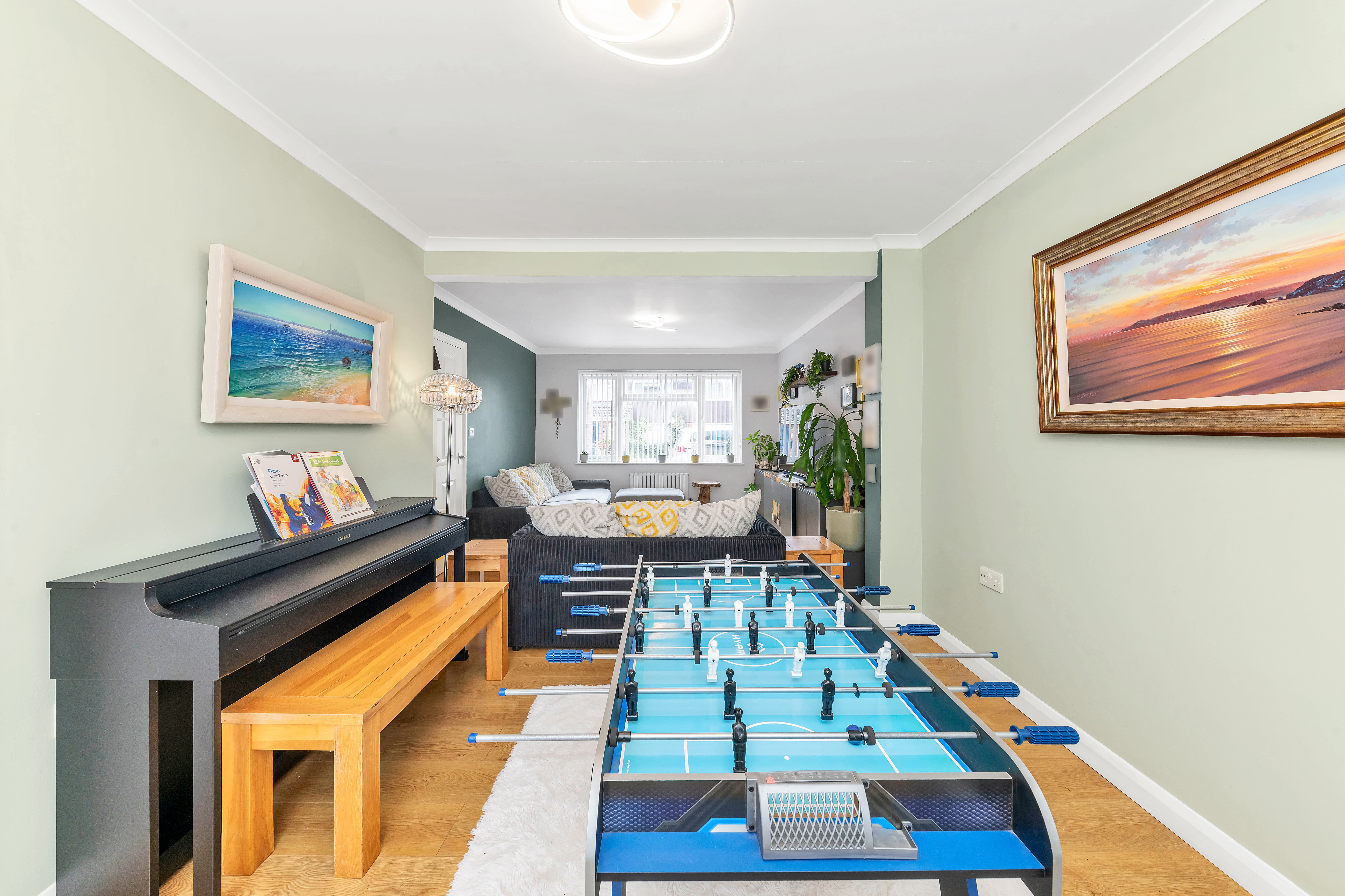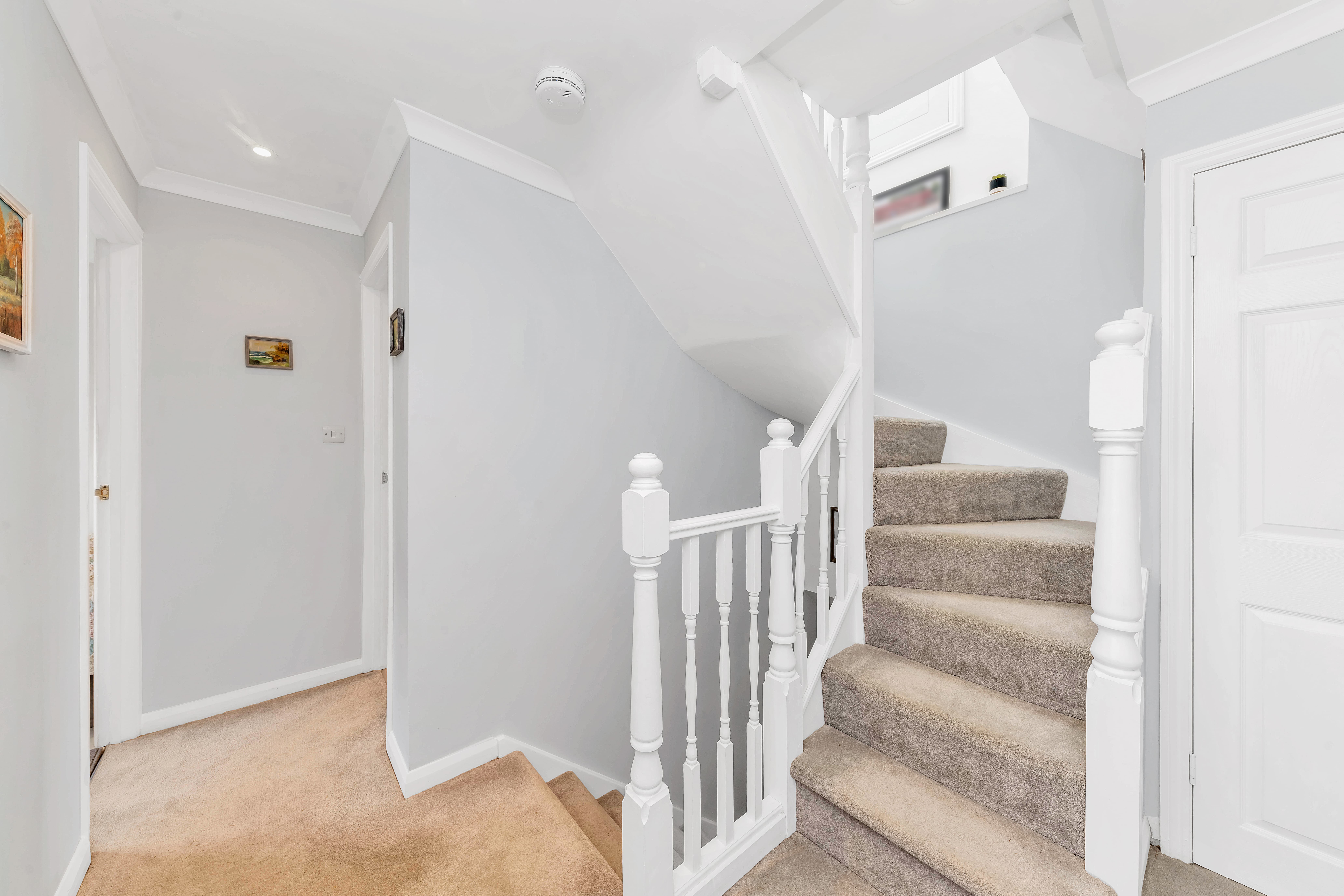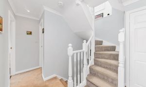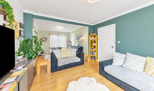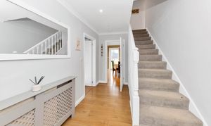 This well-presented property enjoys a pleasant and tidy frontage, with a front borders of decorative stones, space for potted plants, and off-road parking for multiple vehicles. Upon stepping inside, the entrance hallway is wide, welcoming and beautifully presented, alluding to the high standard seen throughout. It provides storage for coats and shoes, attractive wood flooring, inset lighting, room for furniture, stairs to the first floor, and access through to the downstairs living space, including a cloakroom WC.