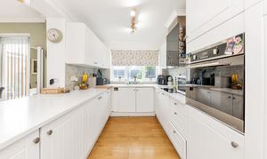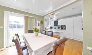 The kitchen/dining room is wonderfully open-plan and is the heart of this lovely home, enjoying a range of modern base and wall units, composite worktops, undermount sink with boiling/hot tap, a breakfast bar, wood flooring, tiled splashbacks, neutral decor, access to the garage, an integrated oven, induction hob, extractor, and space for a dining setting and other small kitchen appliances.