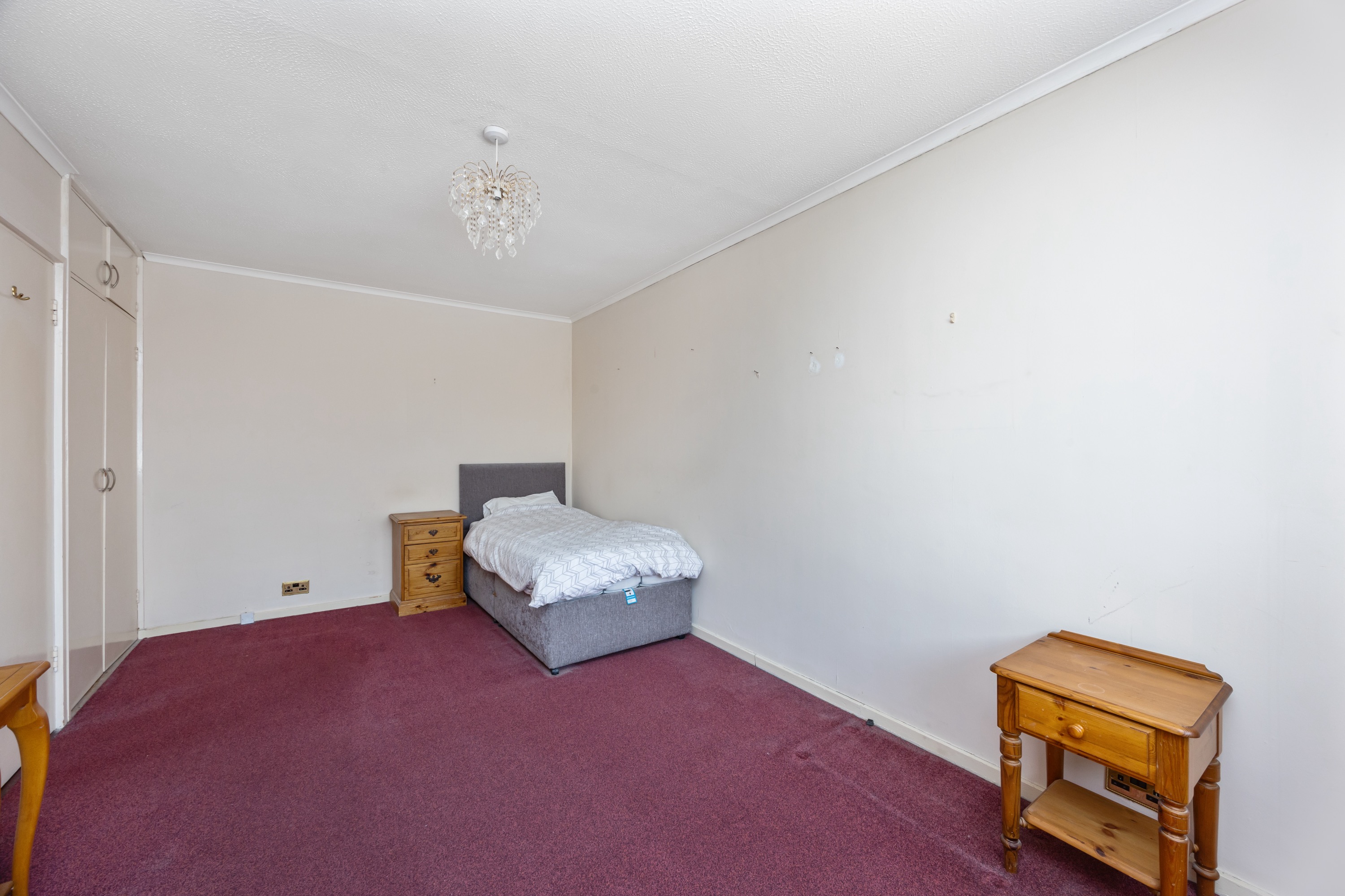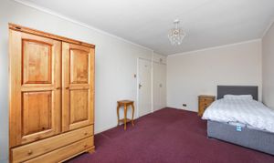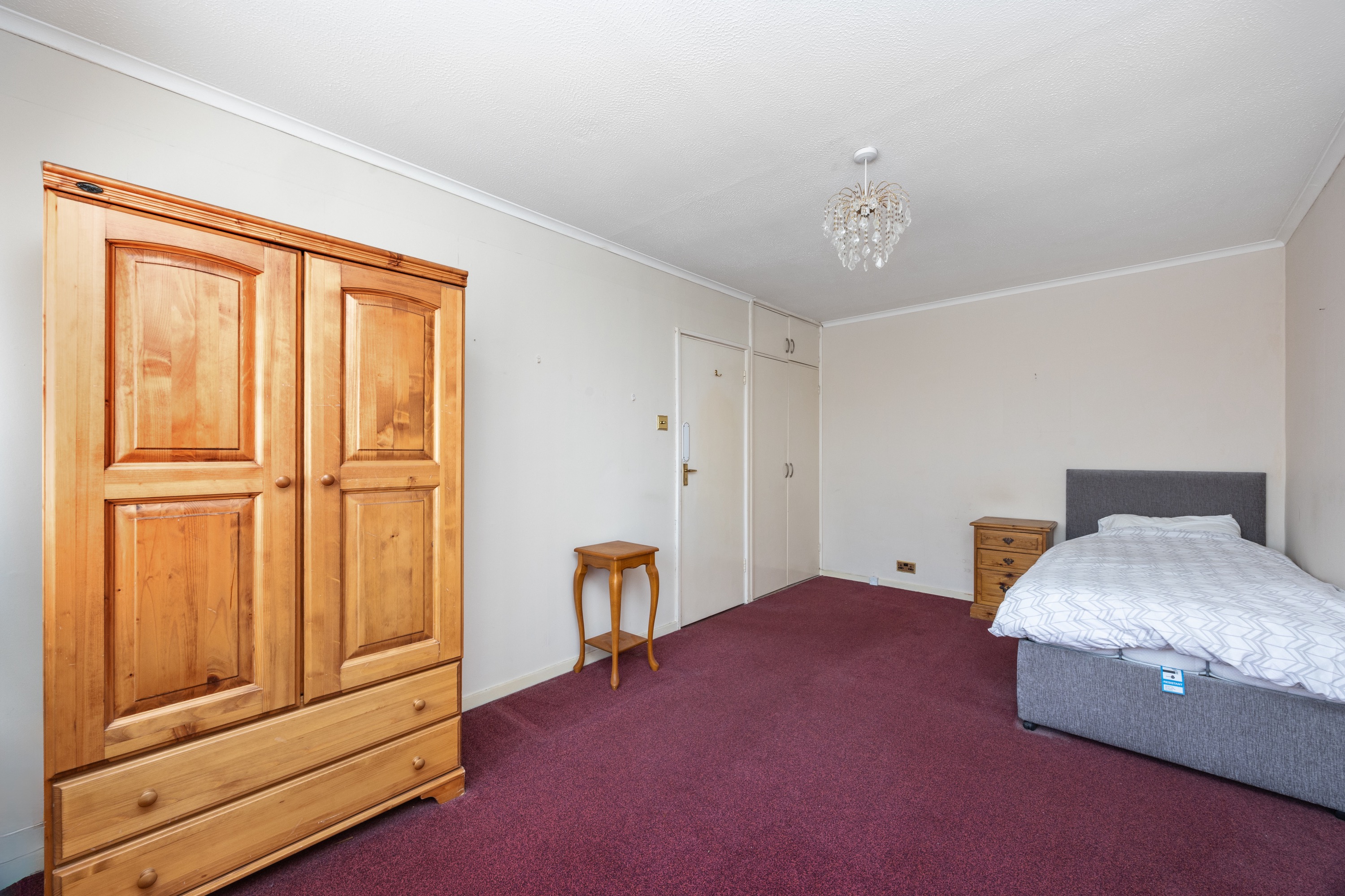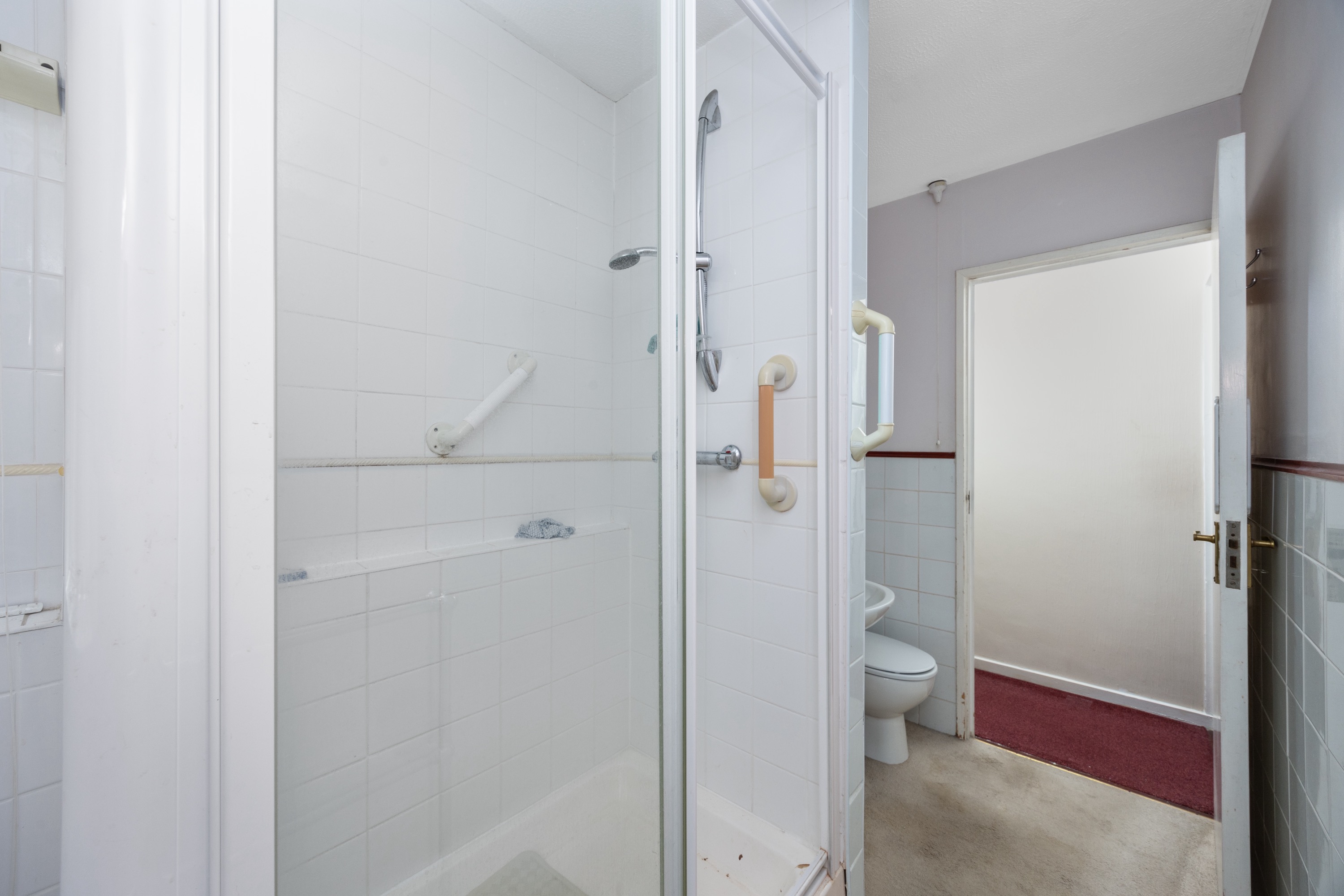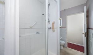 To the end of the hall, you find the spacious double bedroom overlooking the front aspect and benefitting from integral storage. Adjacent, you find the partially-tiled shower room featuring a double shower, heated towel rail, vanity mirror as well as all of the essentials.