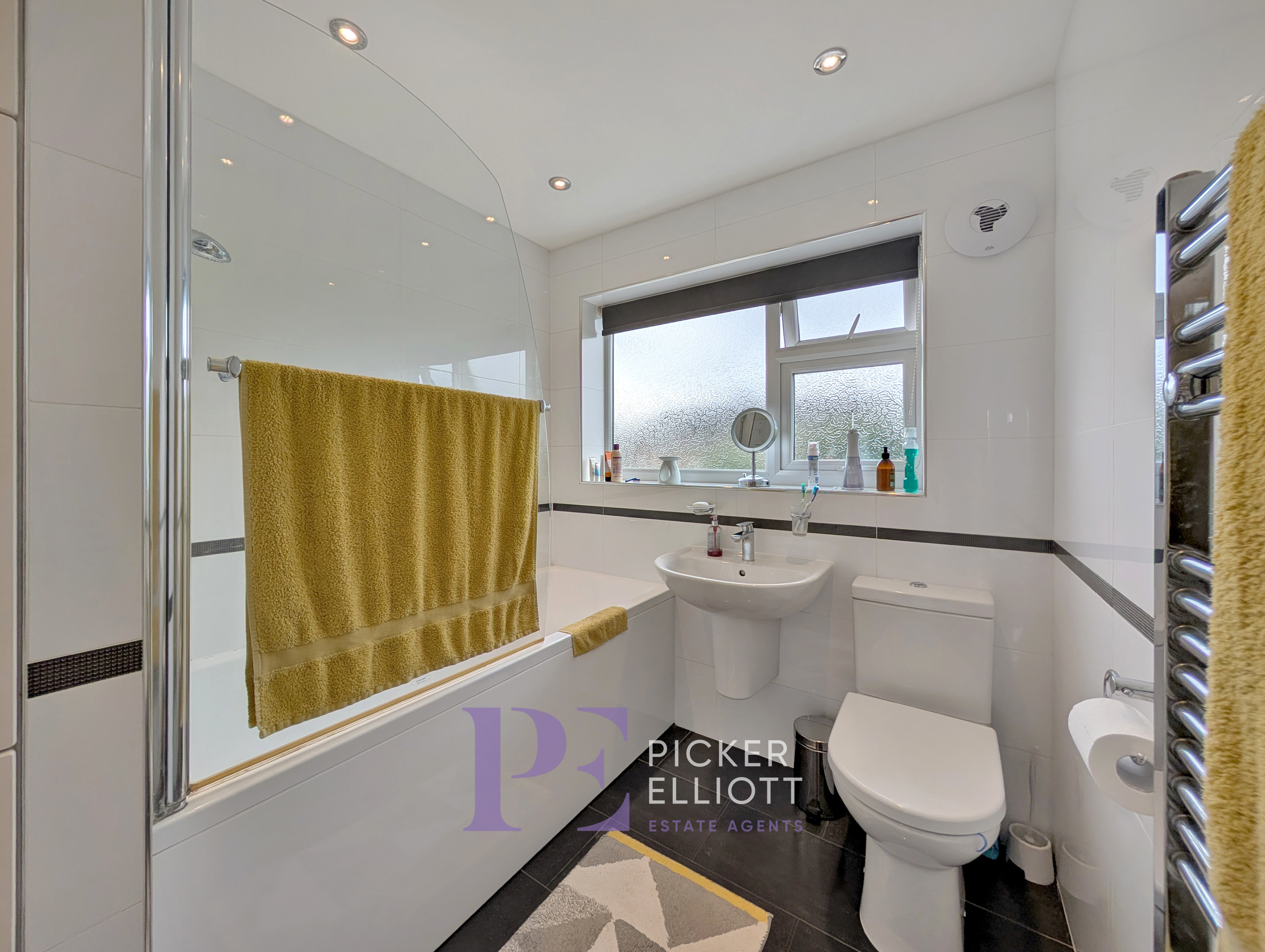 Having a white suite comprising bath with shower, wall-mounted washbasin, and low-level button-flush toilet. Tiled flooring, and fully tiled walls. There is a UPVC double glazed window with frosted glass, wall-mounted extractor, centrally heated chrome effect towel rail, and access to airing cupboard.