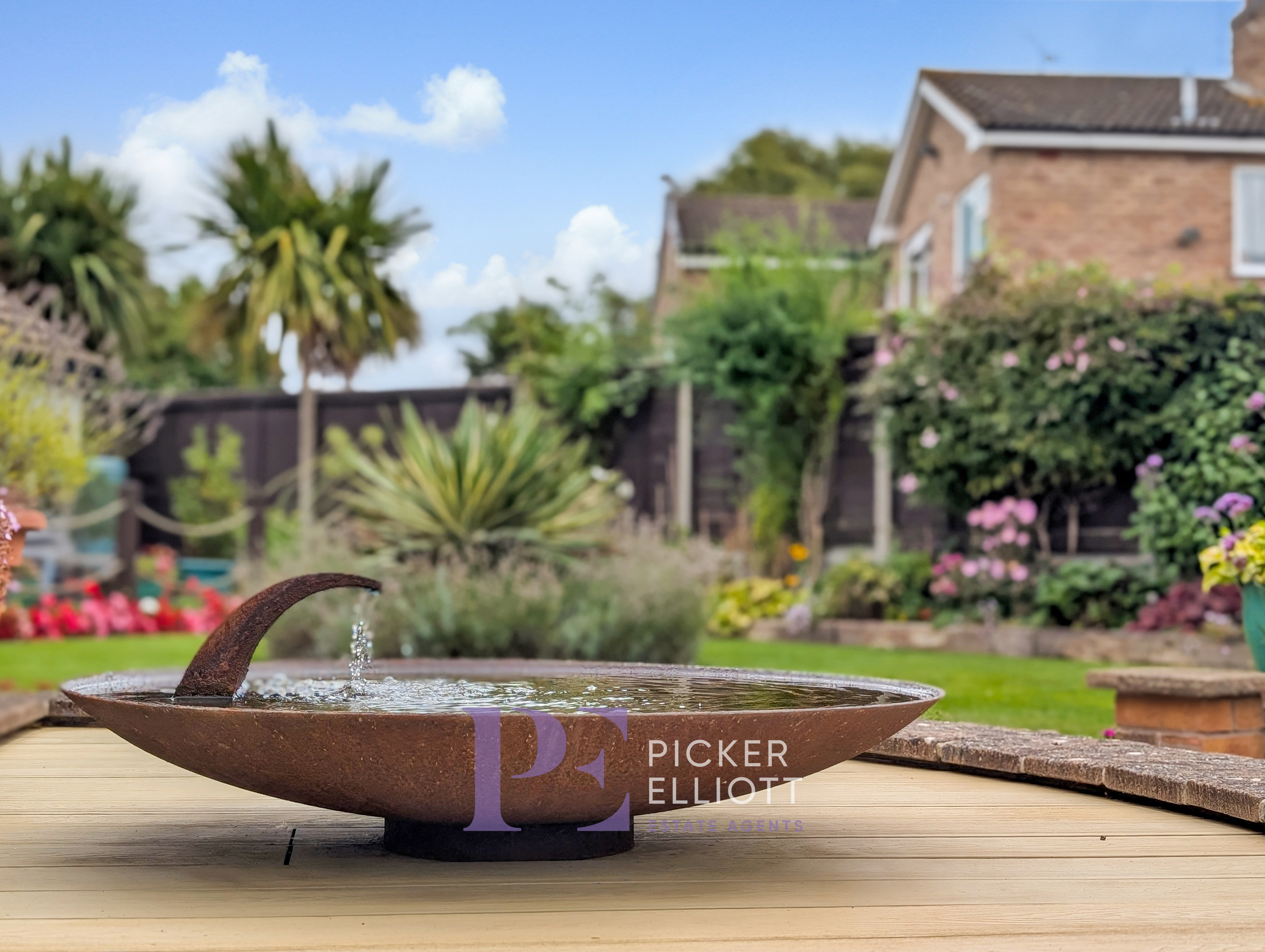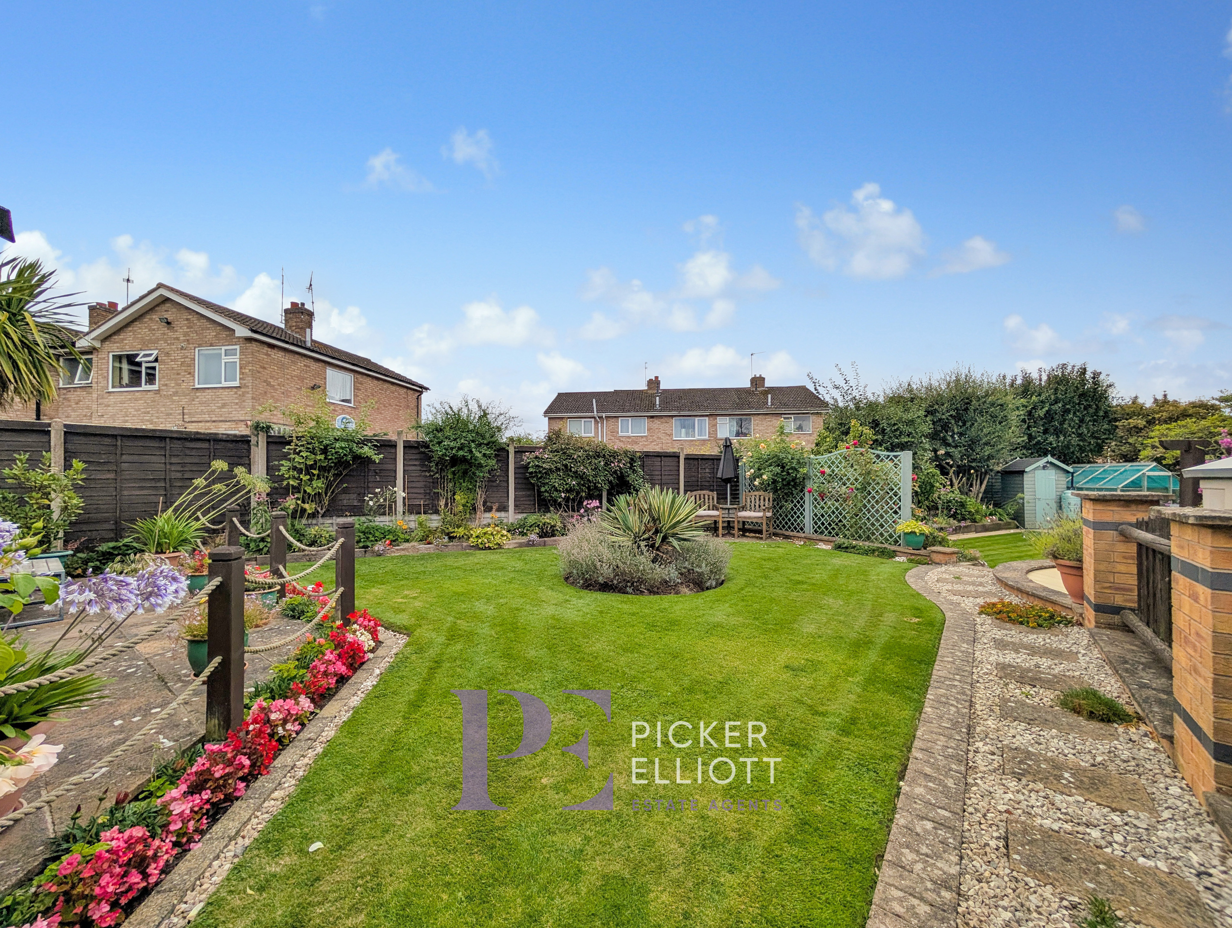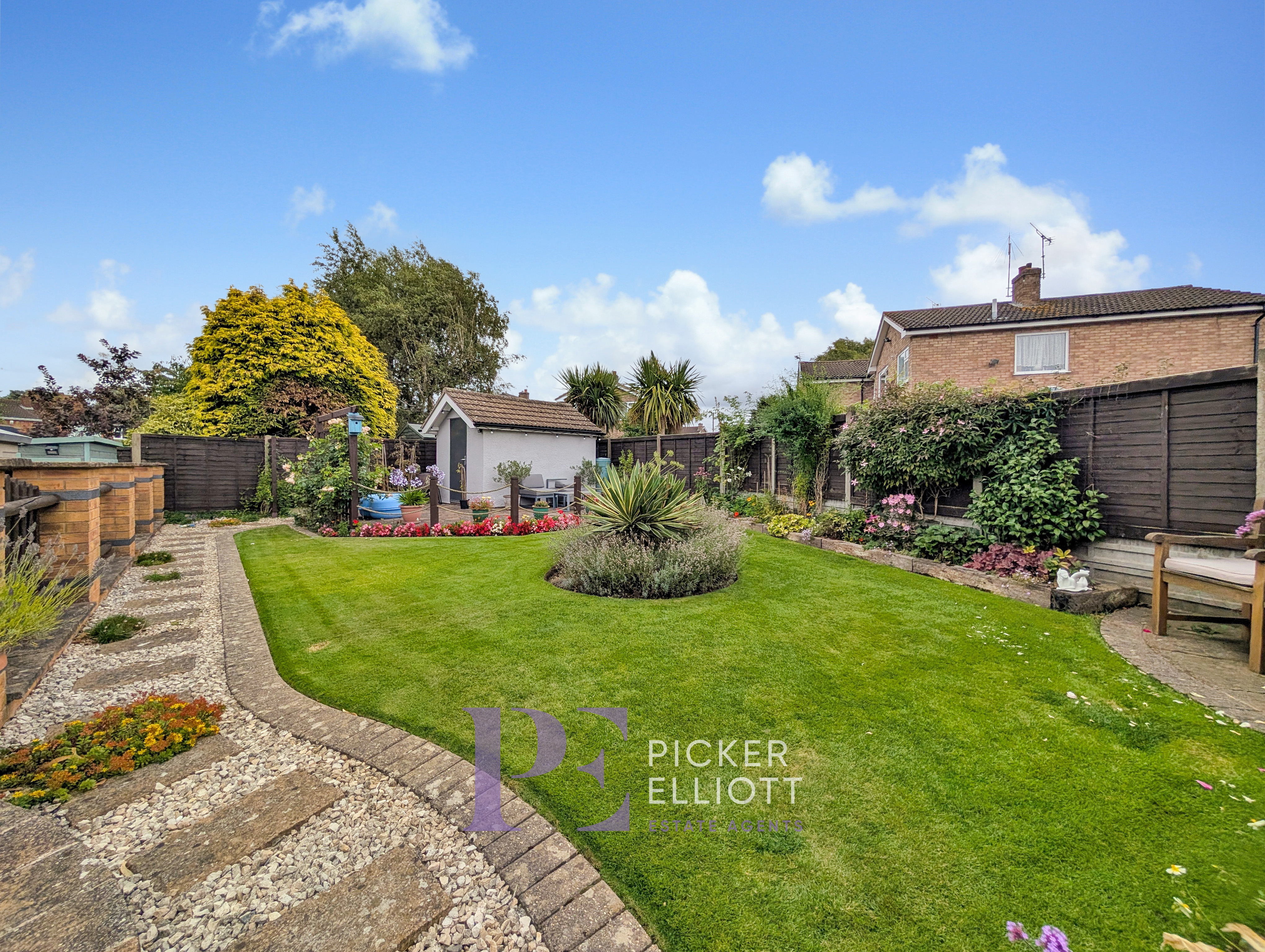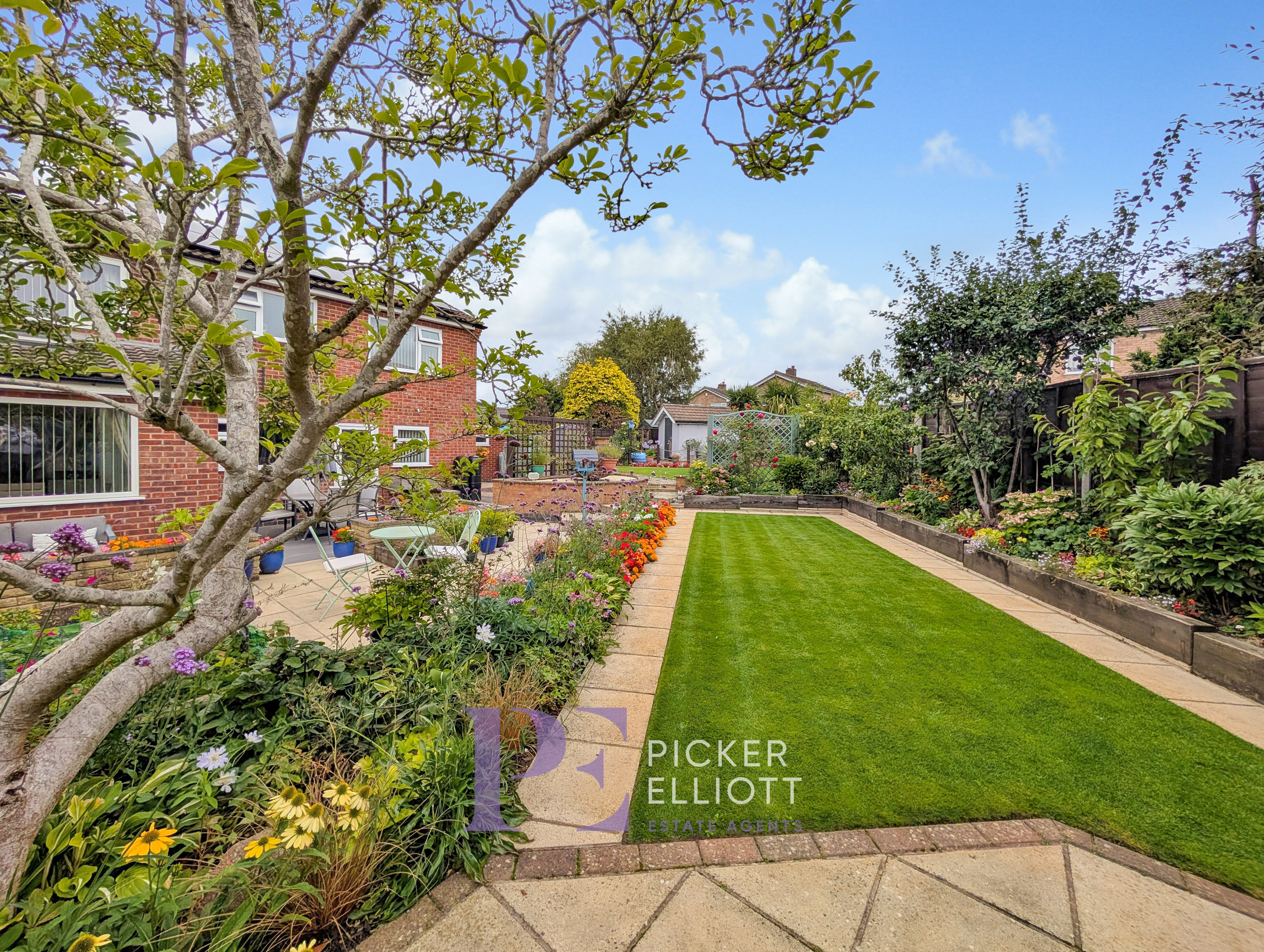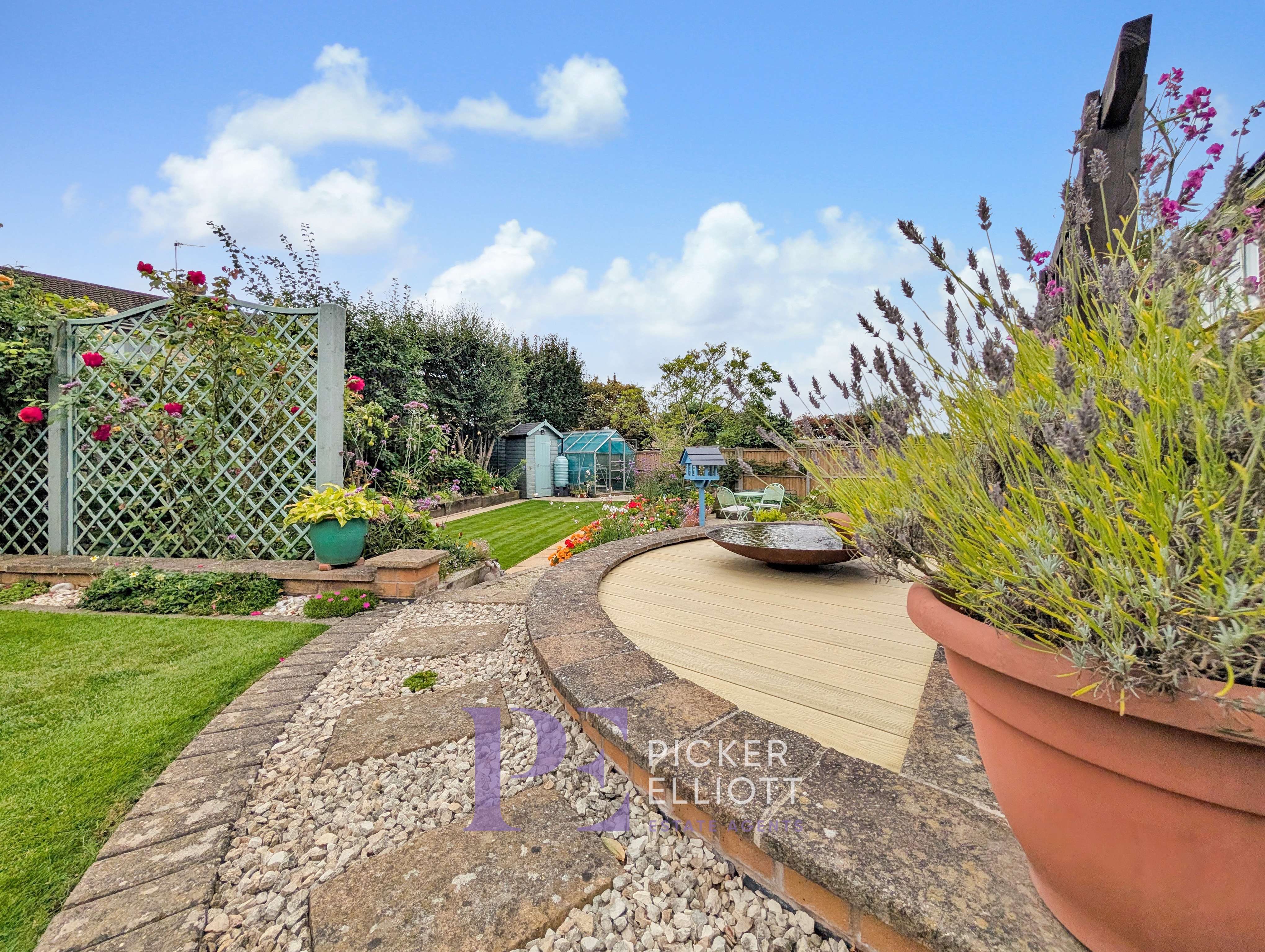 A huge south-facing sectional garden. The garden has multiple well-stocked borders, multiple seating areas, and two lawned areas. There is a paved area to the side of the property which houses two sheds, and there is also a greehouse to the far corner of the plot. A brick-built shed sits on the opposite corner, with light and power, and providing scope for conversion in to a garden room/office.