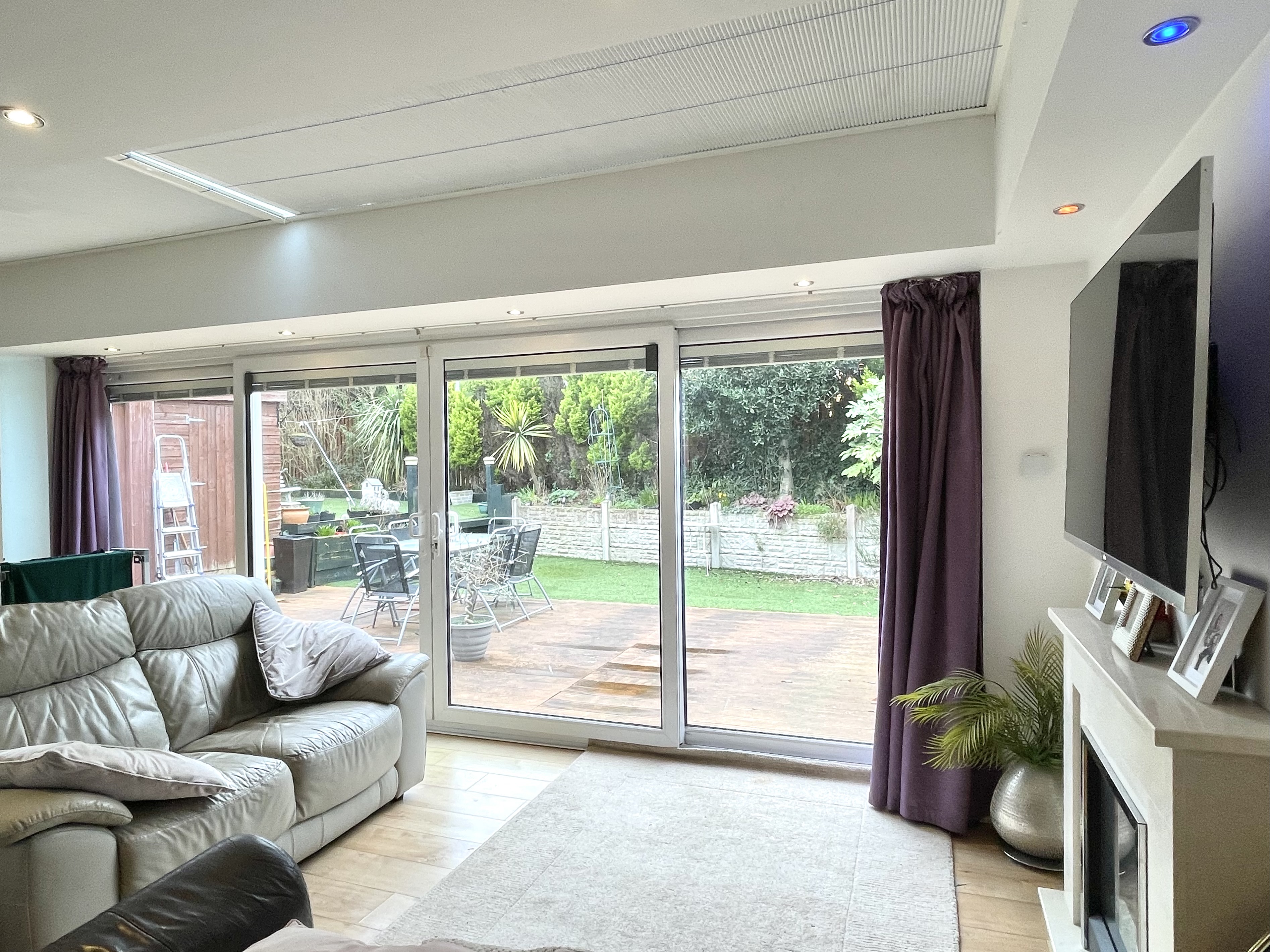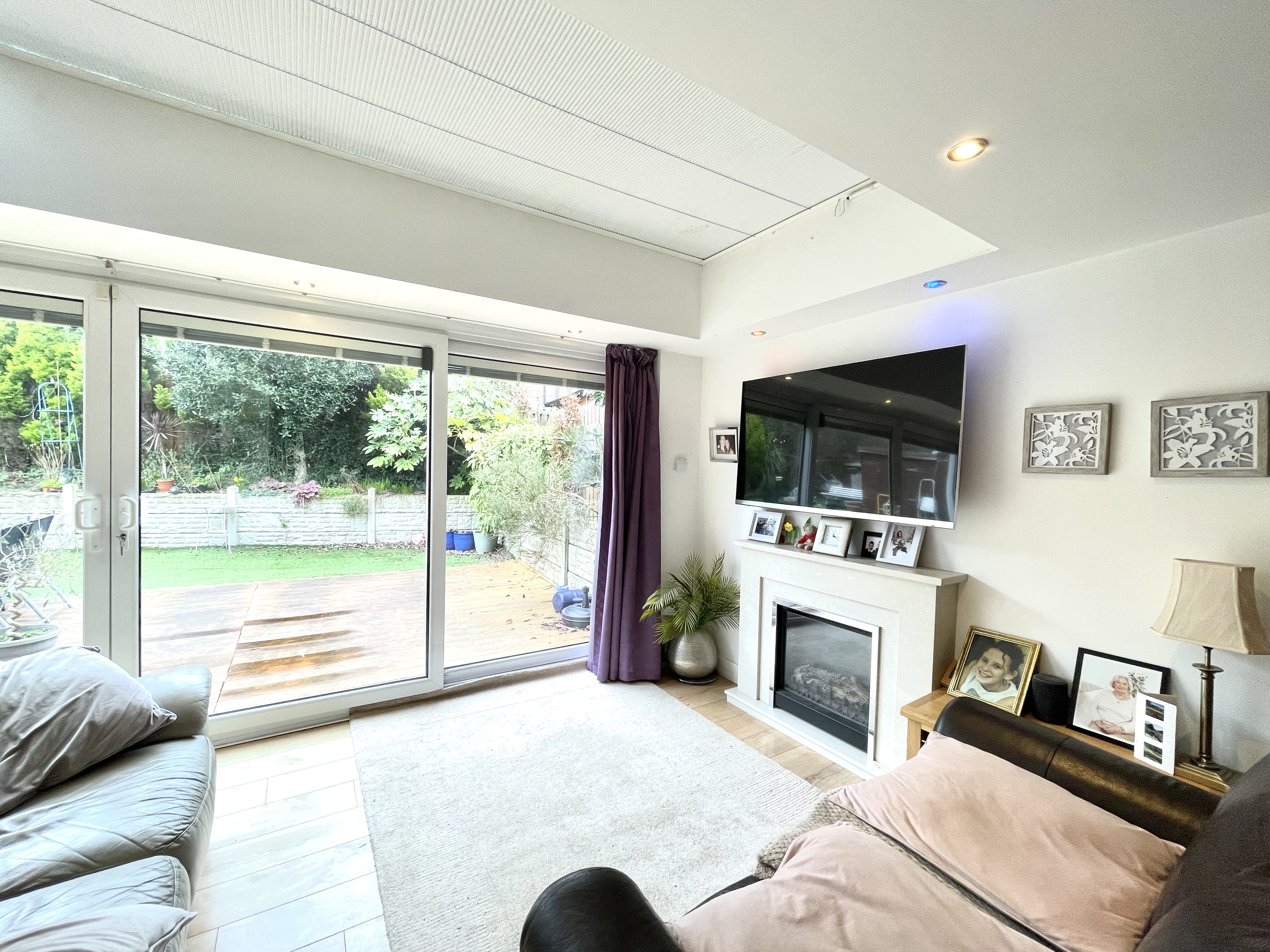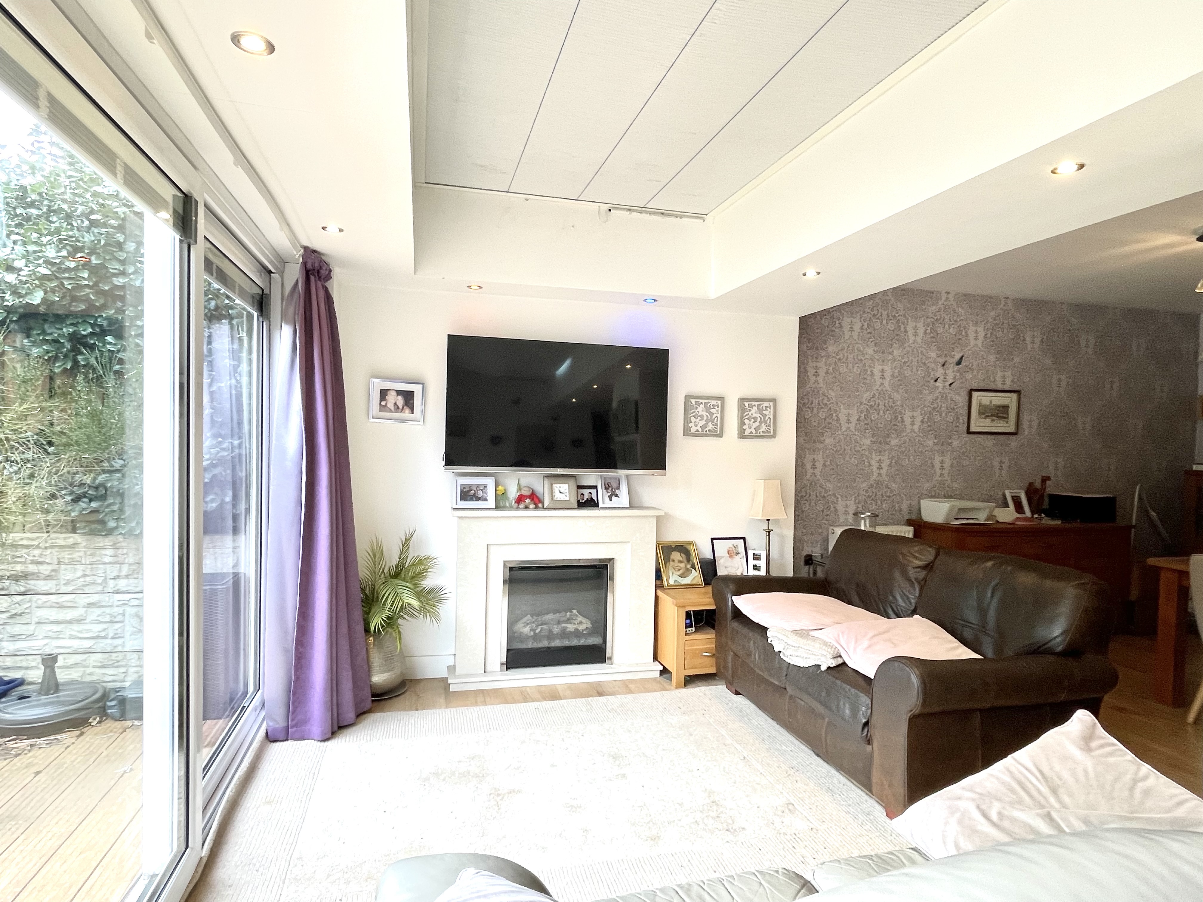 This has a glazed atrium together with uPVC floor to ceiling double glazed windows with central French doors and integrated blinds and all of this provides lots of natural light. There are inset LED downlighters, central heating radiator, breakfast bar and to one side a feature fireplace with marble surround and electric flame effect log fire. To one side a door gives access to a utility room.