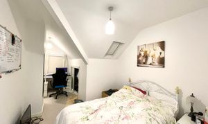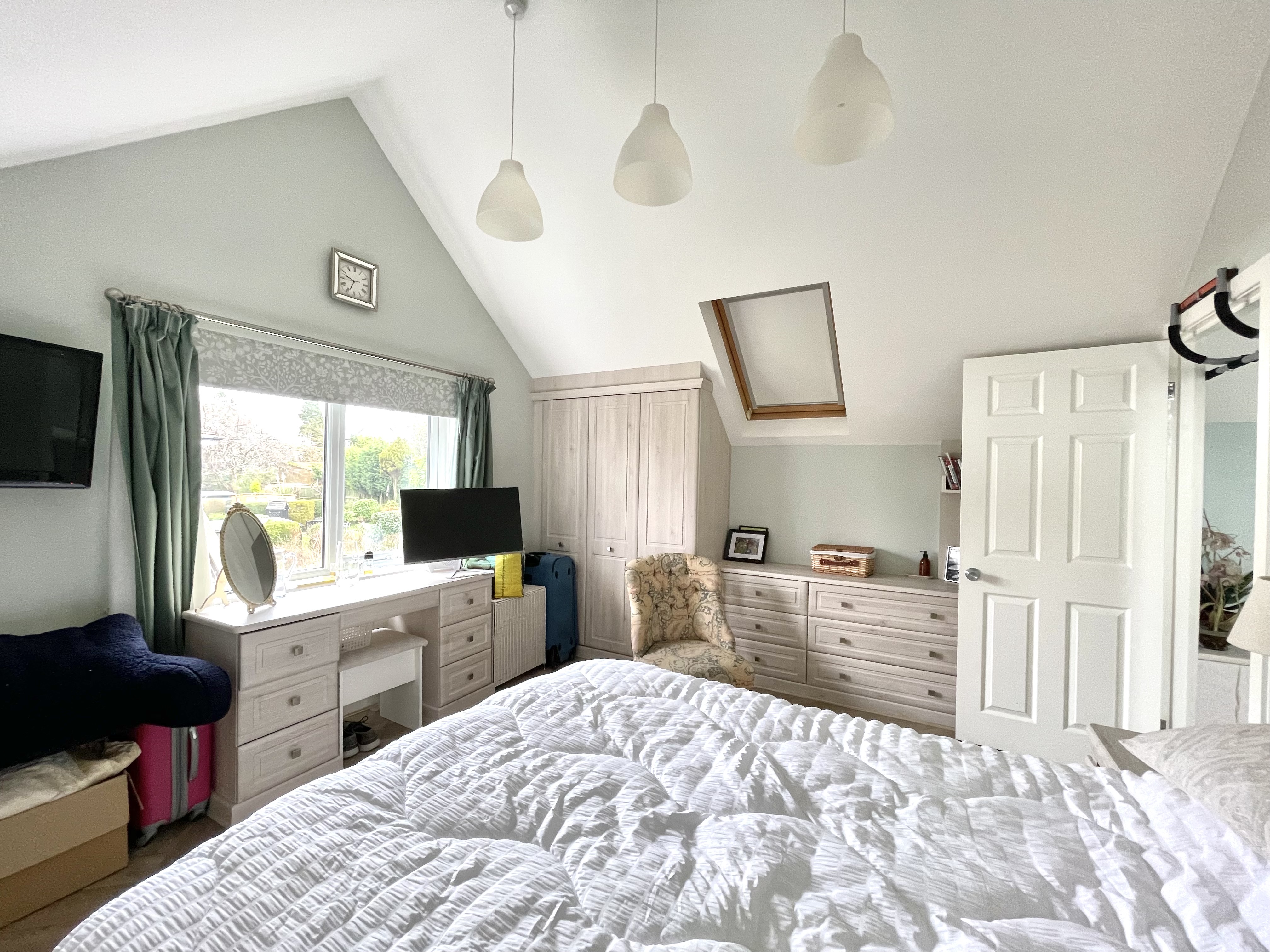 A double room which has a uPVC double glazed window to the gable, pitched ceiling with three ceiling light points and Velux double glazed window, herringbone oak effect laminate flooring, central heating radiator and having fitted furniture including floor to ceiling wardrobes with adjacent drawers with display shelving and to the opposite side there are two twin door recessed wardrobes.