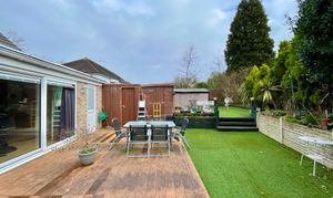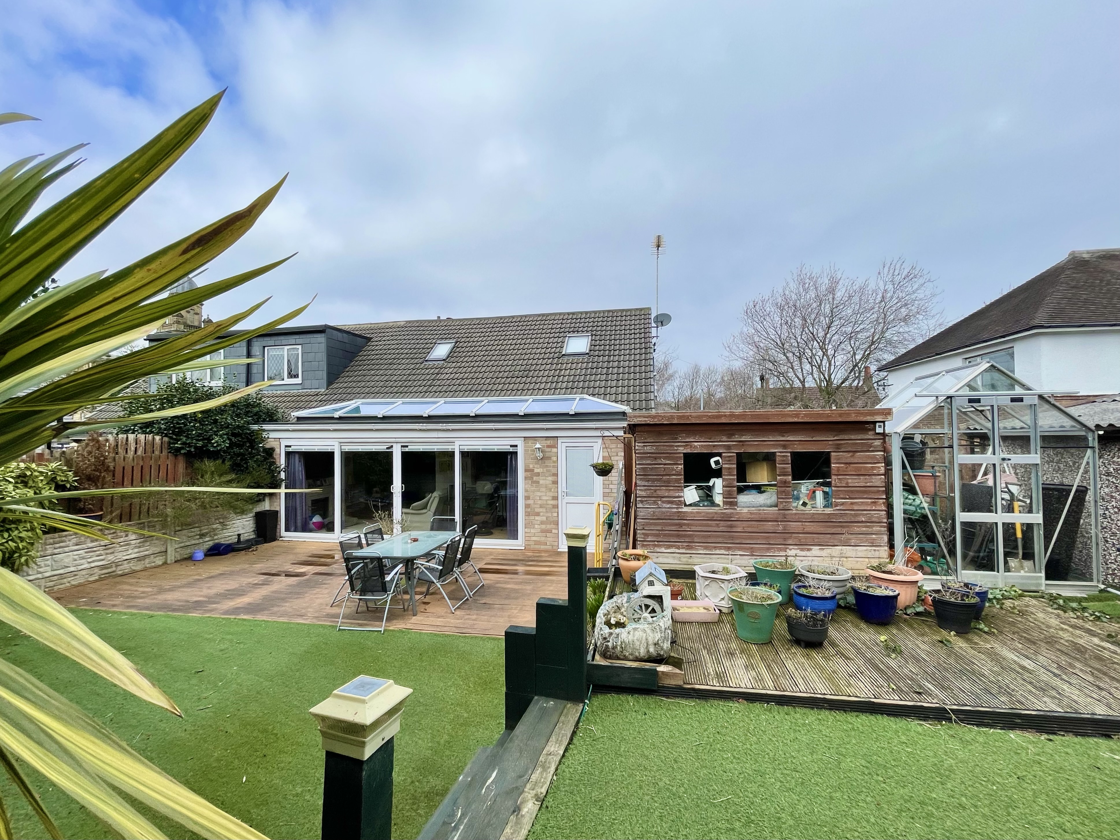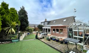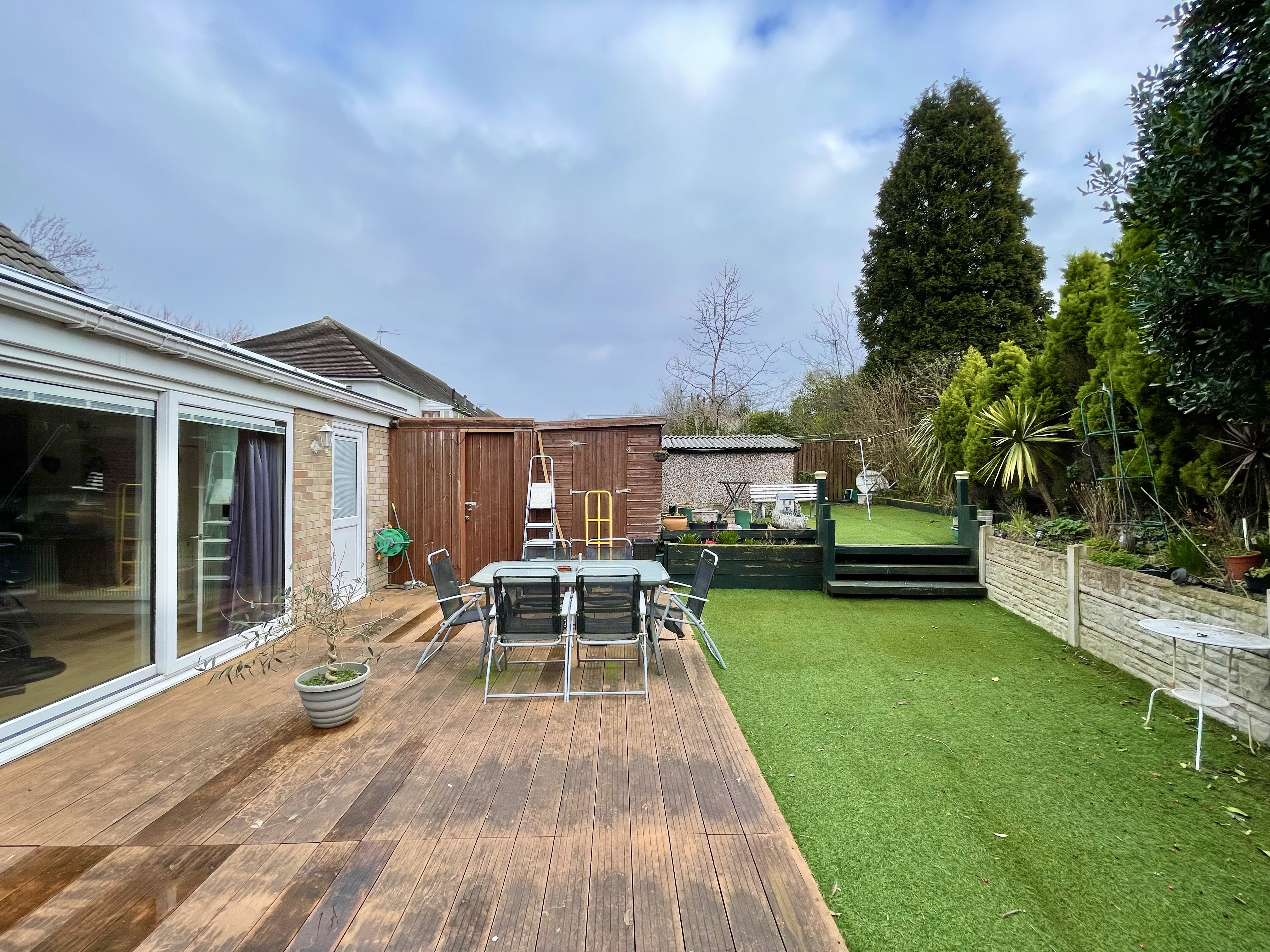 To the front of the property there is an area of astroturf with planted trees and shrubs to the borders together with a tarmac pathway giving access to the main entrance. To the left-hand side of the driveway there is an area of astroturf with planted trees and shrubs, external lighting and CCTV. To the rear there is a south easterly facing garden which has an area of timber decking, two tier astroturf area which spans the full width of the plot and continues behind the garage, there is a timber and glazed garden shed, door giving access to the driveway, outside cold water tap and CCTV.