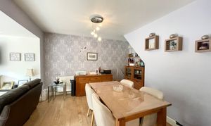 As the dimensions indicate this is particularly spacious living space which has been sectioned into a kitchen area, living area and dining area. The kitchen has a range of dove grey handleless soft closing base and wall cupboards, drawers, pan drawers and complimented by overlying quartz worktops with tiled splashbacks, there is concealed lighting beneath the wall cupboards, ceiling light point, laminate flooring which continues throughout the room. There is a four-ring halogen hob with extractor hood over, electric fan assisted oven, combi oven, warming draw and inset single drainer stainless steel sink with chrome monobloc tap. Adjacent to the kitchen area is the dining area and this has a ceiling light point, two central heating radiators and useful storage cupboard beneath the staircase.