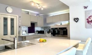 With glazed atrium, uPVC double glazed window with integrated blinds and uPVC sealed unit double glazed door which also has integrated blinds and gives access to the rear garden. There are inset LED downlighters, wall mounted Worcester gas fired central heating boiler and having Ivory base cupboards and drawers with contrasting overlying worktops, inset single drainer sink with chrome mixer tap and under counter space for washing machine.