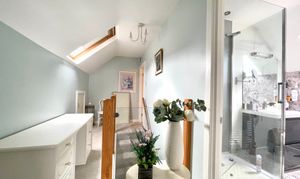 With a Velux double glazed window, inset LED downlighters, wall lighting incorporating shaver socket, chrome ladder style heated towel rail and fitted with a suite comprising vanity unit incorporating wash basin with chrome waterfall style monobloc tap, low flush w.c and a shower cubicle with chrome shower fitting.