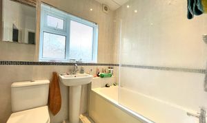This has inset ceiling downlighters, extractor fan, frosted uPVC double glazed window, floor to ceiling tiled walls, tiled floor, ladder style heated towel rail and fitted with a suite comprising panelled bath with glazed shower screen and chrome shower fitting over, pedestal wash basin and low flush w.c.