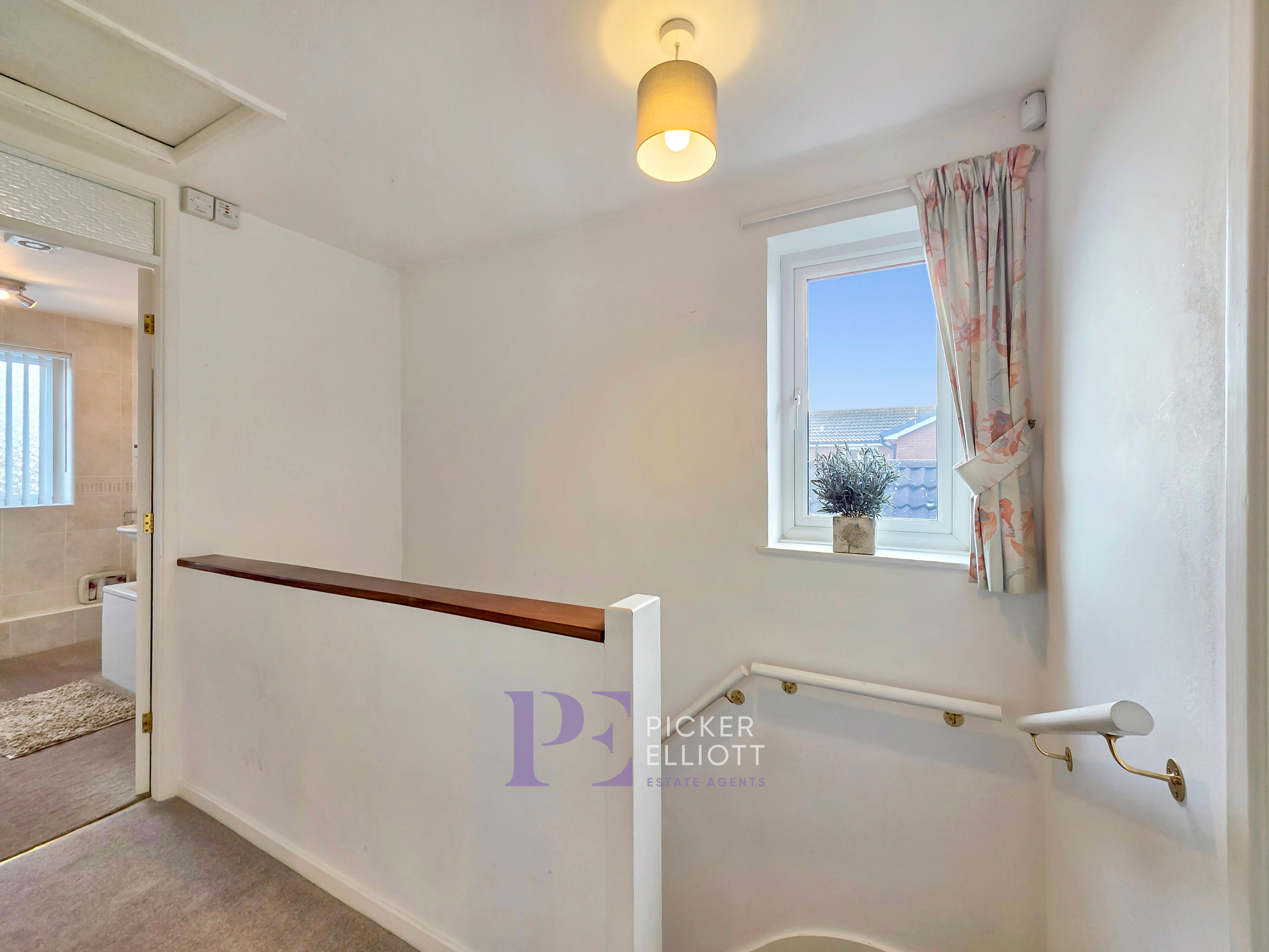Double glazed window to side stairs to the first floor landing, large useful under stairs storage cupboard with shelving radiator