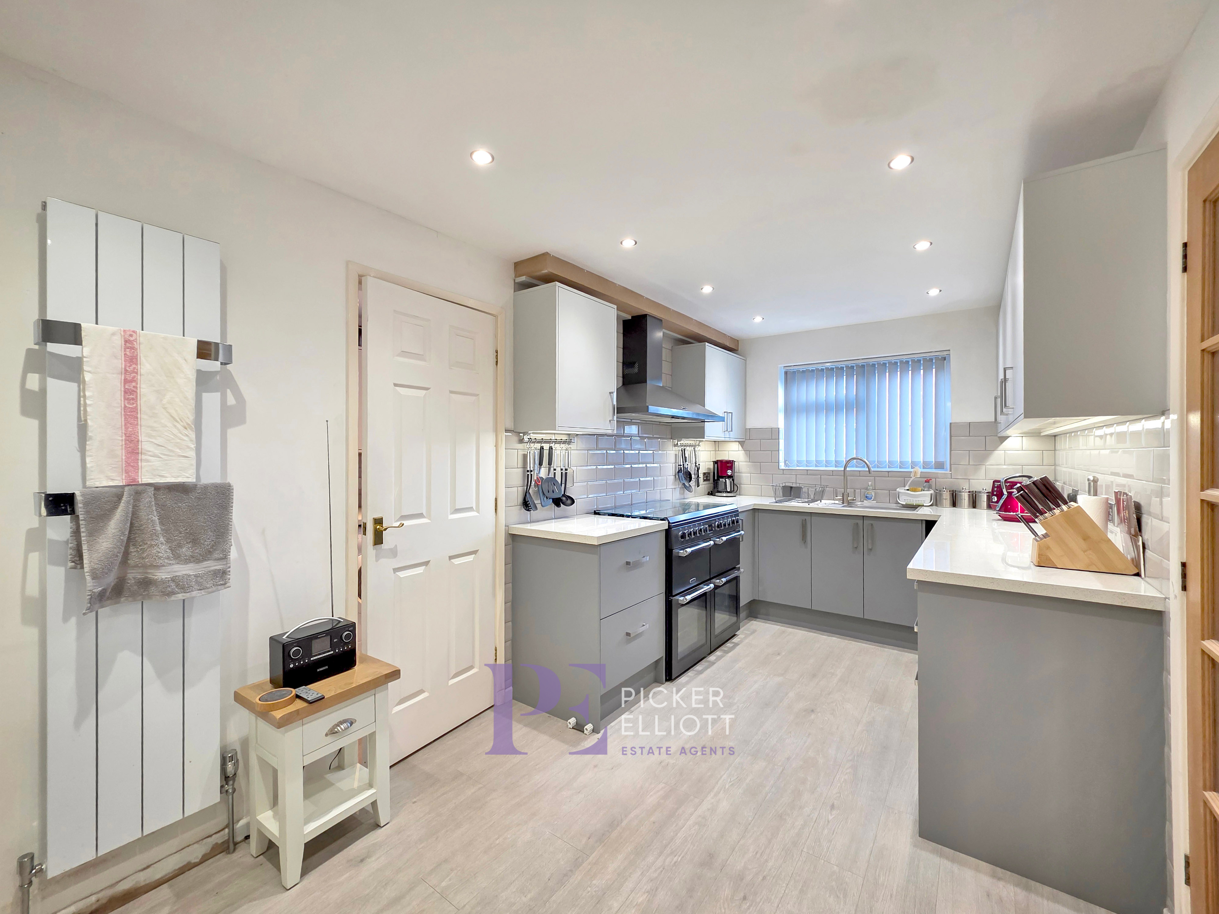 Excellent range of contemporary base and wall units, square edge work surfaces over and tiled splashbacks, space and point for gas range cooker with Range Master extractor hood over, inset one and a half drain sink with mixer tap under cupboard lights, integrated wine rack, space for American fridge freezer, contemporary vertical radiator