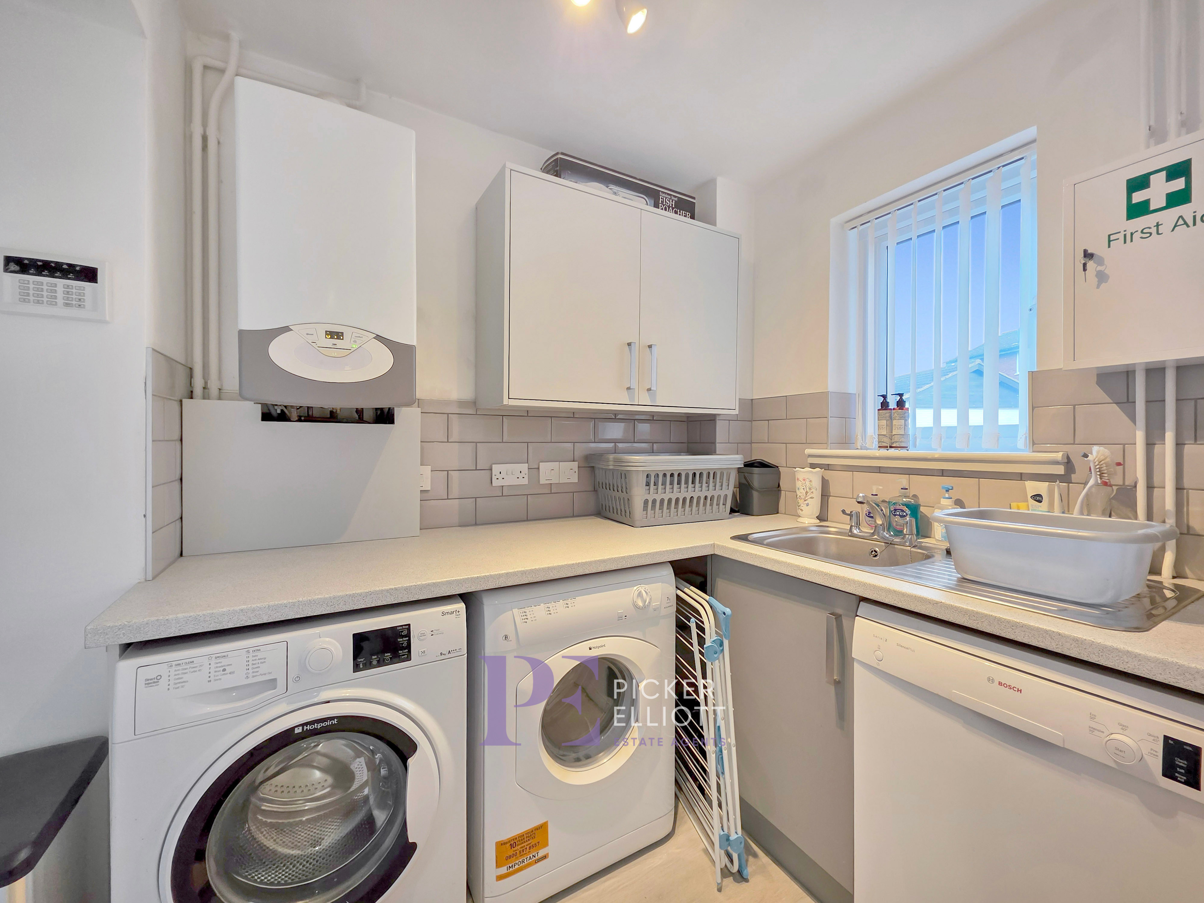 Base and wall units roll edge work surfaces over with tiling to splashbacks, inset drainer sink with mixer tap, wall mounted combi boiler, double glazed window, opaque glazed door, radiator, space for washing machine, space for tumble dryer and space for dishwasher
