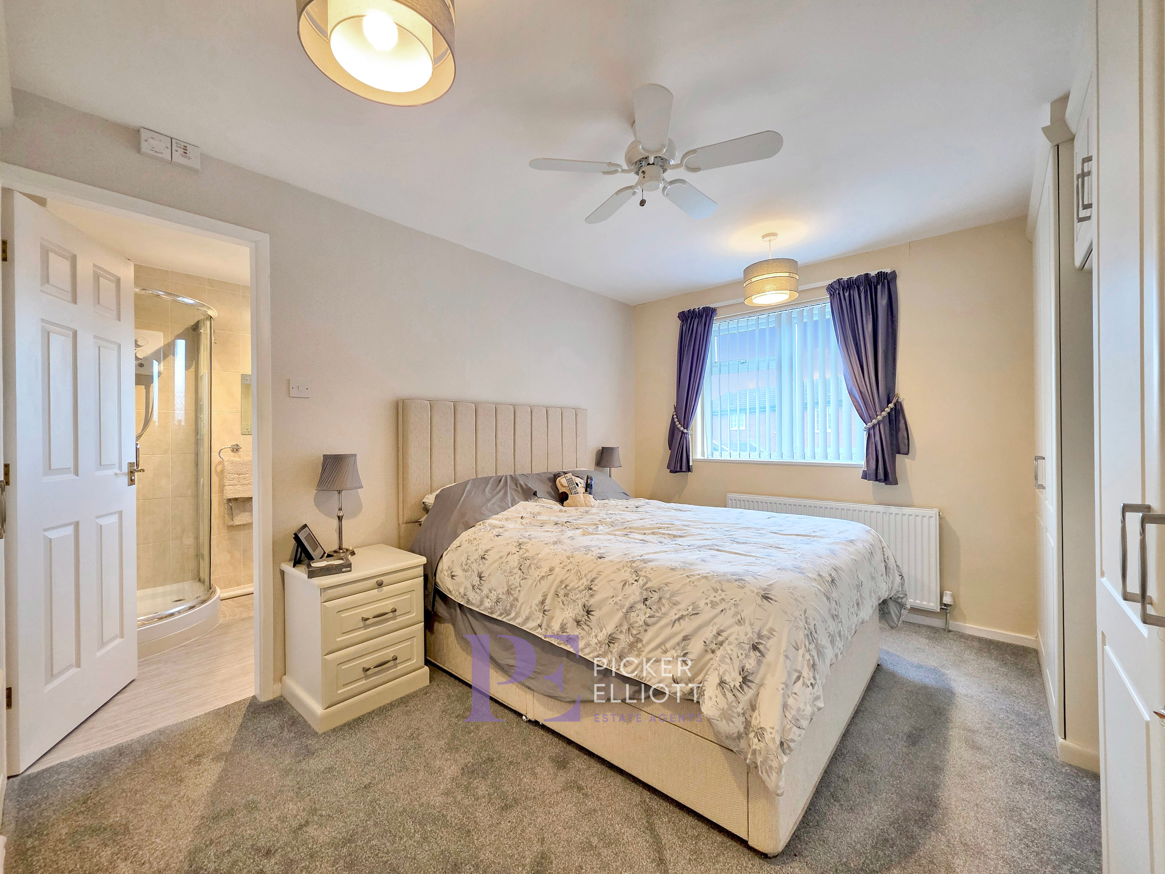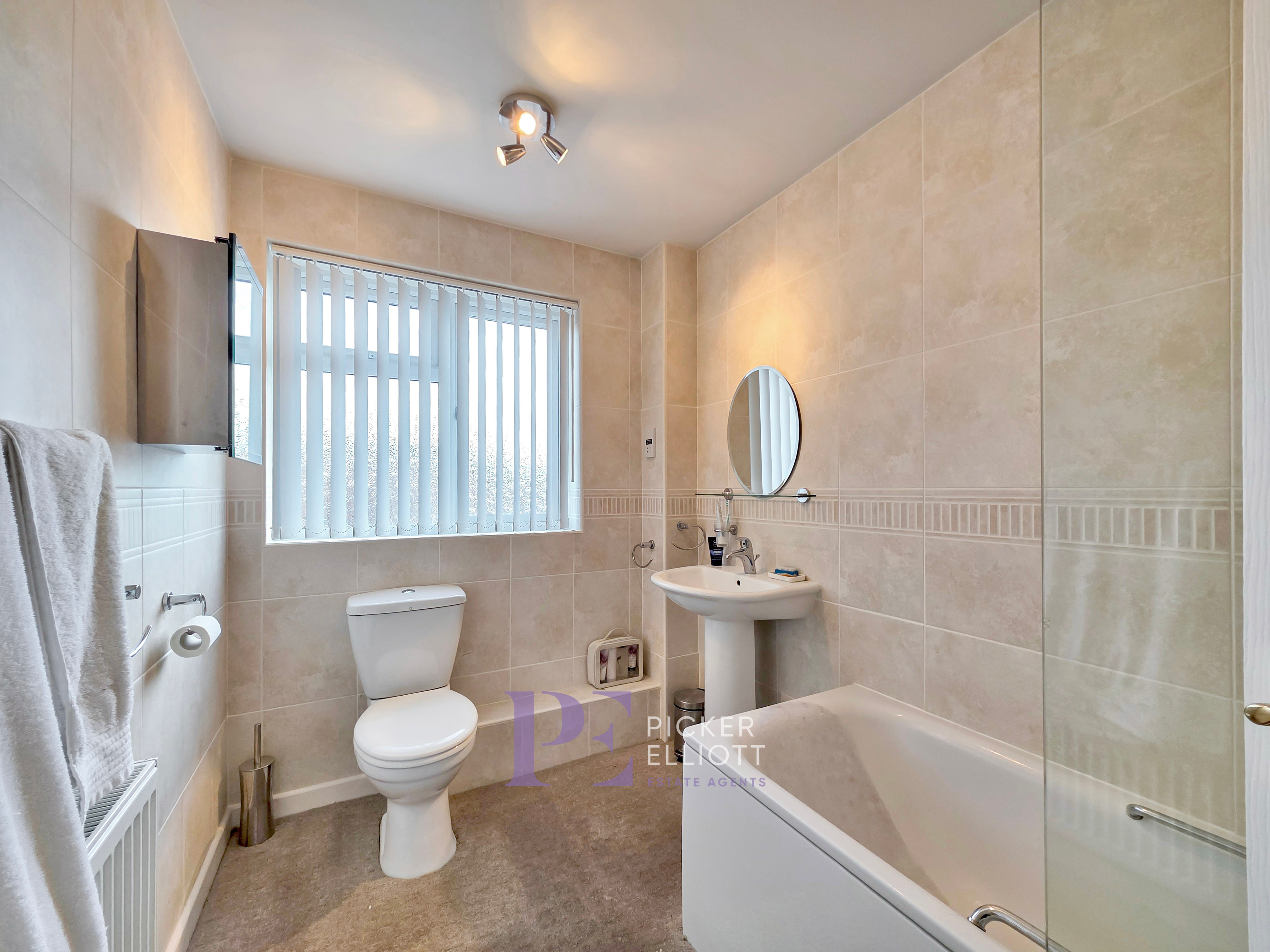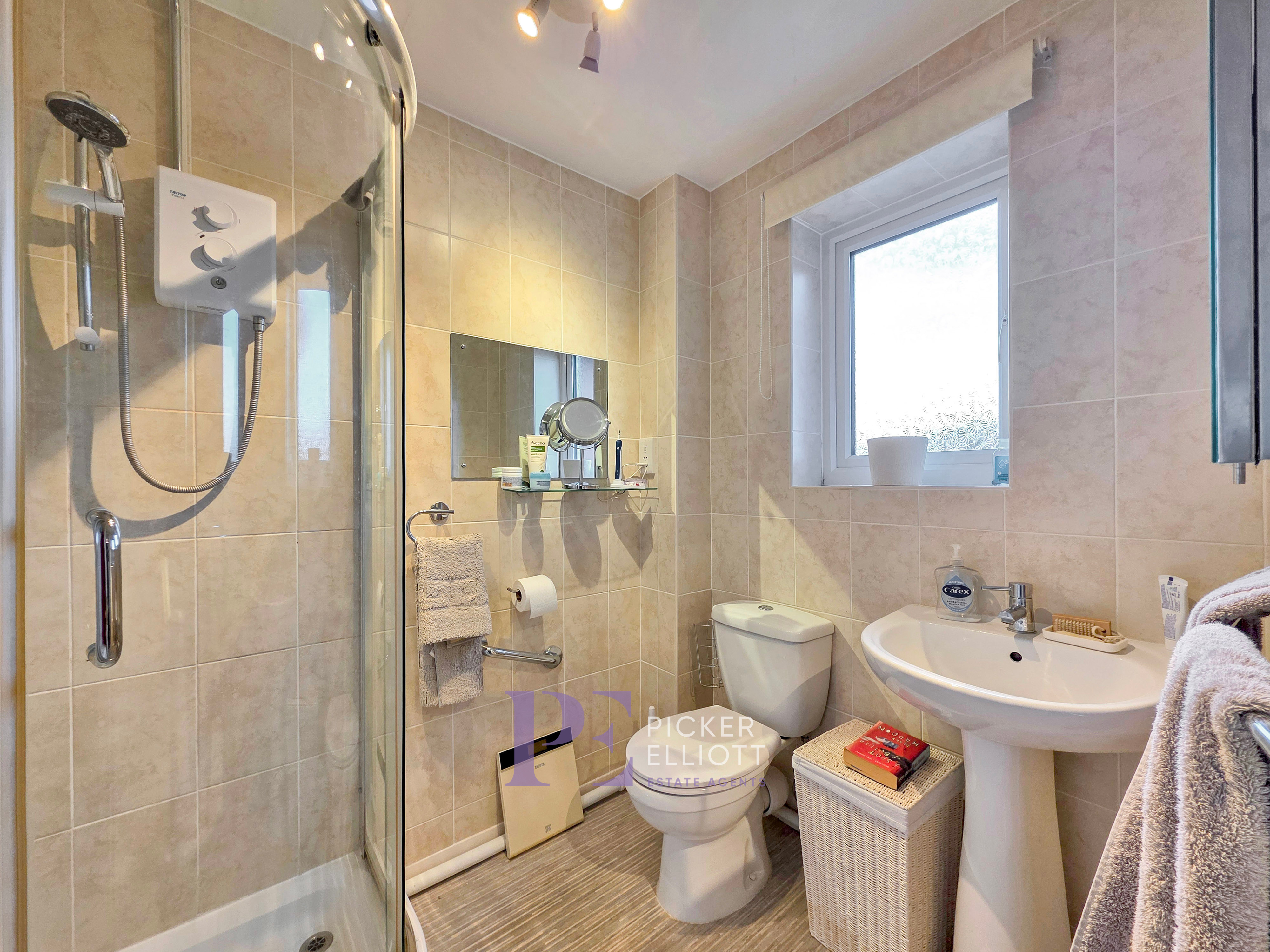 Fully tiled with low level flush WC, pedestal wash basin, enclosed and tiled corner shower cubicle with electric shower, electric shaver point, opaque double glazed, window and radiator