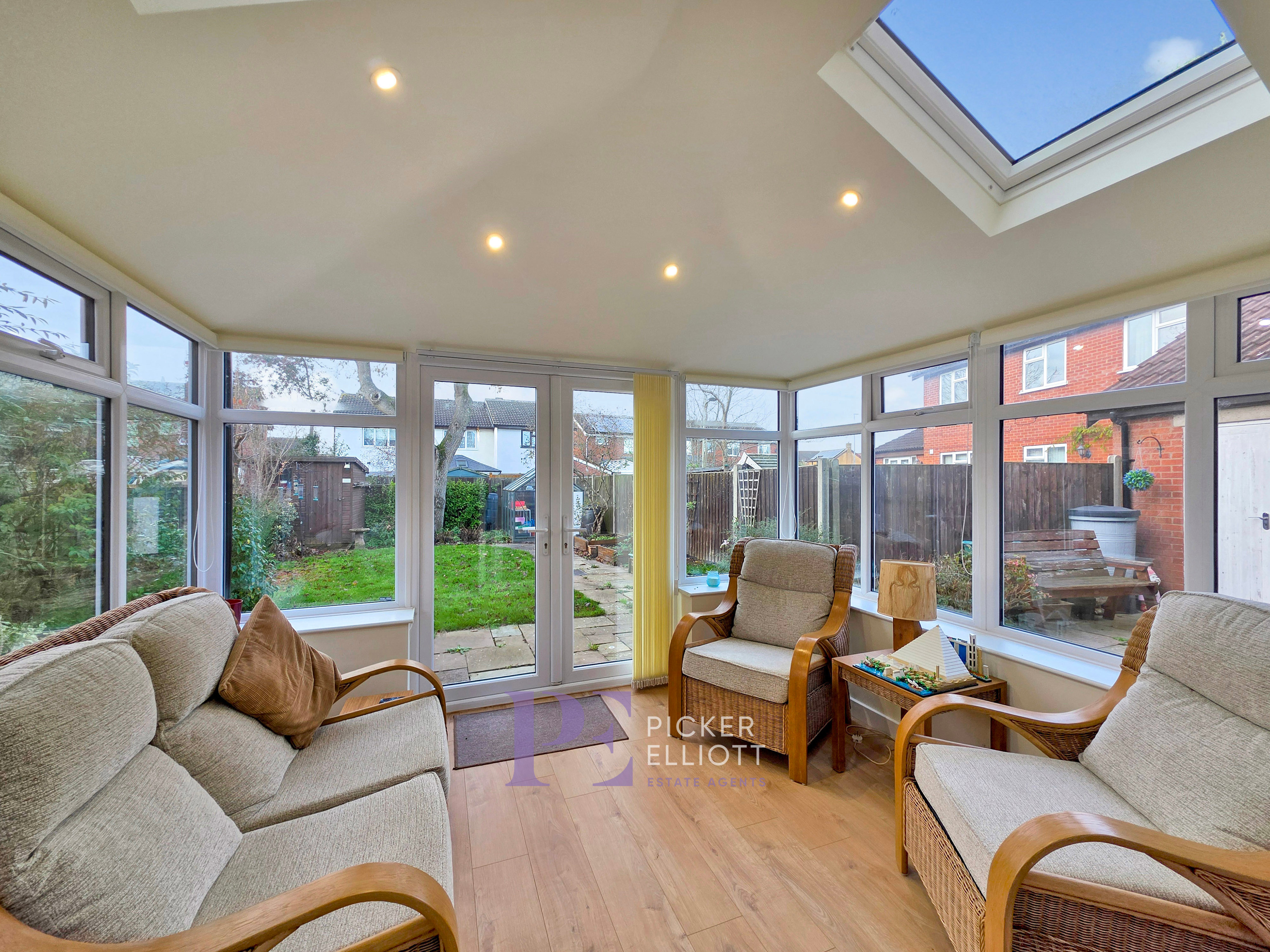 Fully double glazed on brick dwarf wall with double glazed patio doors to rear garden, laminate flooring, inset spotlights and ceiling windows