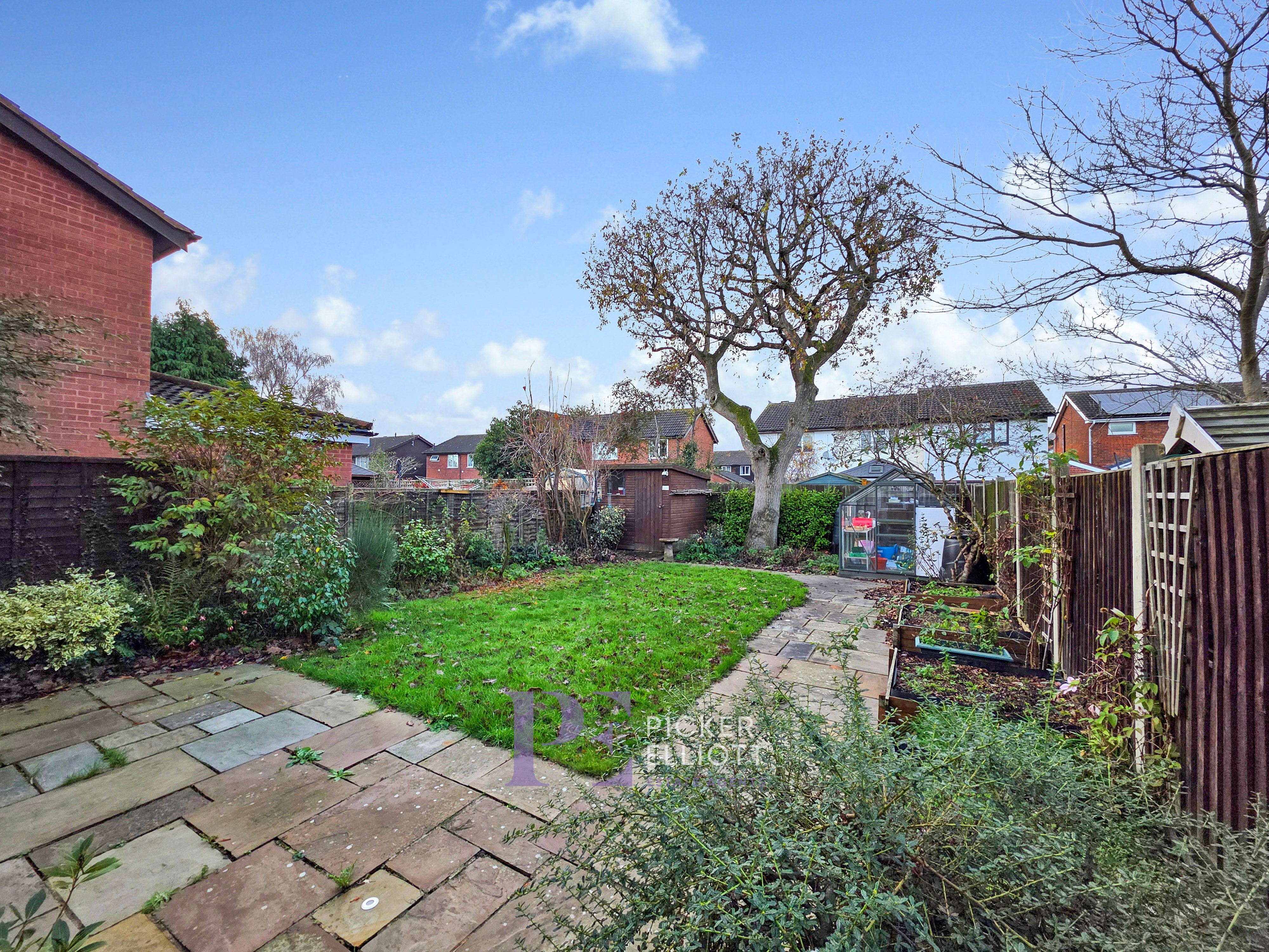 Lovely rear garden with two large patio areas, inset lawn, well stocked mature borders