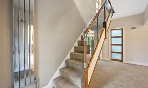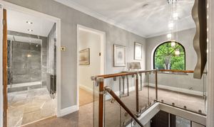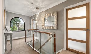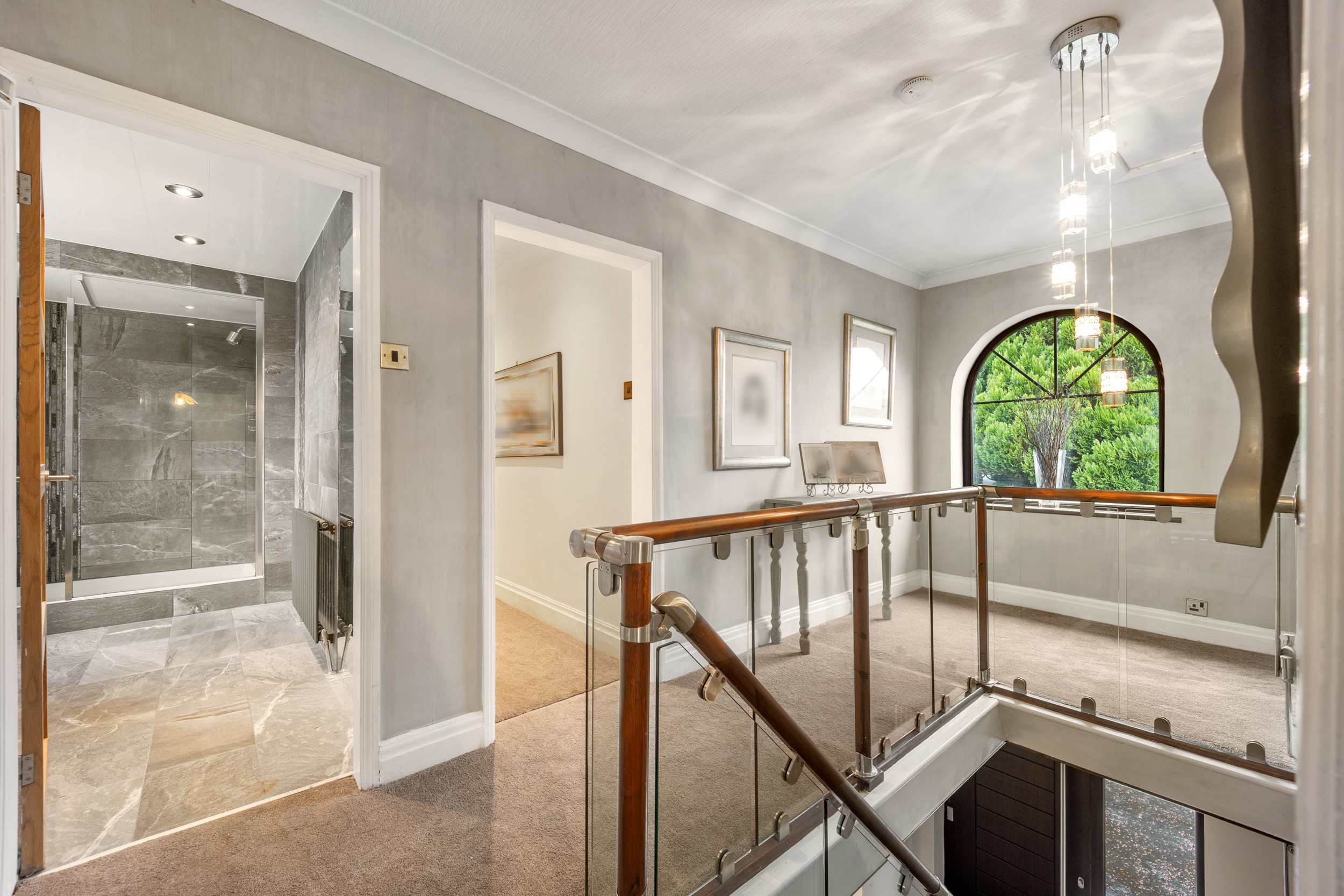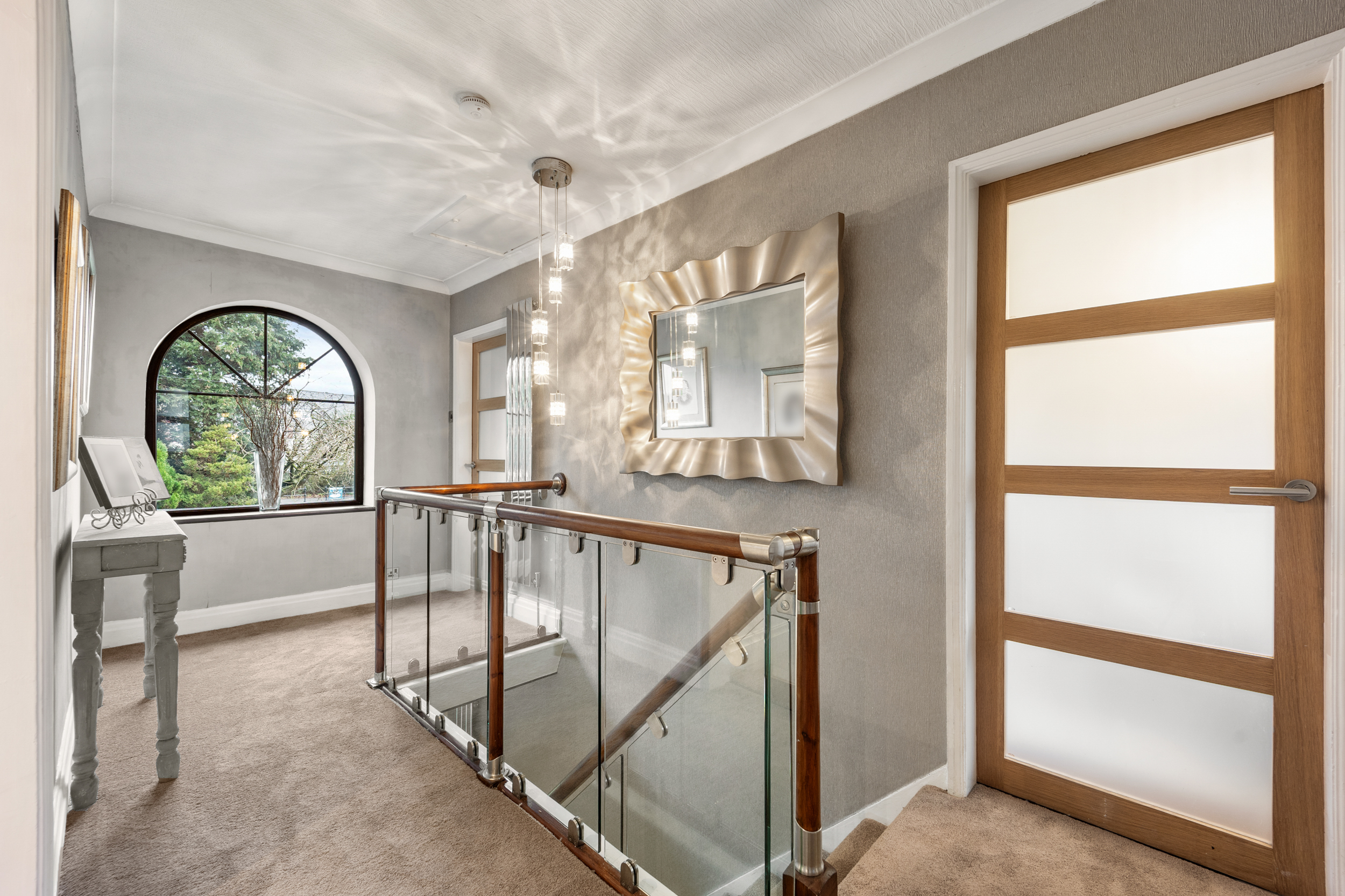 From the main lounge, a staircase with a contemporary glass balustrade rises to the first floor, where a bright and spacious landing is enhanced by a striking arched window that fills the space with natural light. The extension above the garage has significantly enhanced the footprint, creating a well-balanced layout with four well-proportioned bedrooms, including an impressive principal suite positioned within the extended section. From the landing, a separate inner corridor leads to both the principal suite and a further bedroom, adding a sense of privacy and thoughtful zoning to the accommodation. Newly carpeted areas and a soft, neutral palette continue the cohesive feel throughout.
