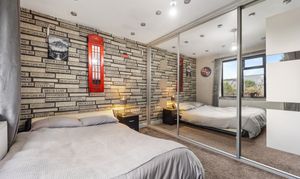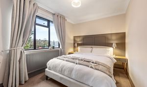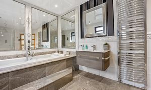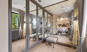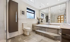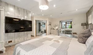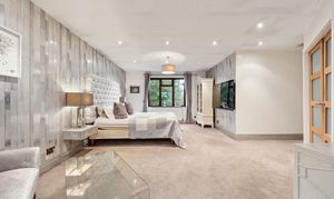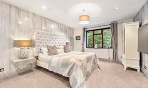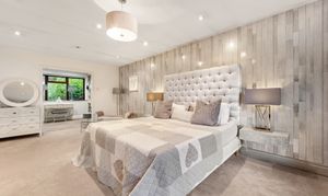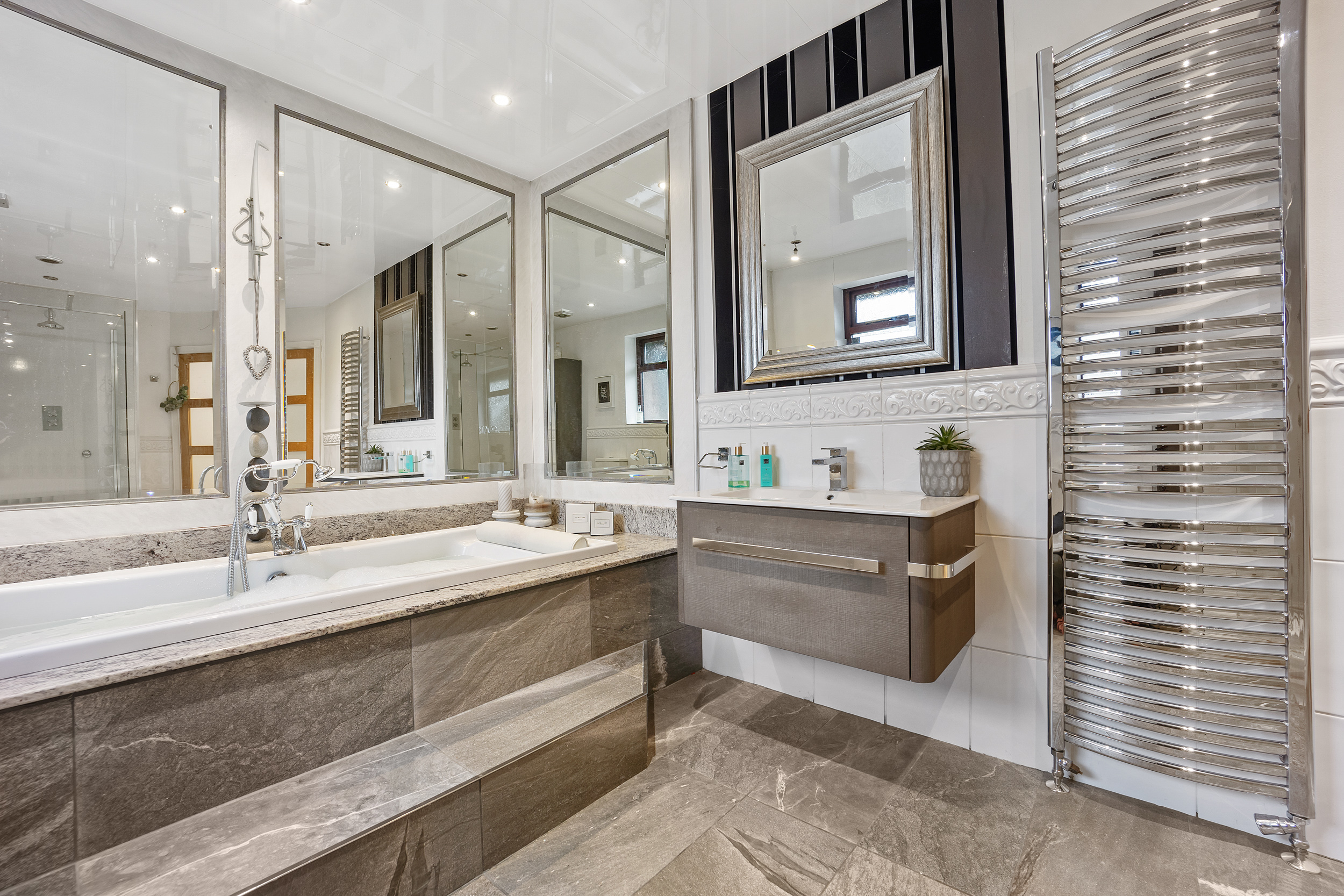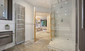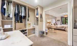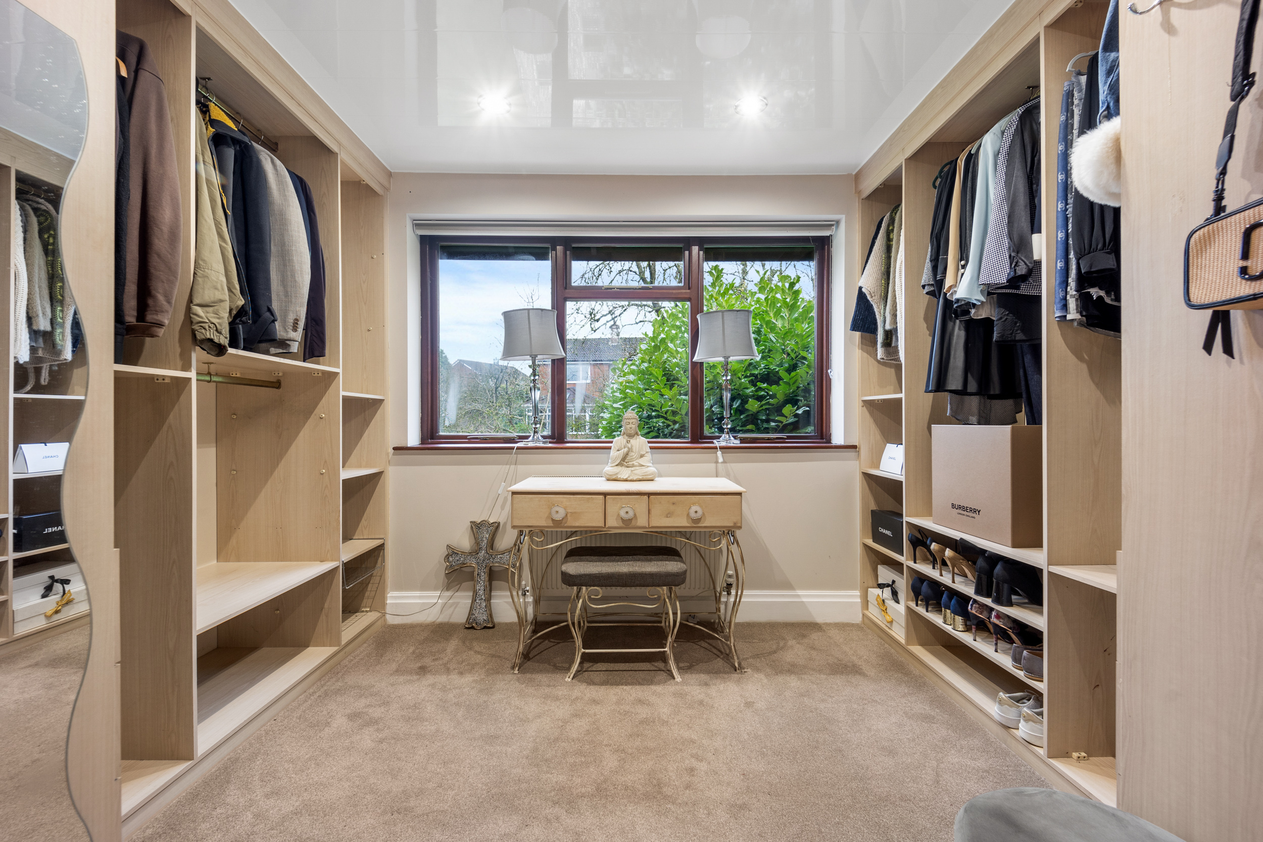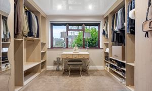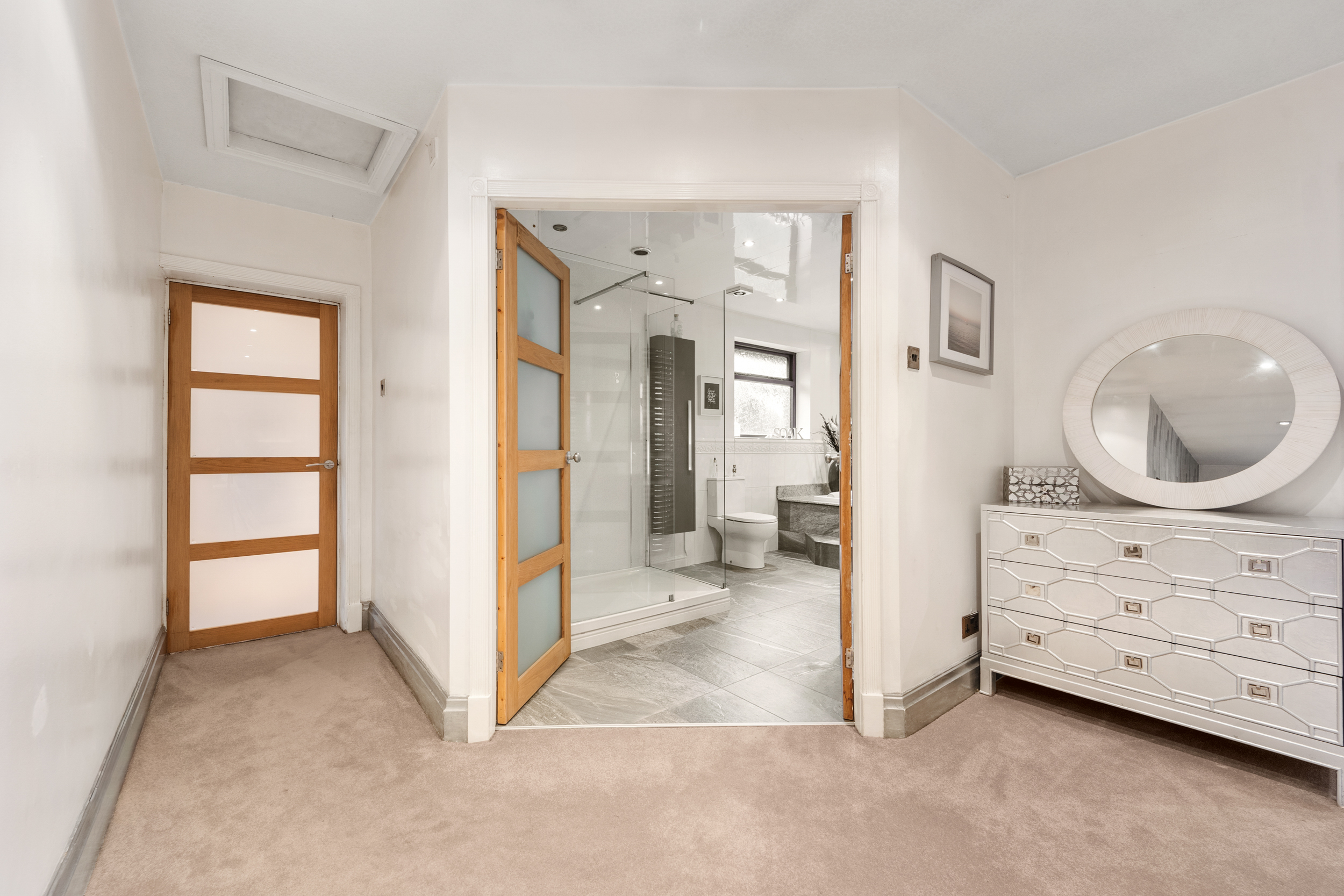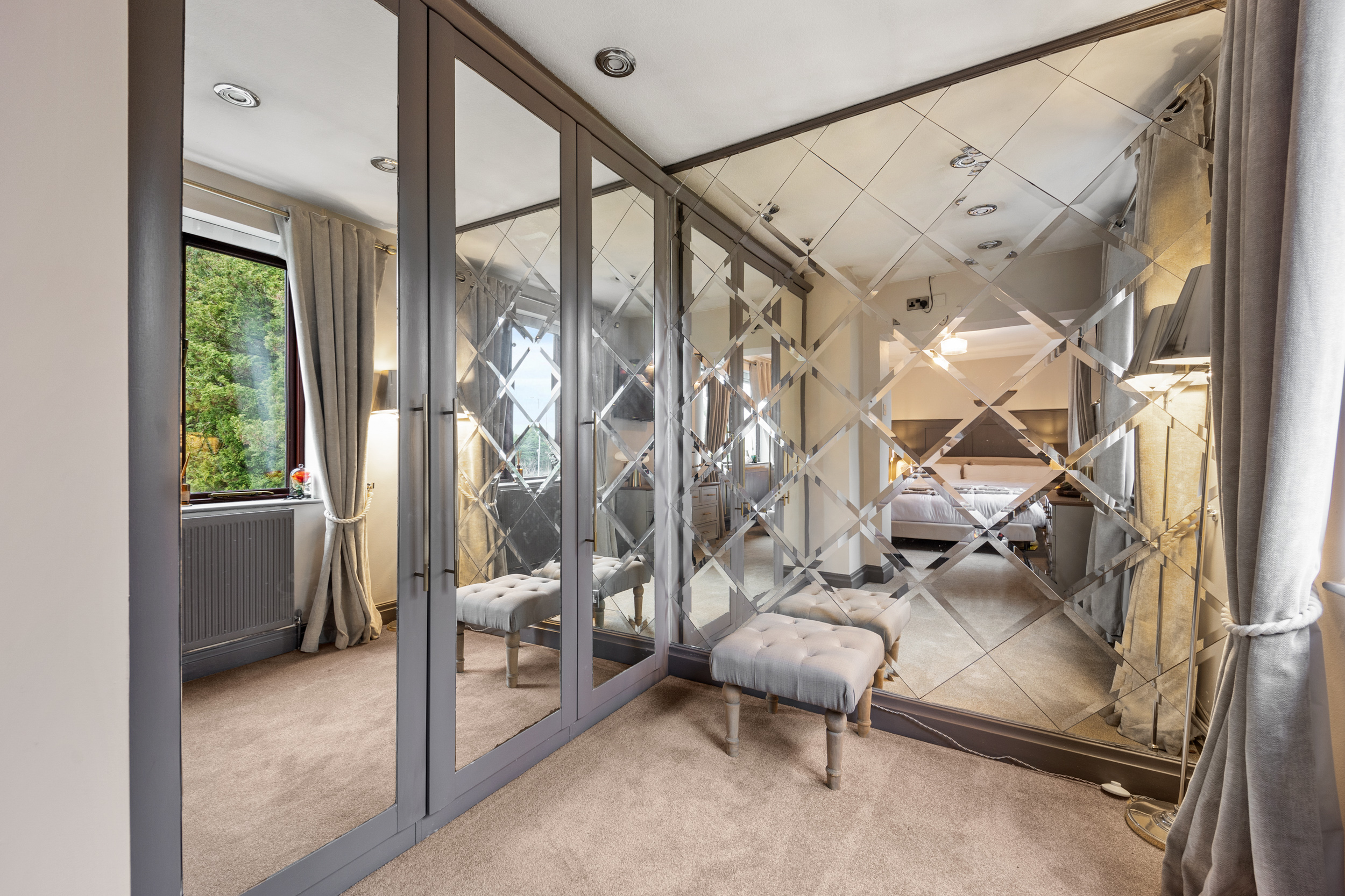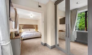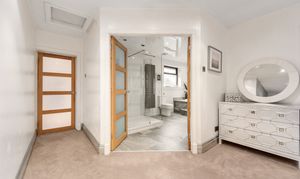 The principal suite is a true highlight, offering both scale and luxury. Generous proportions allow for a super-king arrangement with ease, while a feature wall and muted tones create a relaxed, boutique-hotel atmosphere. Flowing seamlessly from the bedroom is an impressive walk-in dressing room, fully fitted with open wardrobes, shelving, and display space, providing both practicality and a sense of indulgence rarely found in homes of this style. Beyond, the en suite has been beautifully refitted with contemporary tiling, a walk-in shower, floating vanity storage, sleek chrome fittings, and a bath, delivering a refined, spa-like retreat for everyday living.