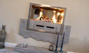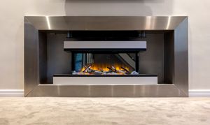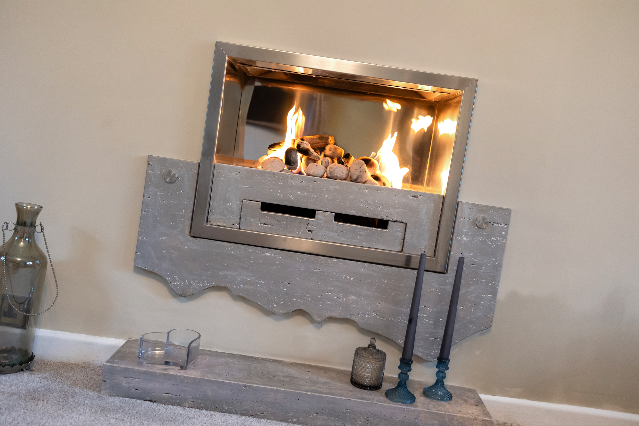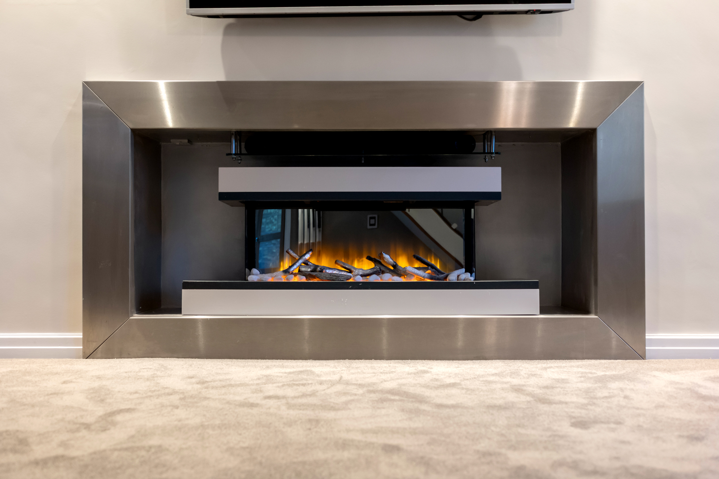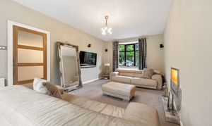 The main lounge centres around a contemporary inset electric fire framed by a bold metallic surround, creating a striking architectural focal point within this generously proportioned reception space. From here, an opening leads through to the sitting room, a more intimate and characterful retreat centred around an open gas fire, perfect for quieter evenings away from the main living area.