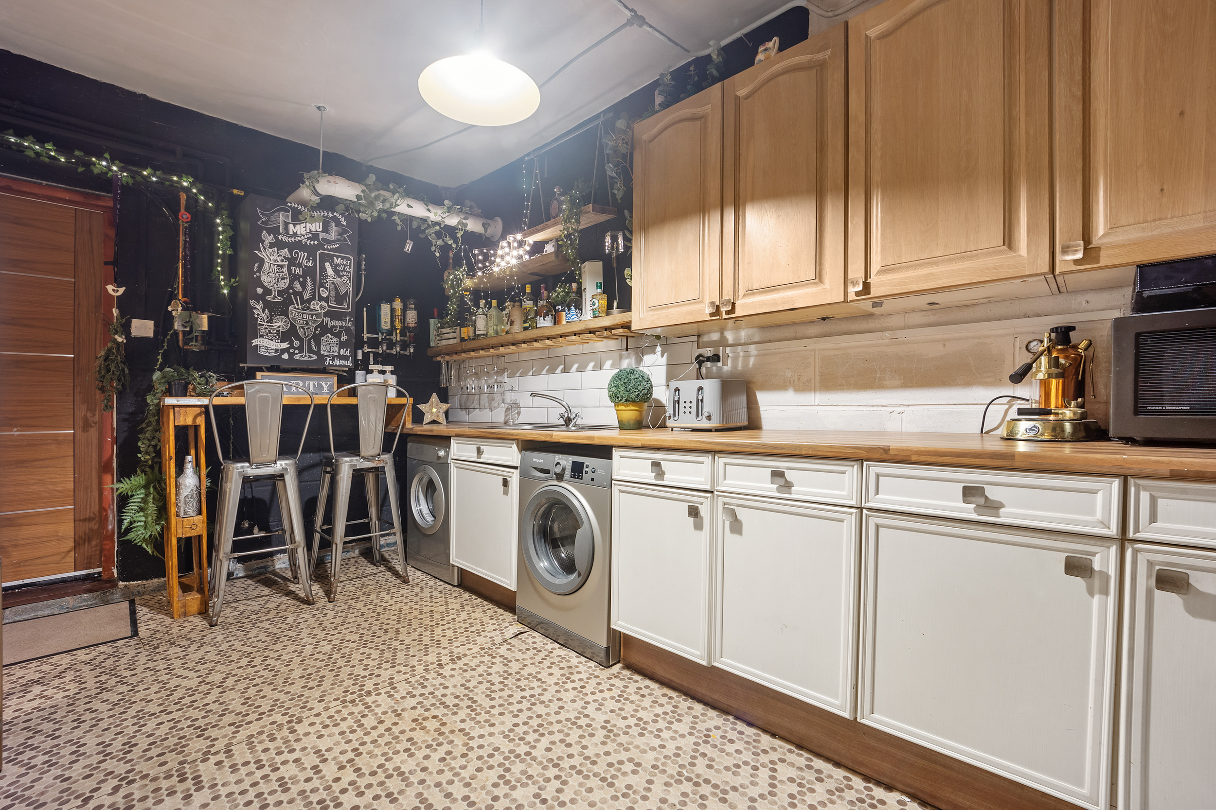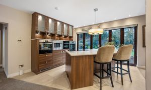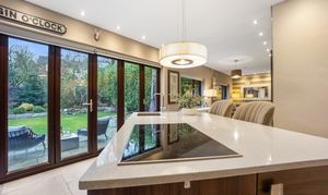 - Open-plan kitchen, dining and living space with sliding doors to the garden