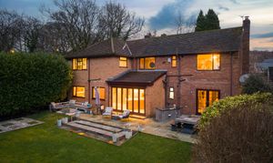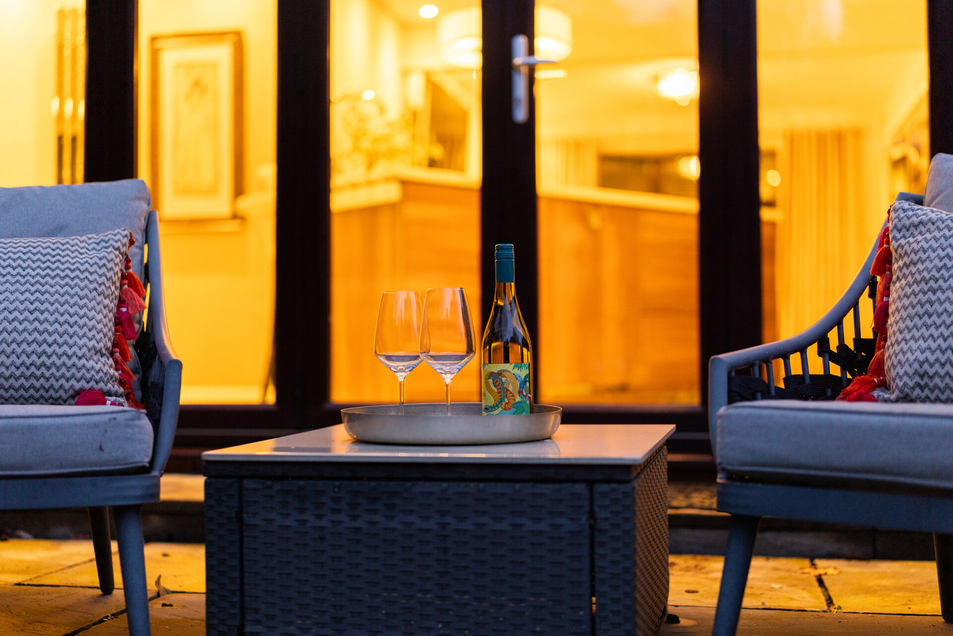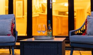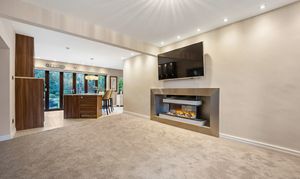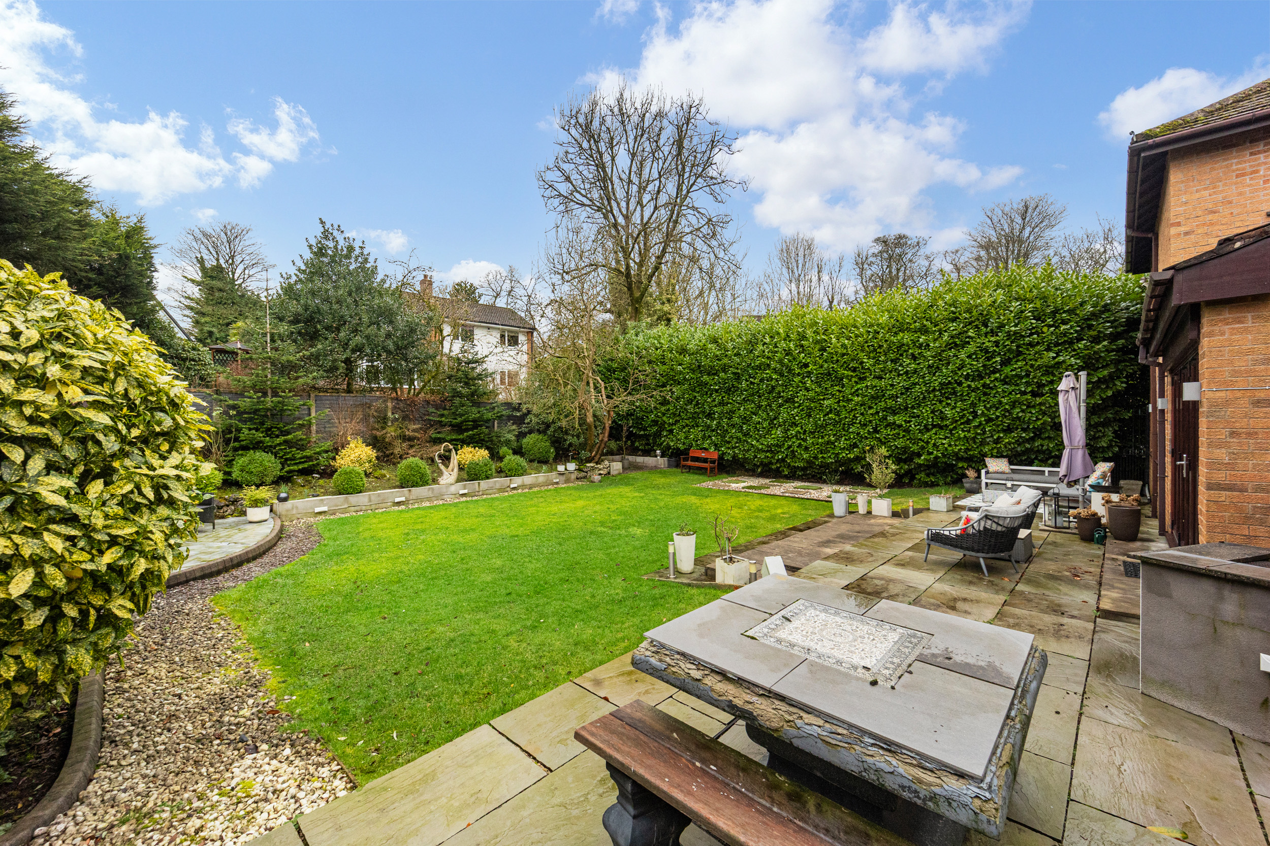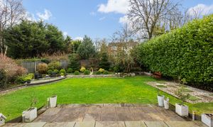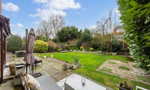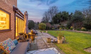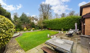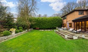 A generous stone terrace provides multiple seating areas, while the landscaped garden beyond offers a spacious lawn framed by mature hedging and established planting, creating a private and tranquil backdrop. Designed to balance style with practicality, the outdoor space feels both secluded and beautifully connected to the interior - ideal for hosting at dusk or simply unwinding during warmer months.