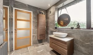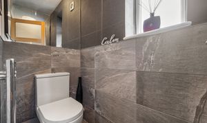 Serving this floor is a stylishly refitted family bathroom, finished with contemporary large-format tiling, sleek vanity storage, and a spacious walk-in shower, complemented by a separate WC for added convenience.