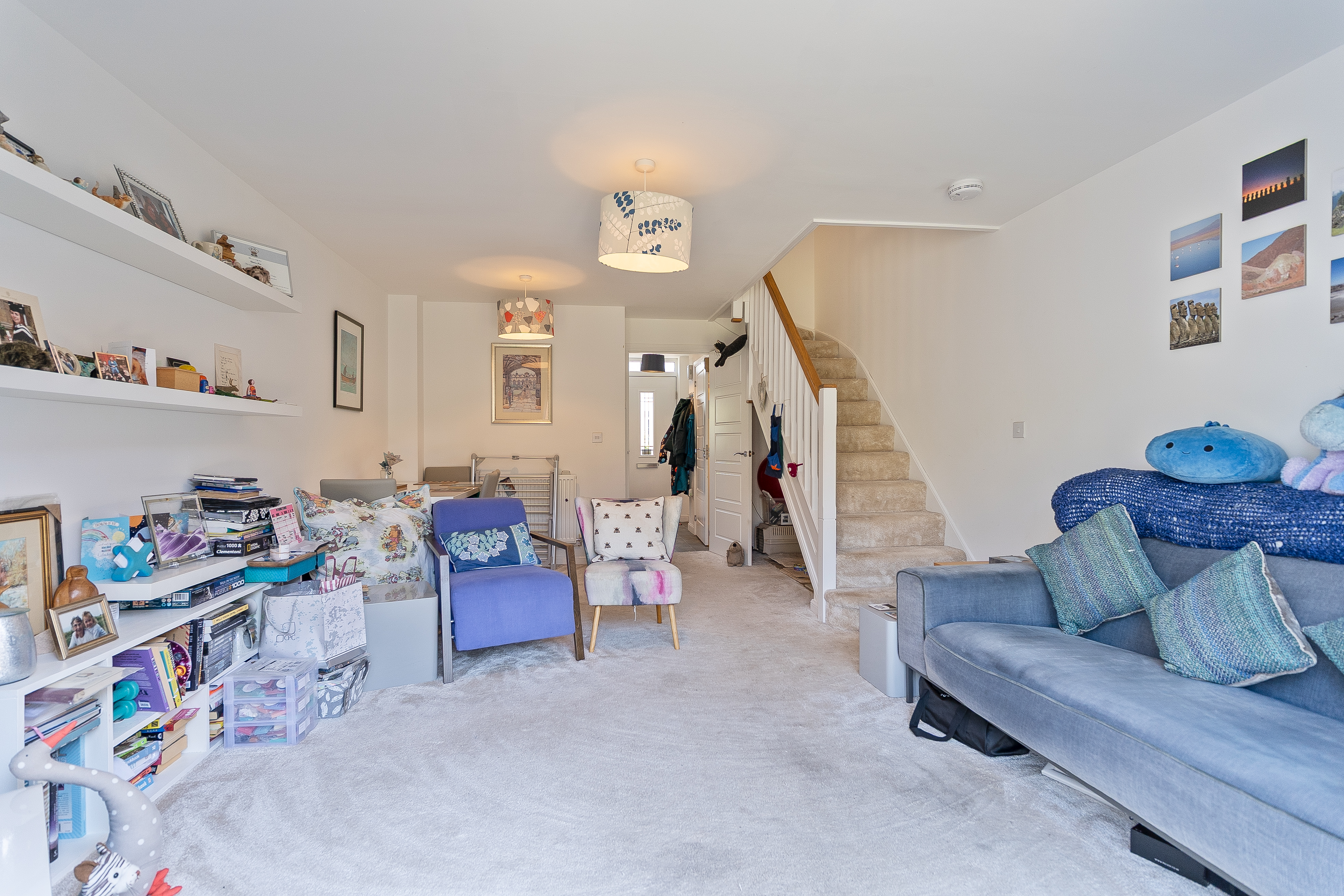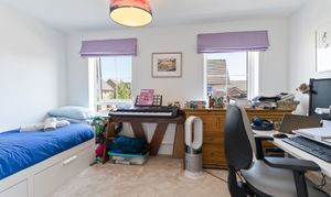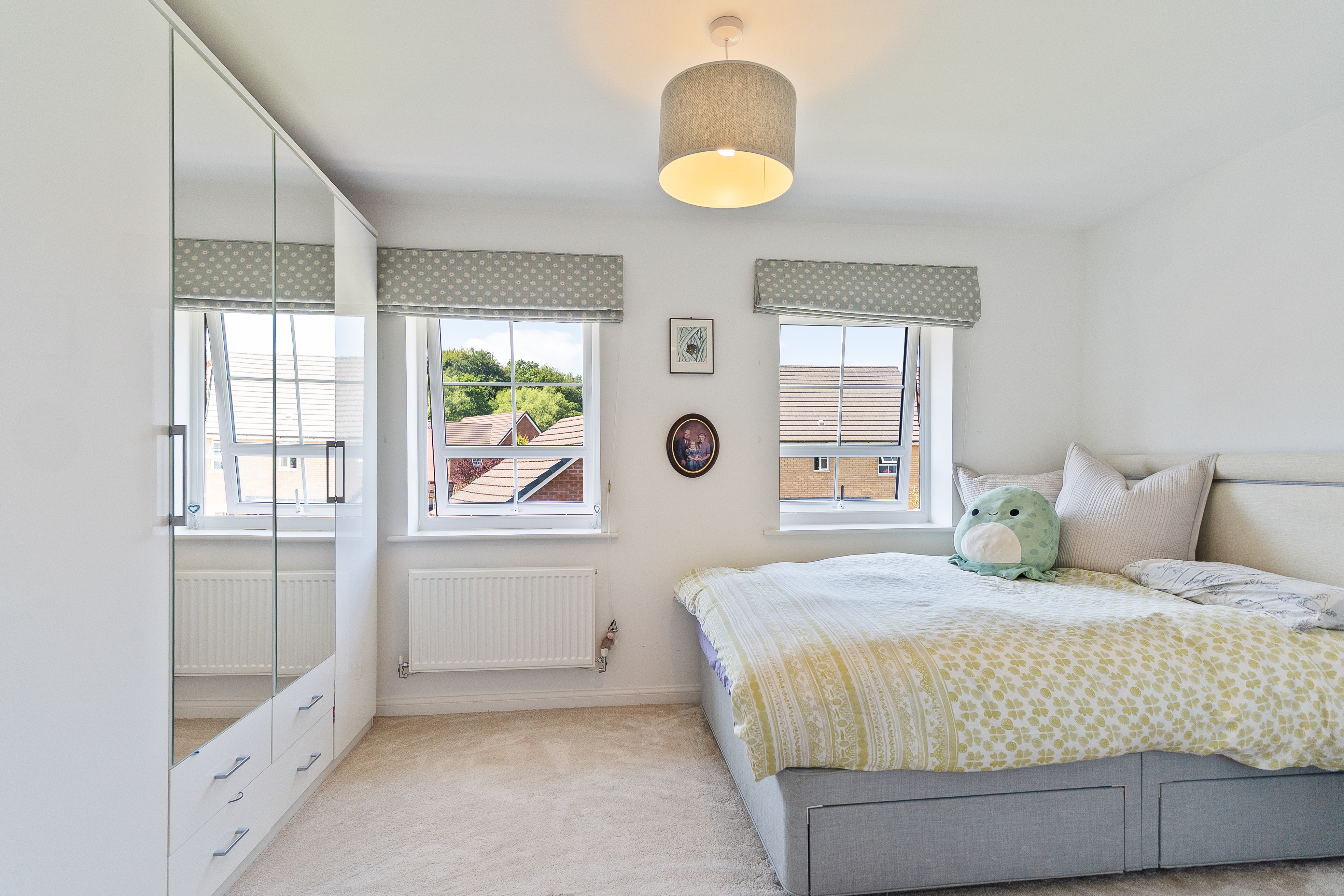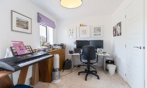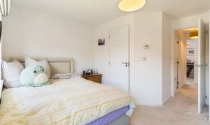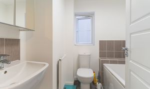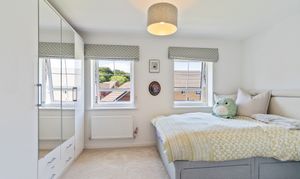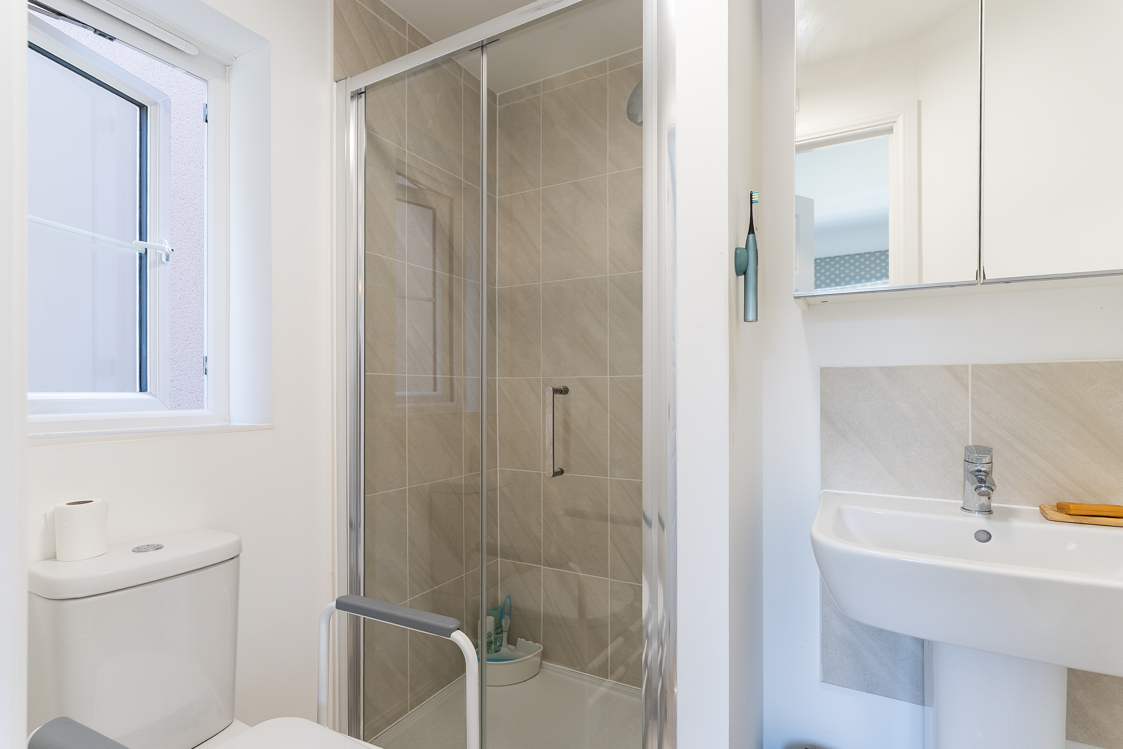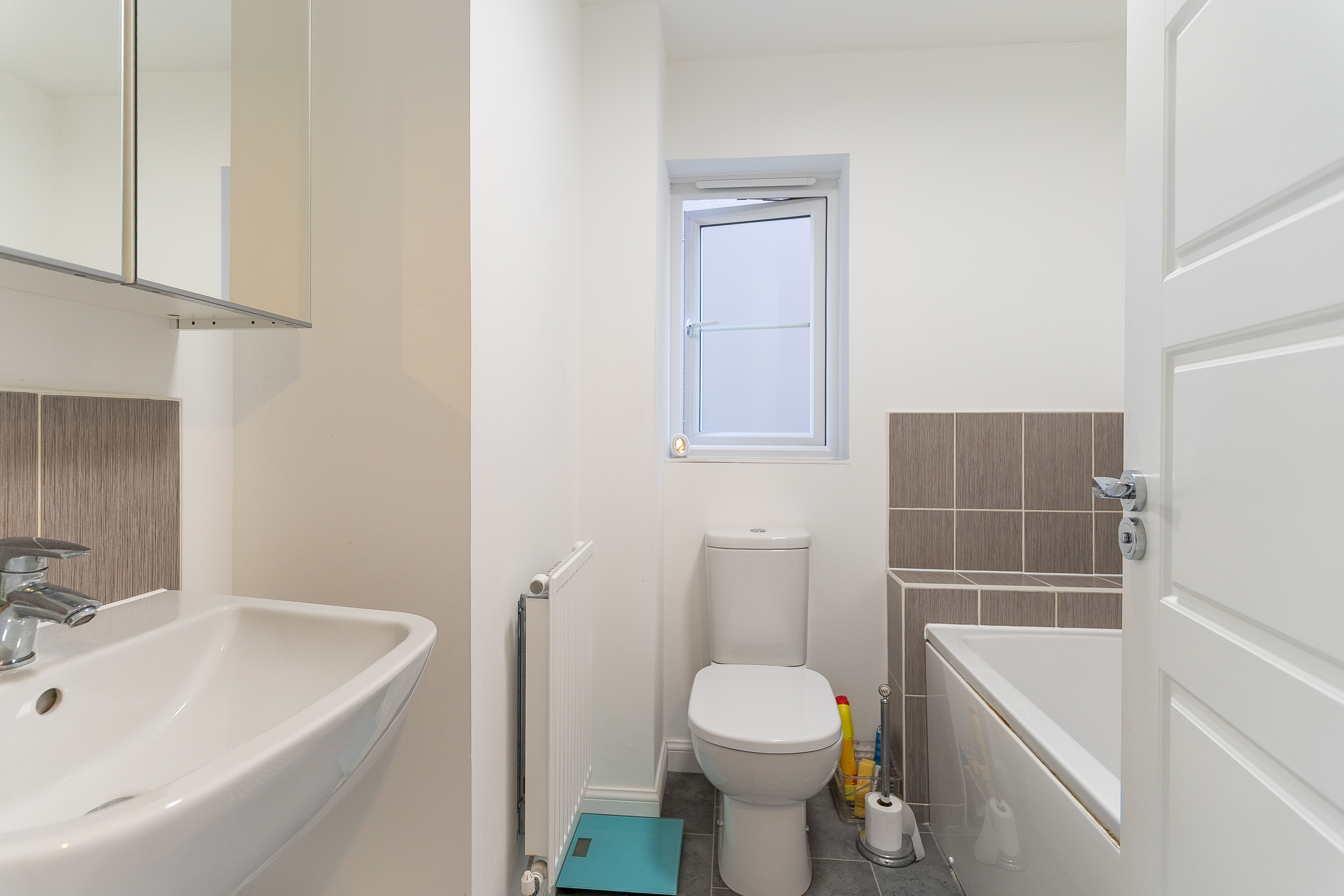 On the first floor, the home comprises two well-proportioned bedrooms and a modern family bathroom. The principal bedroom is a generous double and offers a contemporary en-suite shower room, while the second bedroom is also a large double room, ideal as a guest room, nursery or home office. The bathroom features a sleek, neutral three-piece suite including a full-sized bath, wash basin, and WC.