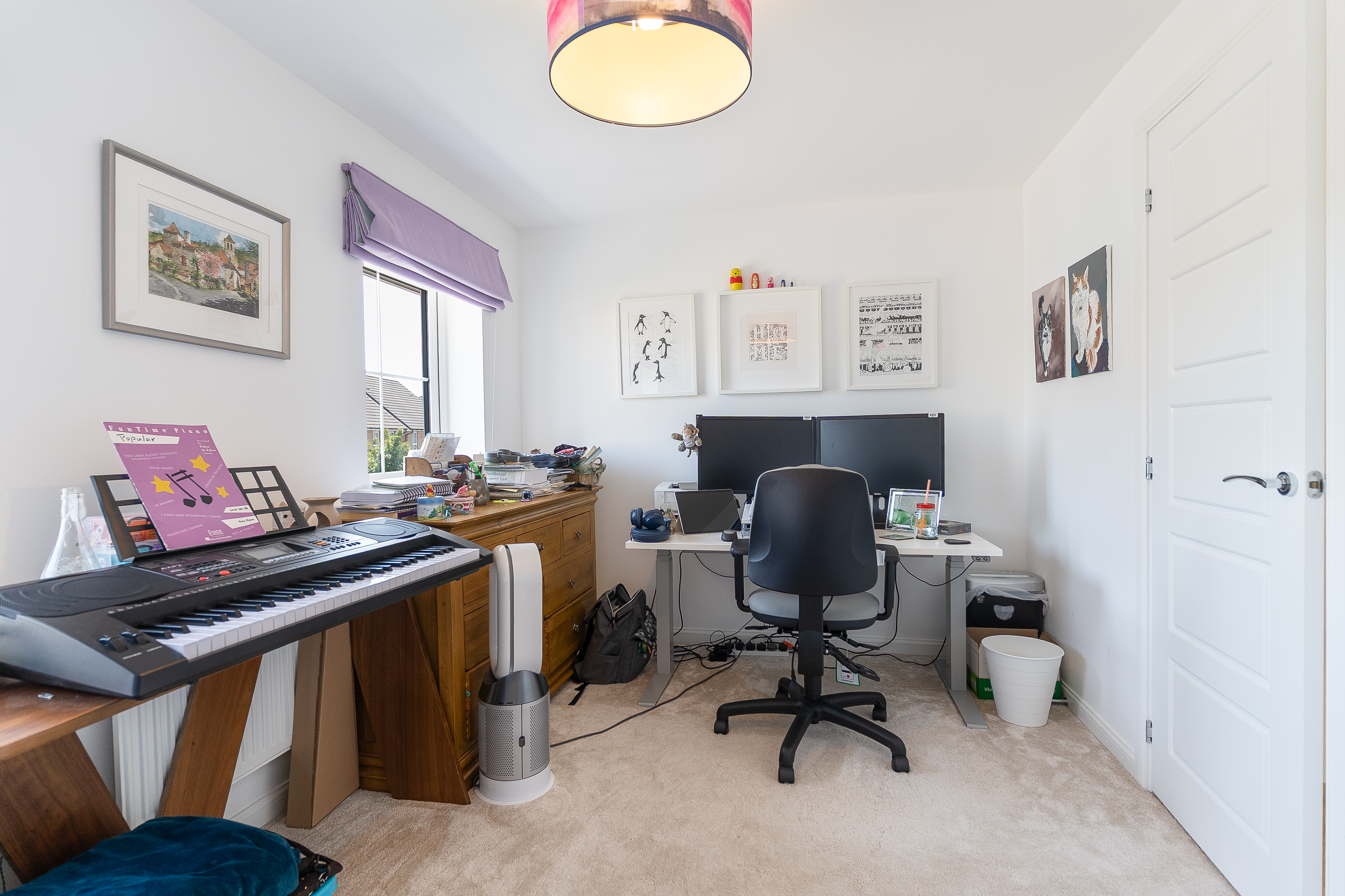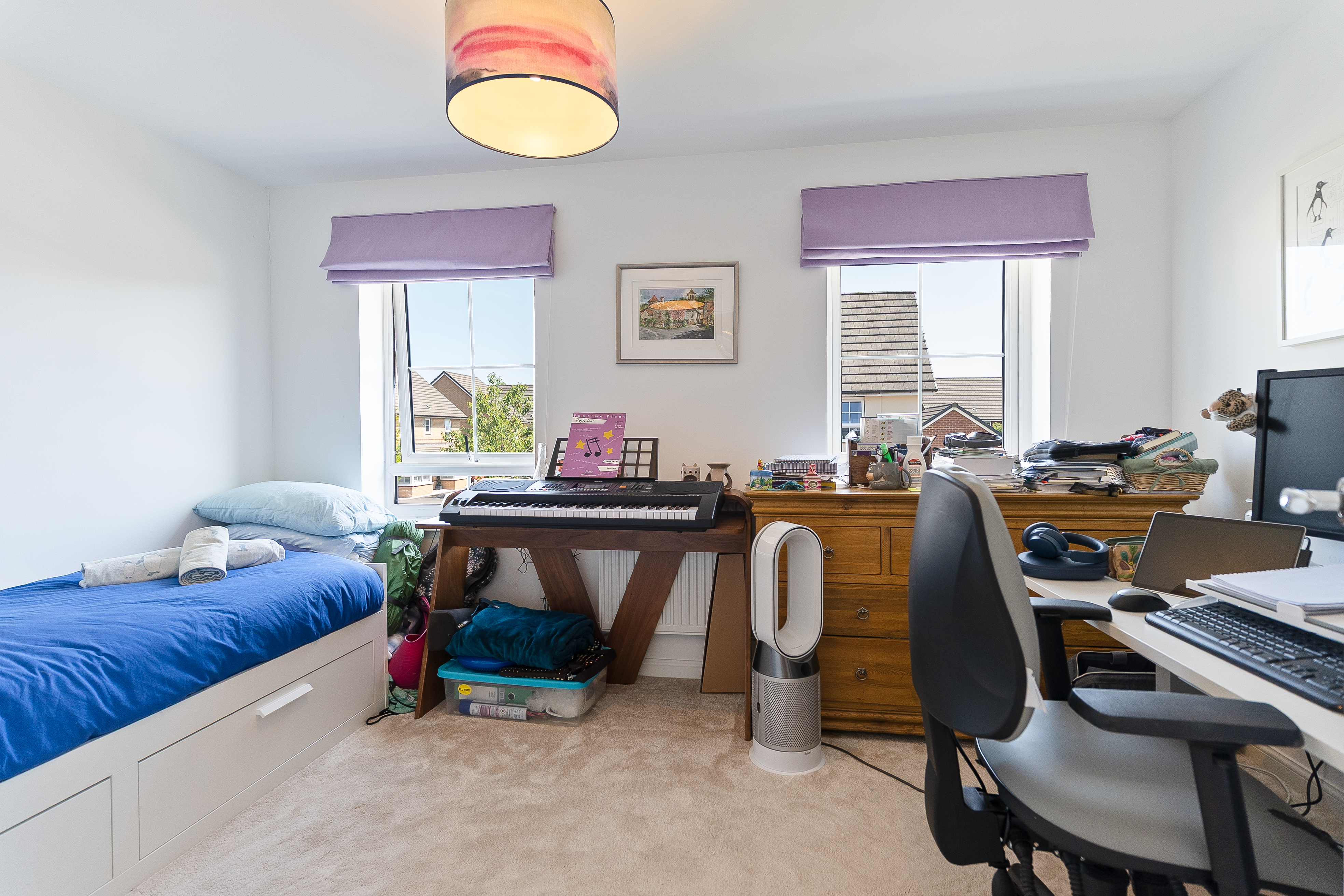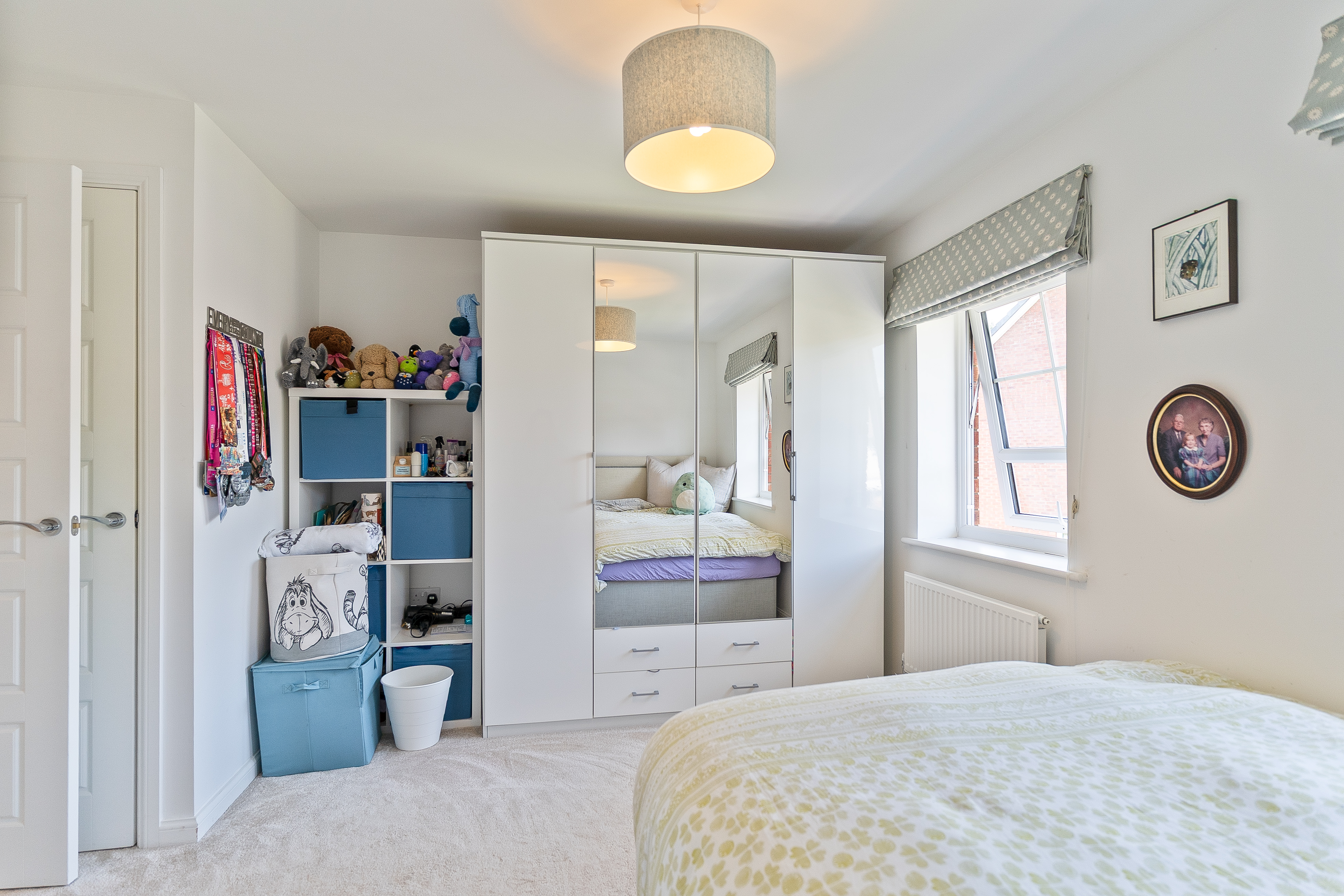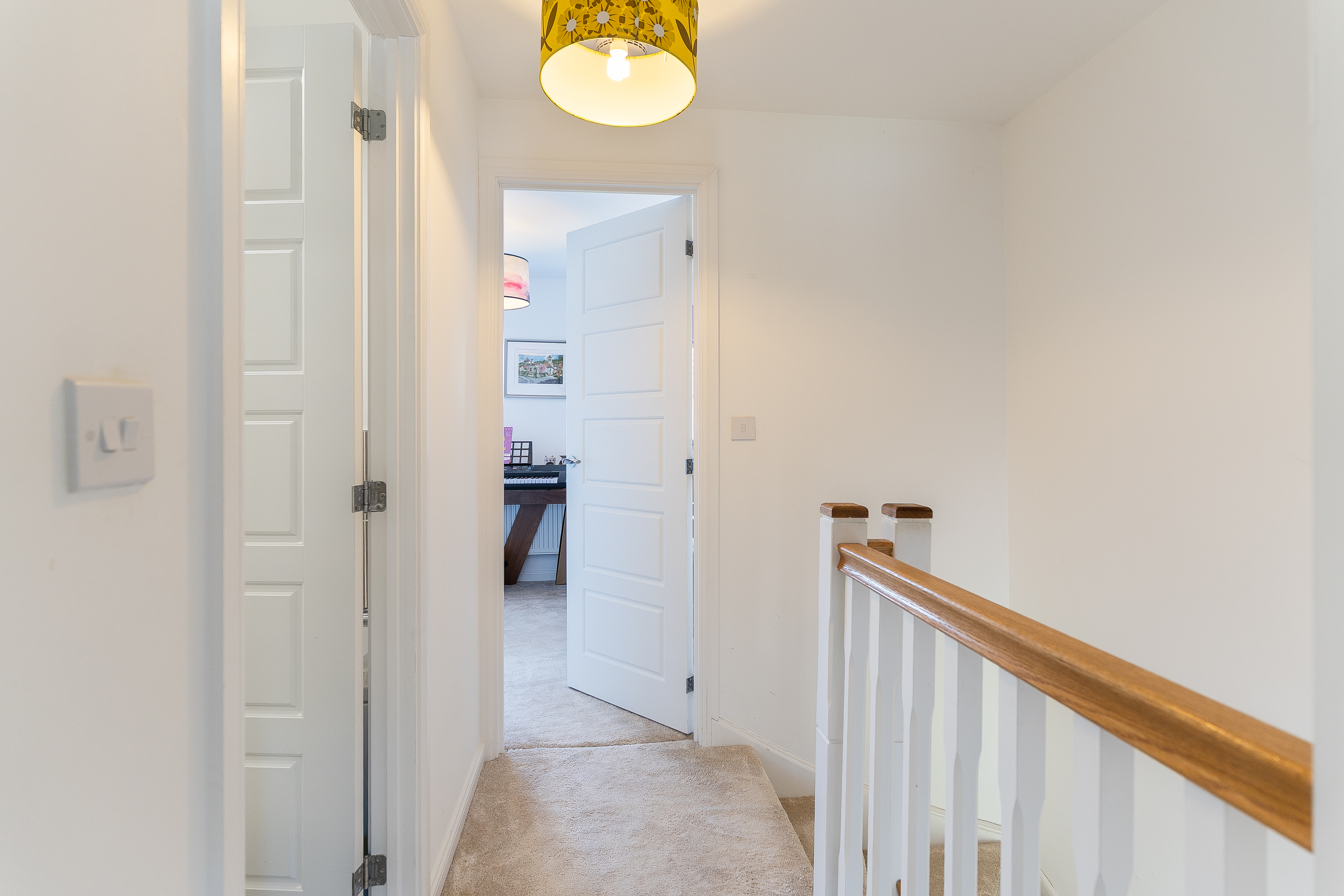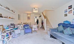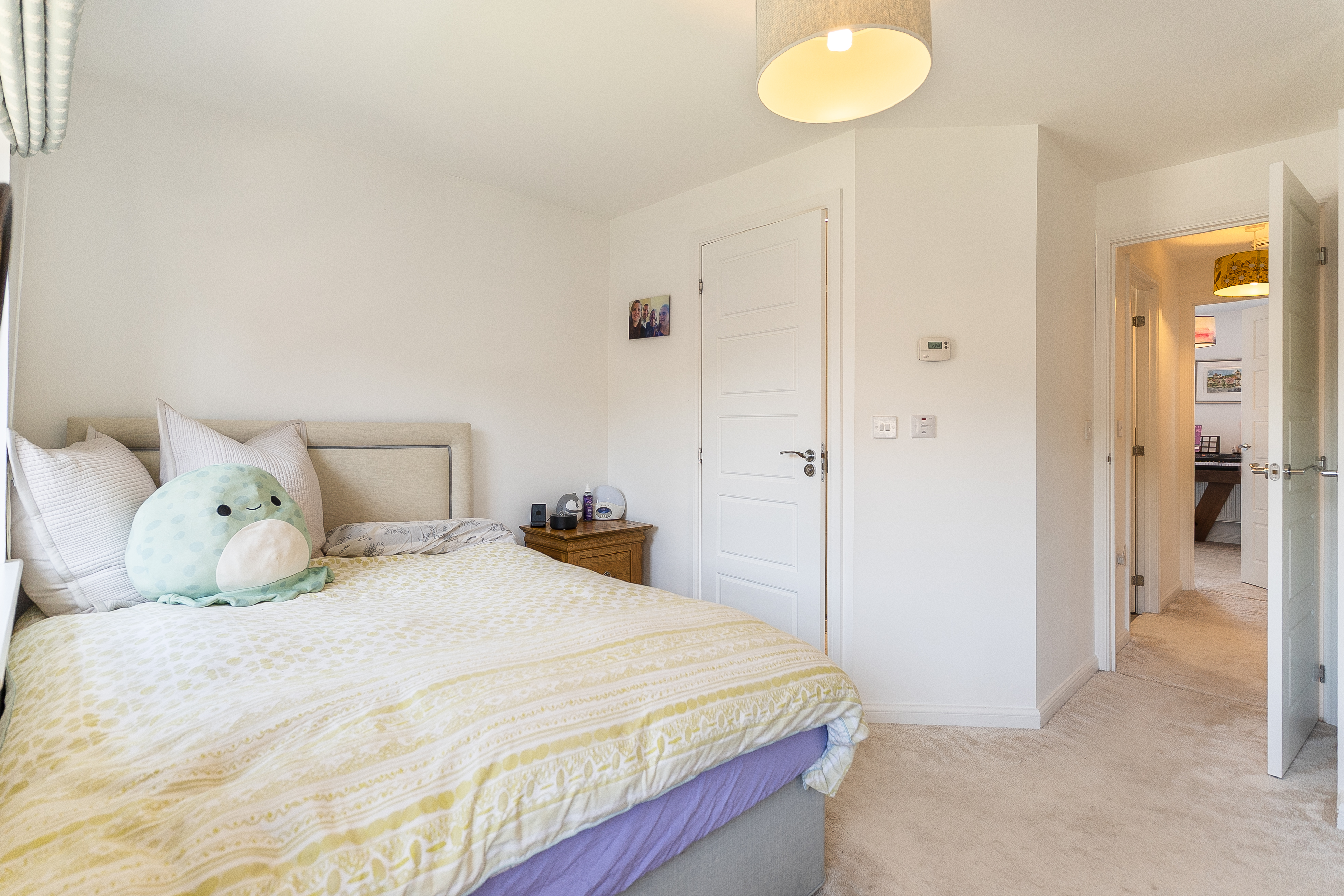On the first floor, the home comprises two well-proportioned bedrooms and a modern family bathroom. The principal bedroom is a generous double and offers a contemporary en-suite shower room, while the second bedroom is also a large double room, ideal as a guest room, nursery or home office. The bathroom features a sleek, neutral three-piece suite including a full-sized bath, wash basin, and WC.