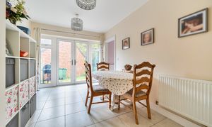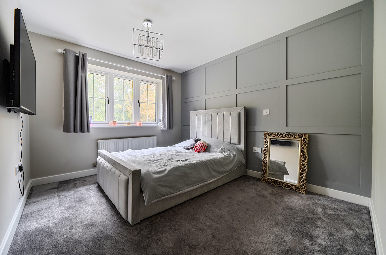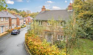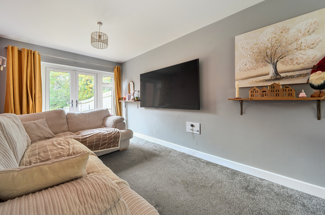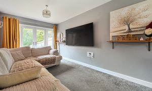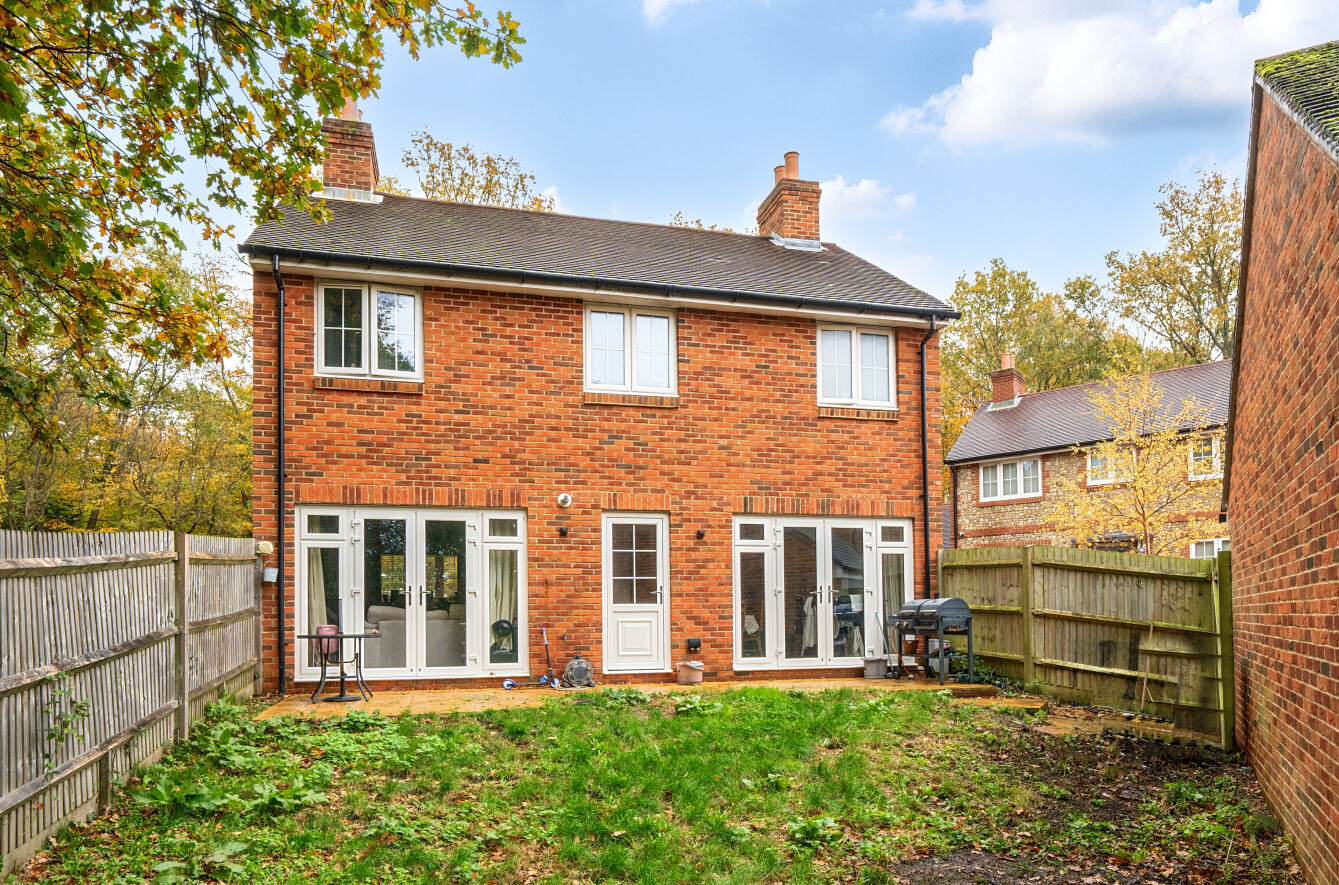Upstairs, the principal bedroom includes fitted wardrobes and a stylish en-suite shower room, with two further double bedrooms served by a modern family bathroom. The private rear garden provides a tranquil space for relaxation or entertaining with a patio seating area and lawn. The rear garden is adjacent to woodland., while a detached garage and tandem driveway offer ample parking.