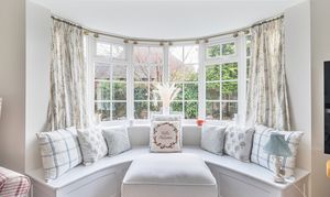 Bow window and gas log burner style heater fitted, archway through to the dining room
