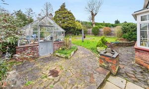 Set back from the road and approached via a sweeping driveway, double wrought iron gates open up to hard standing parking and turning space, with adjacent lawned gardens, mature planting and timber panel fencing and brick walling to the boundaries. The front garden includes a wealth of mature planting and trees with access to the main property and adjoining garage.