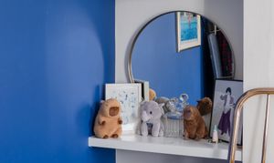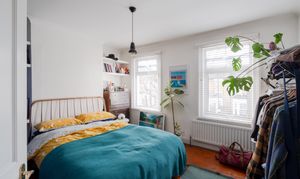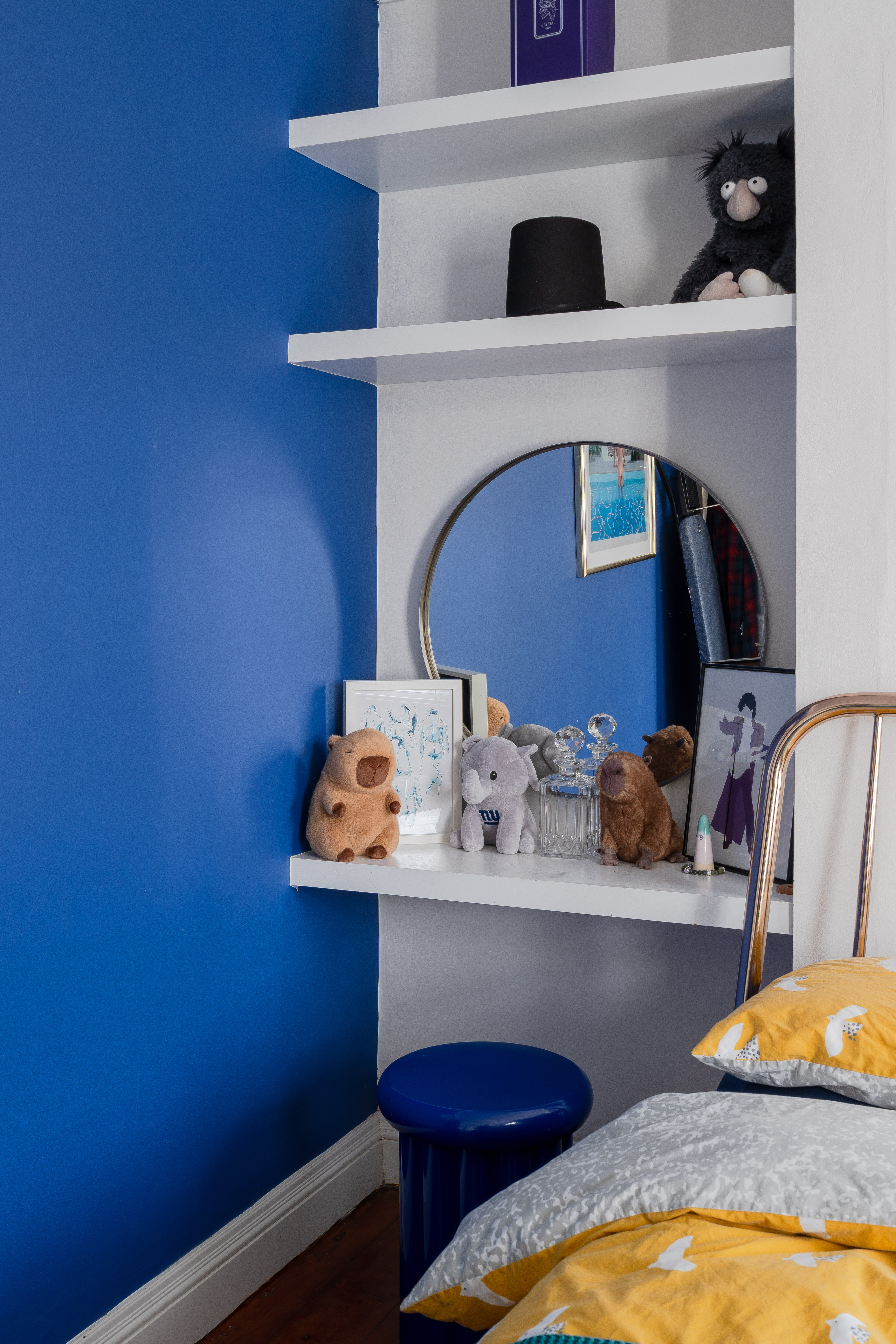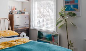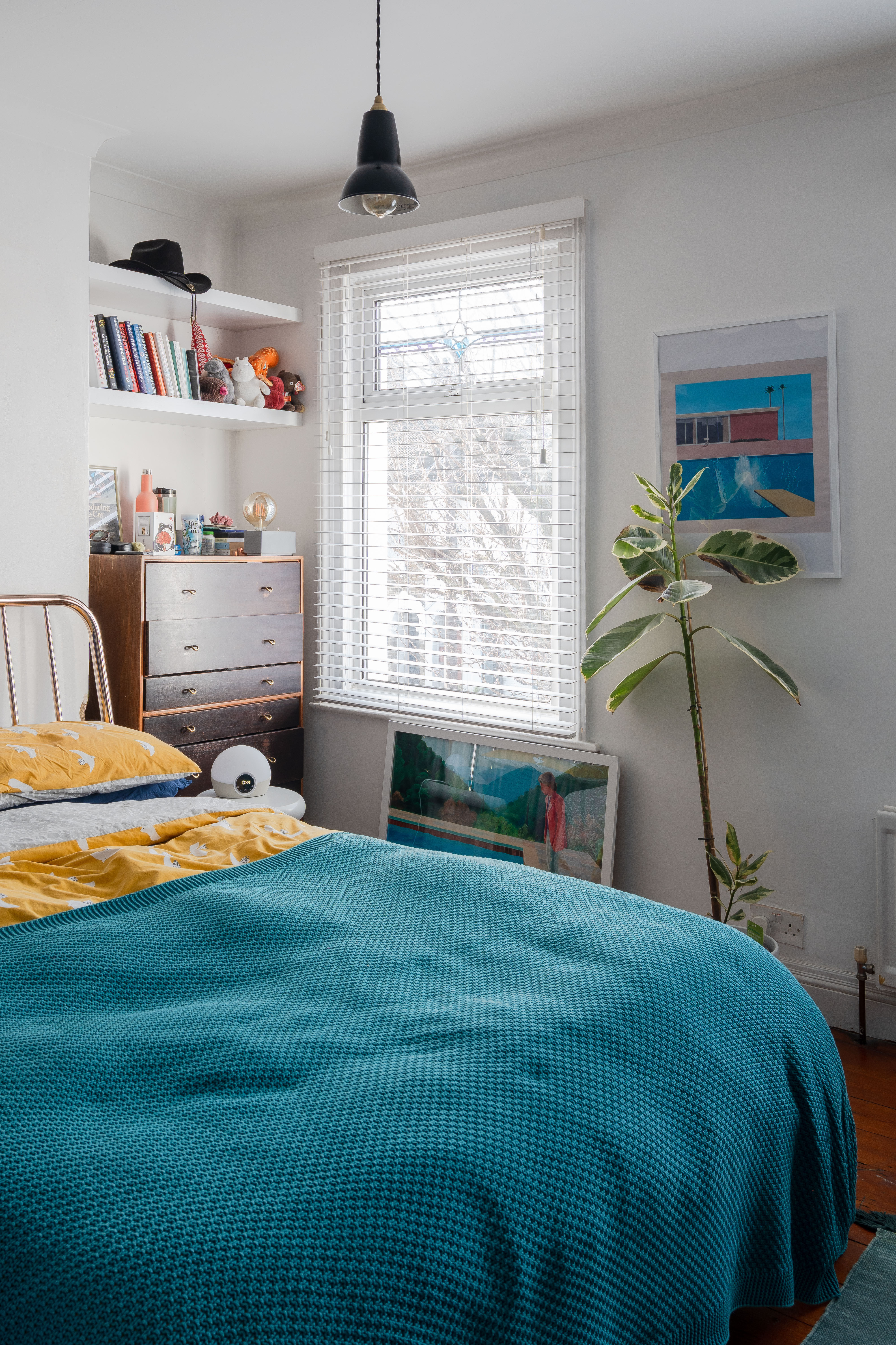 To the front, the primary double bedroom features stained wooden floorboards and white coved walls with bold blue accent paintwork, lending a fresh, contemporary feel. A stylish black pendant light with a shade hangs from the ceiling, and built-in alcove shelving provides handy storage and display space. Double windows to the front, dressed with Venetian blinds, draw in the sunshine, lifting the mood.