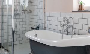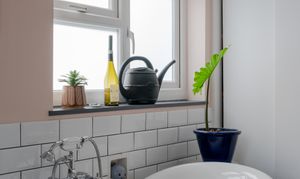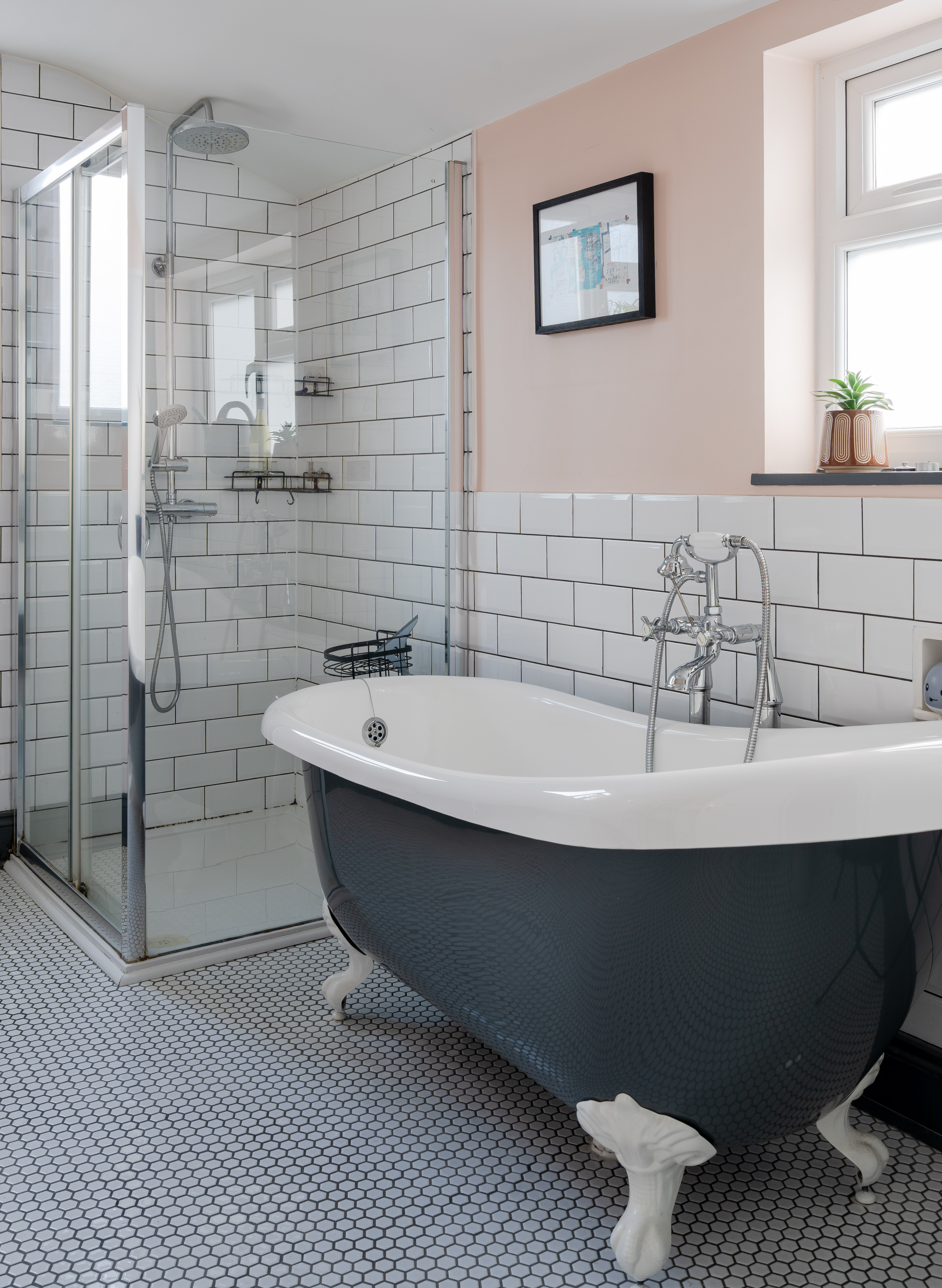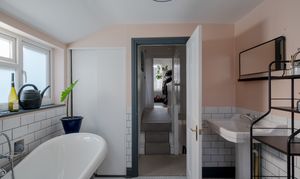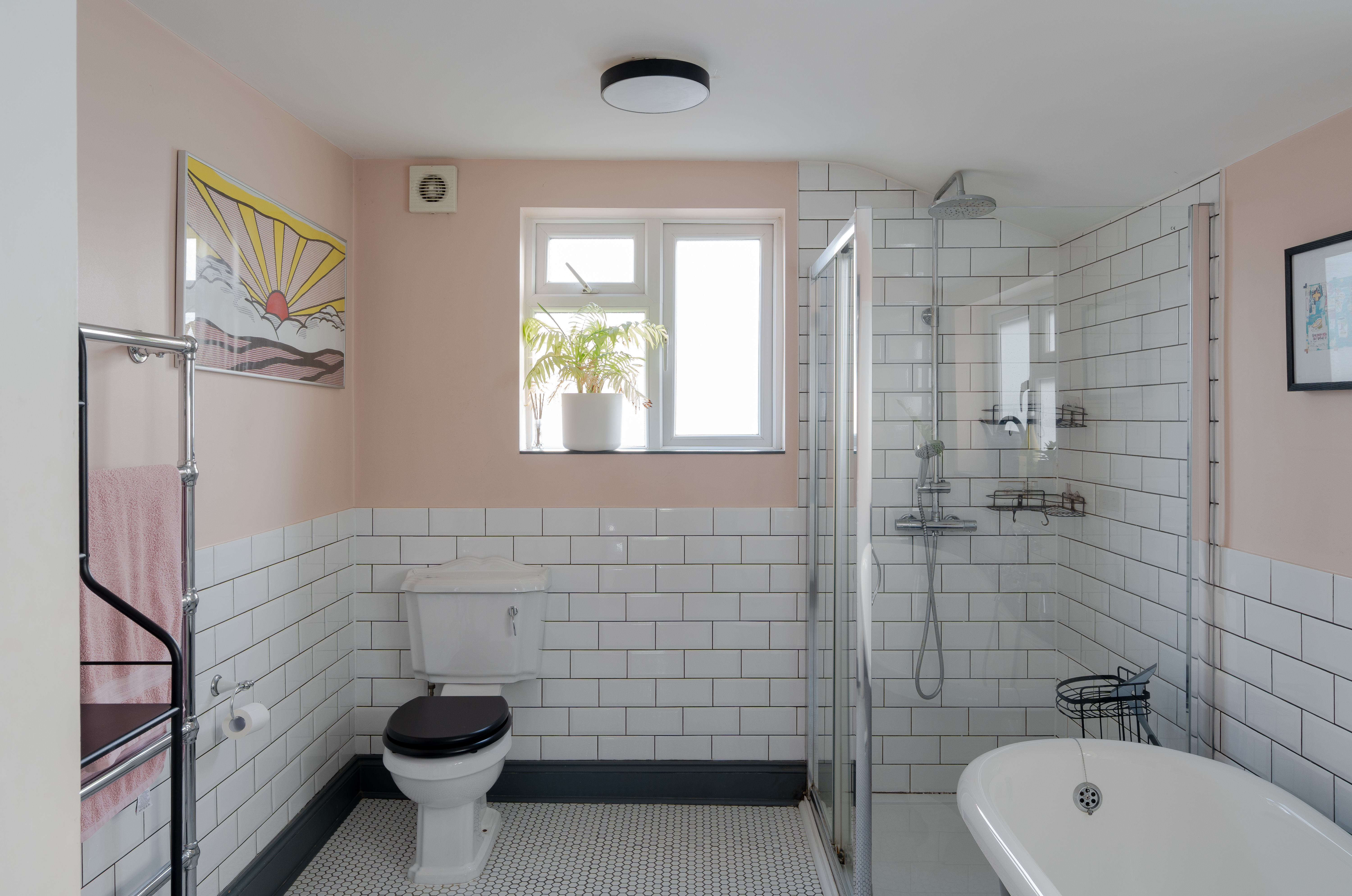 Lit by a modern light and dual-aspect windows for ventilation, the family bathroom is beautifully finished, blending period style with modern comfort. Warm peach walls complement a white metro-tiled splashback with contrasting grout, echoing the charming beehive floor tiles. A wide walk-in rainfall shower enclosure offers everyday convenience, with luxury provided by a stunning roll-top, claw-footed monochrome bathtub – complete with central freestanding Victorian taps and a shower attachment.