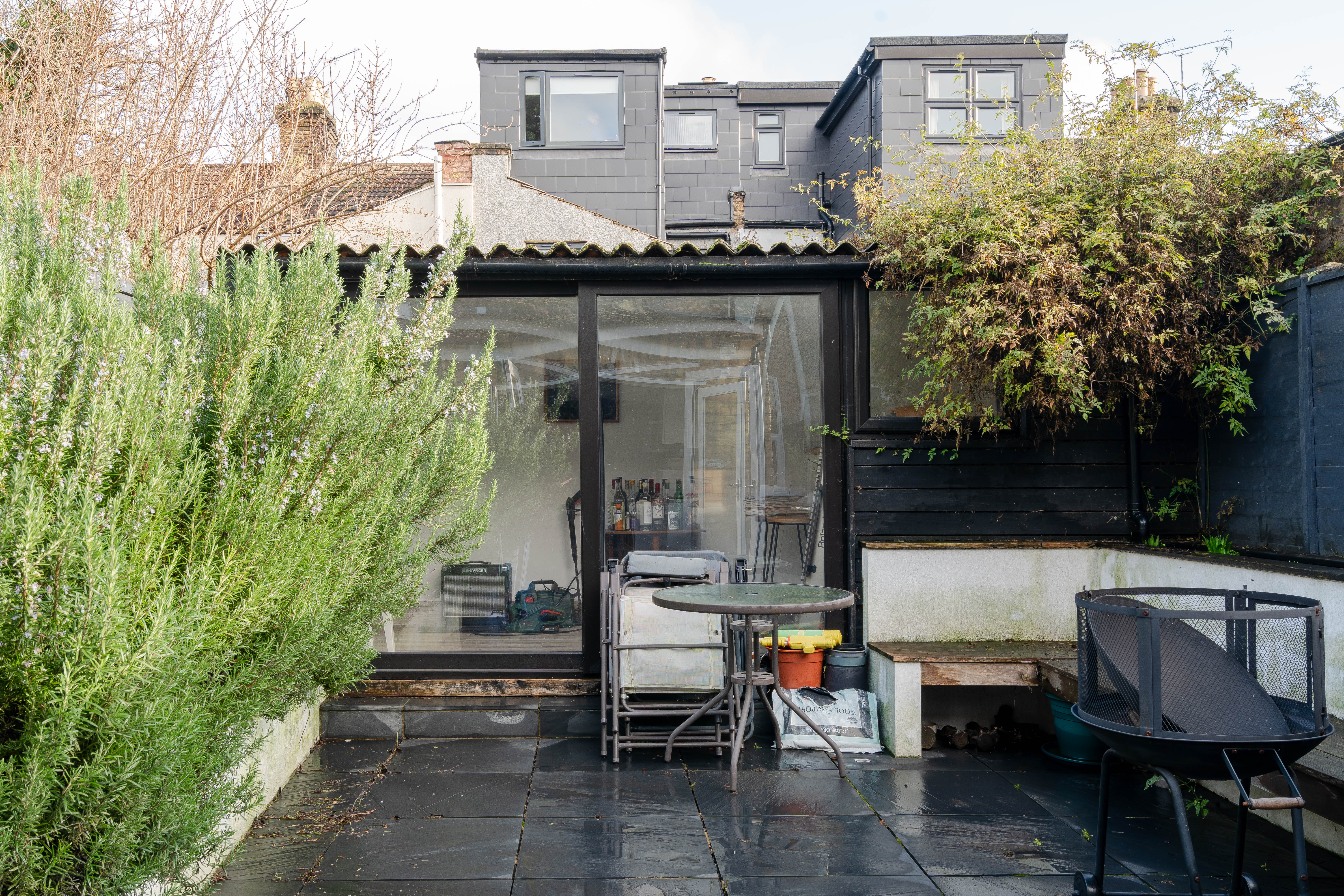 The low-maintenance rear garden has a smart courtyard feel, laid with dark paving slabs and enclosed by painted timber fencing. Built-in seating offers a ready-made spot for relaxing, while flower borders planted with fragrant rosemary bushes bring scent and greenery. A useful side passage provides additional storage space or could serve as a small herb garden.
