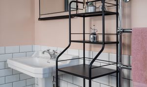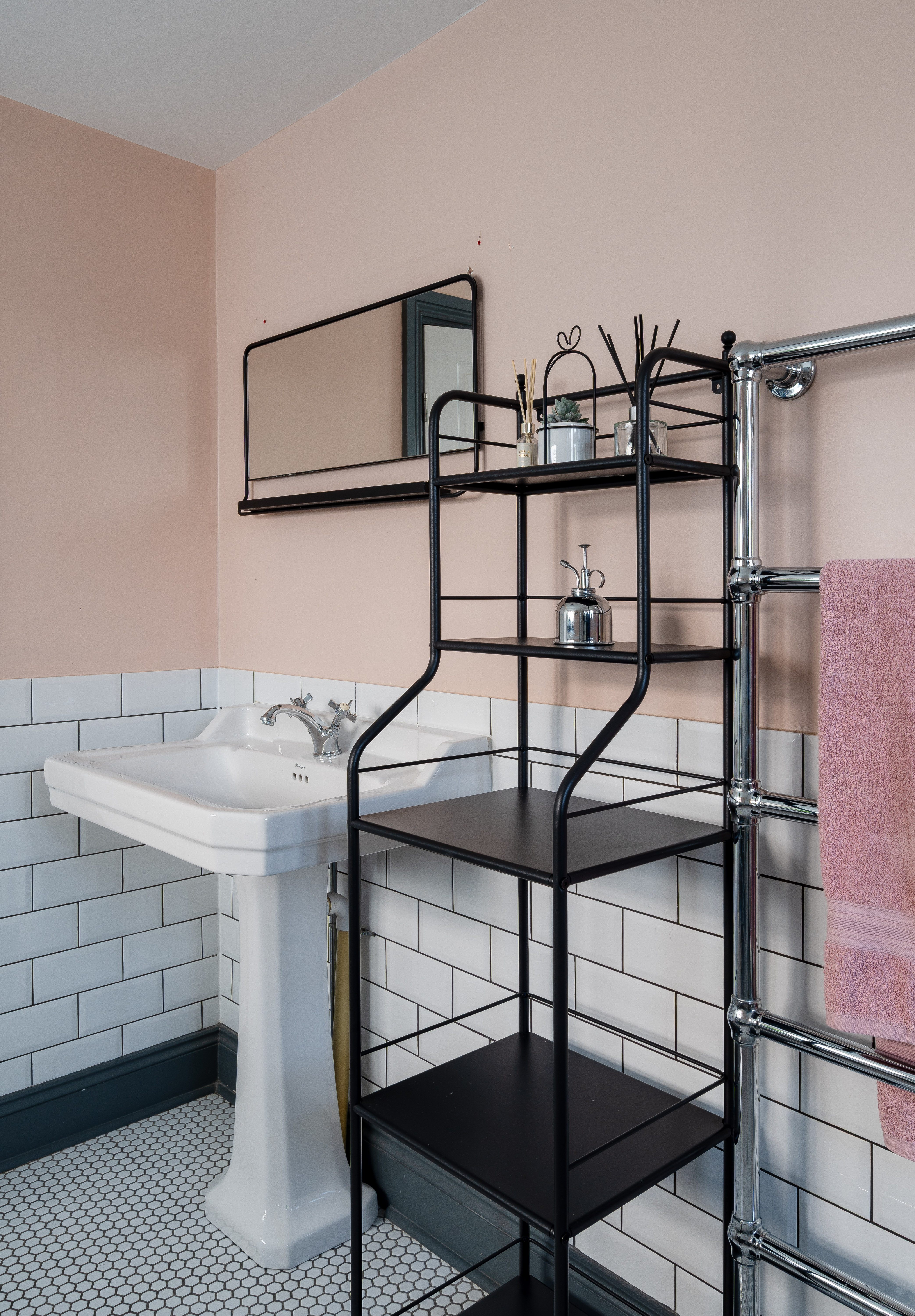 Period details continue with a chrome heated towel rail, a pedestal basin with traditional tapware, and a black-and-white close-coupled toilet. You’ll also find a handy cupboard with sliding doors for storing away toiletries.